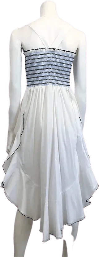 Contemporary designer, new with tags never worn. Size S on label. Open slit on both sides. Apron style dress with criss cross straps in the back.