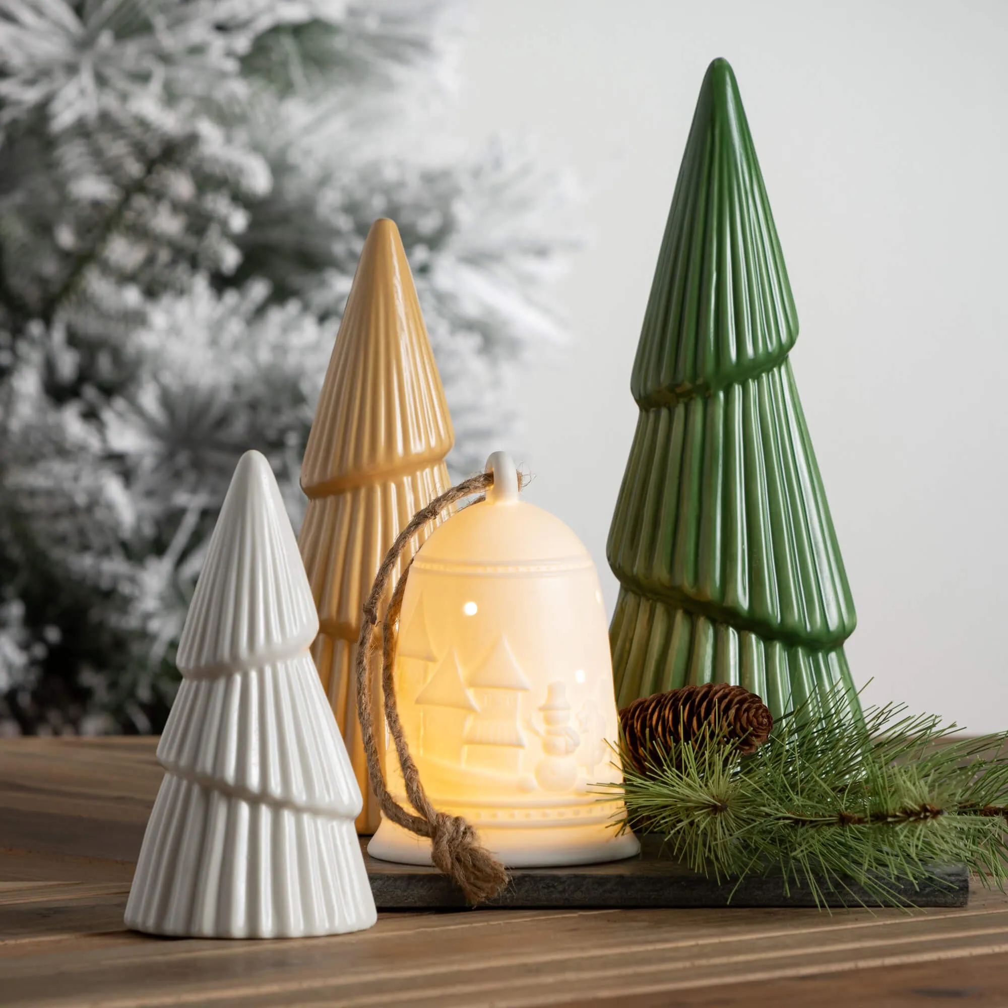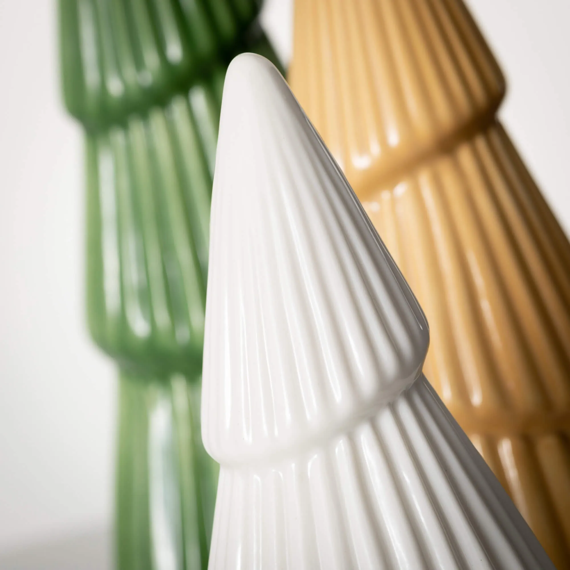 Decorate your home this holiday season with this classic 3-piece ceramic mini Christmas tree set. These charming decorative sculptures feature three white, gold and green ceramic textured tress in various sizes. Place them on a mantle to bring the Christmas spirit right to your home.