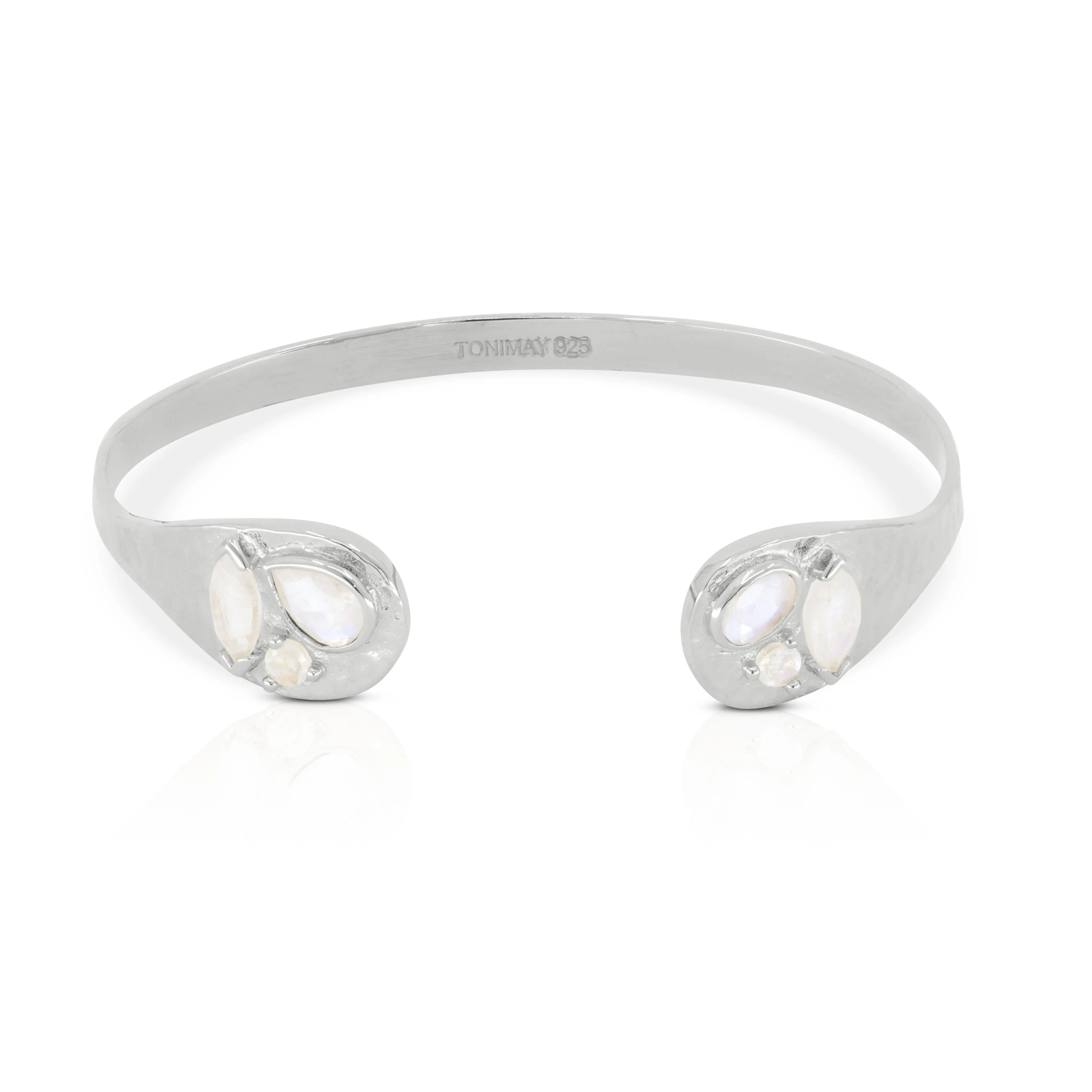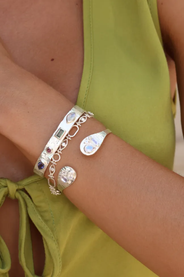 The Alessia Moonstone Cuff features 6 stunning hand cut Moonstones and a lightly textured hammered finish to the cuff which is designed to wear open at the top of the wrist.