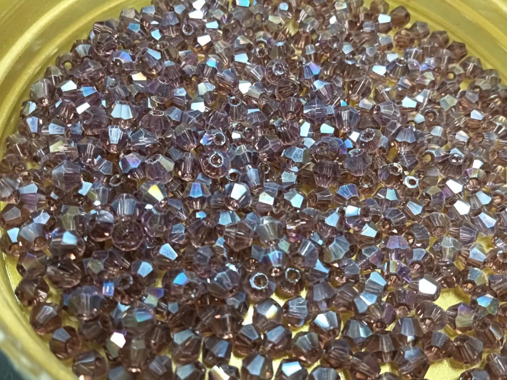 Crystals beads are made from glass which is cut to form multiple facets and designs. Bicone crystal beads are also called new cut beads. These crystal beads are fire-polished to give extra shine and without any sharp or pointed edges. The faces of the bead reflect a large amount of light which in turn creates a magical sparkling effect. Bicone beads are impeccably faceted for maximum reflection and unforgettable sparkle. Each bead features a crystal clear hole with smooth edges to help protect the stringing material. Highest quality glass is used in production, which is pressed in a mold, then precisely faceted by machine and polished in a direct fire. The advantage of a fire polishing technique is a softer, gentler appearance to these scratch resistant beads.