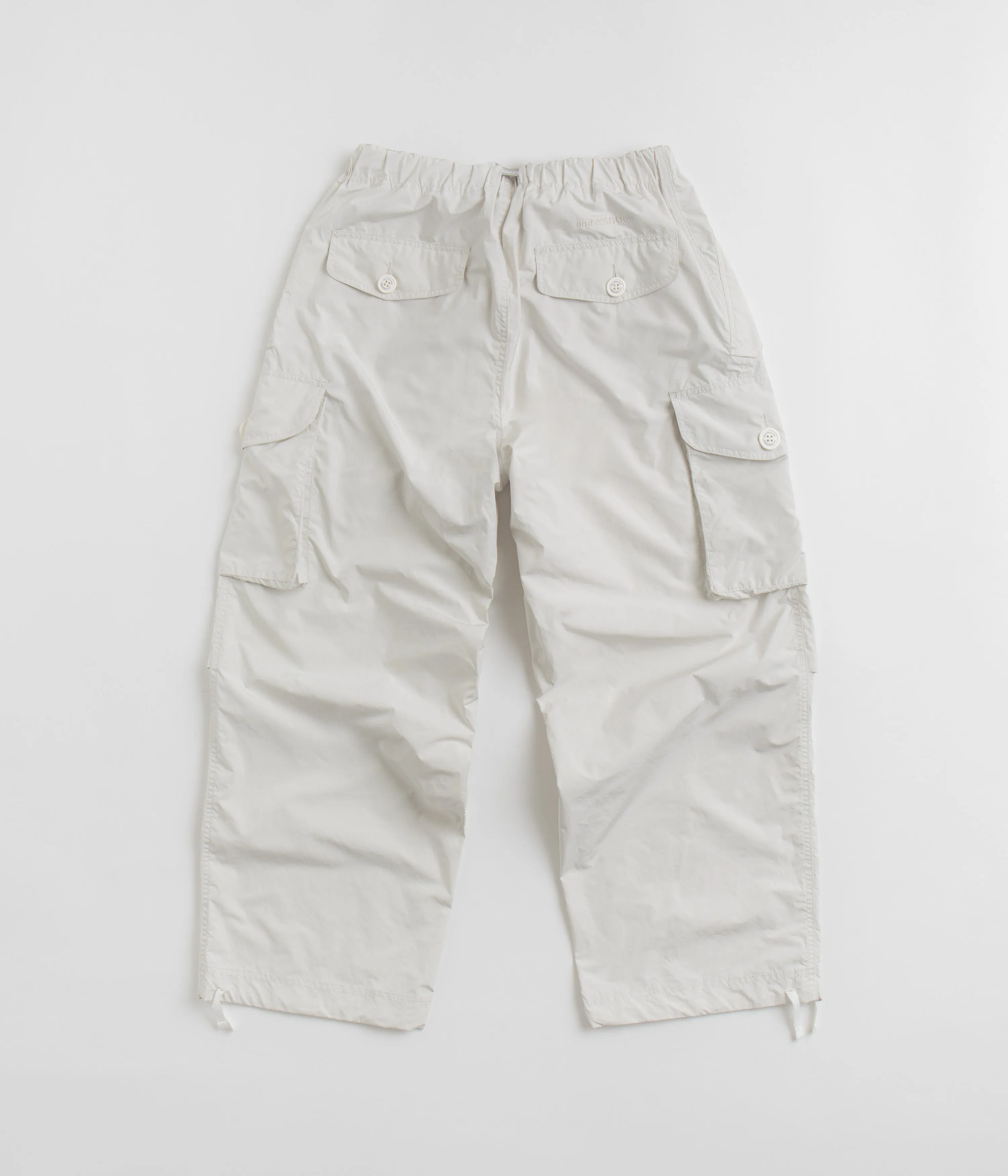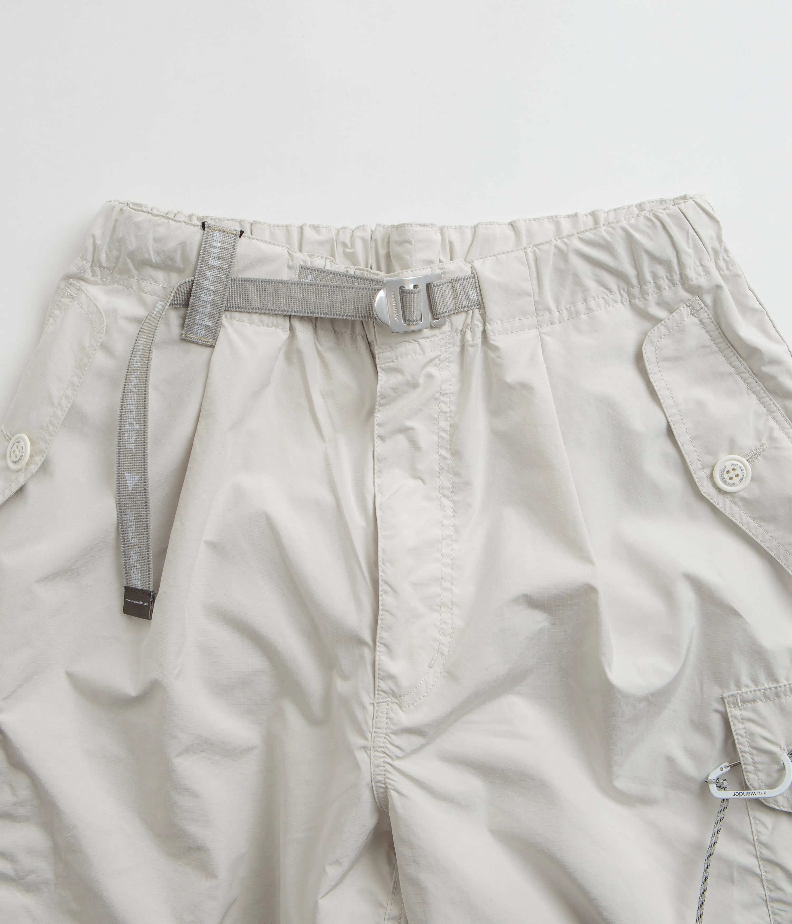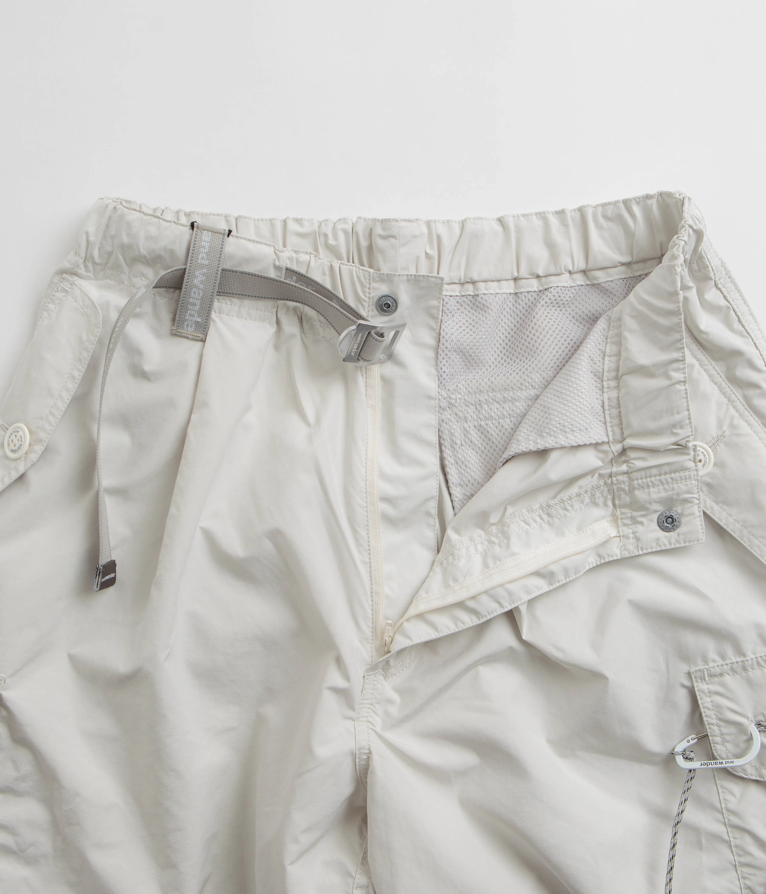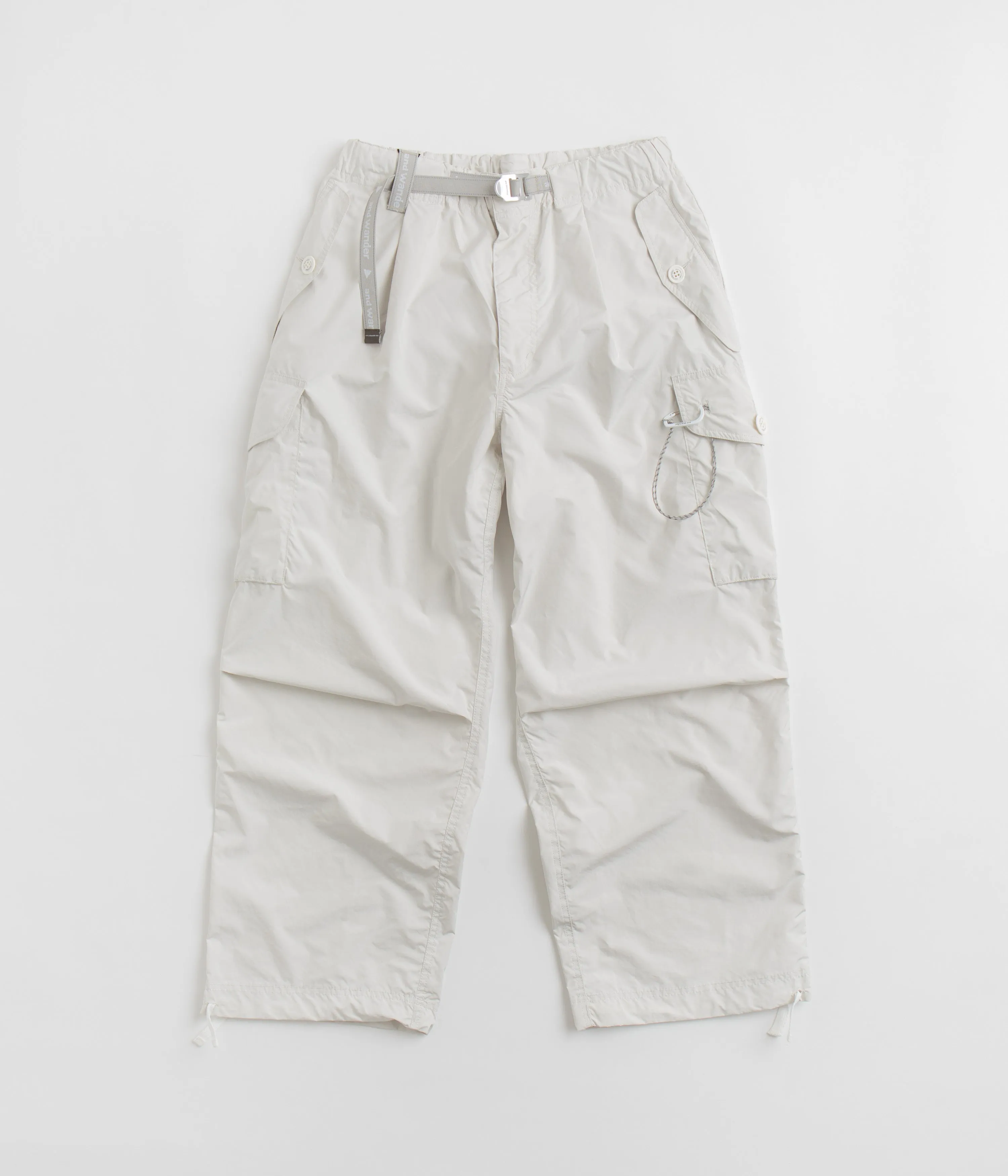 and wander Oversized Cargo Pants in Off White. Designed with a DWR shell and a split-yarn dye, these loose fitting and wander pants are crafted from a polyester-nylon blend. Cut with a wide leg to feature an elasticated waistband and a removable webbing belt, these white and wander cargo pants also feature pleated knees and additional utility pockets. Finished in a shade of white with a carabiner attachment point, two side pockets, two rear pockets and with embroidered logo branding.