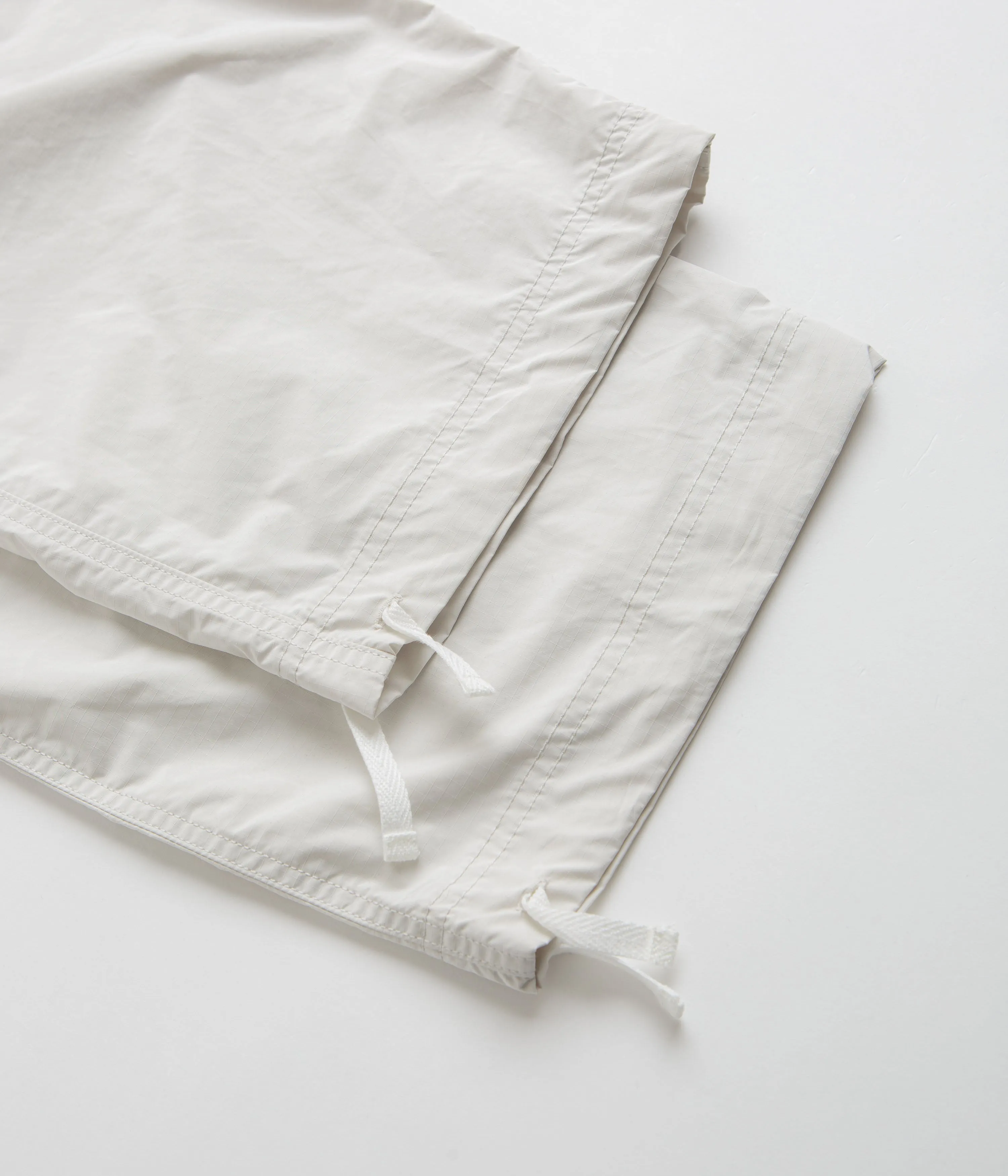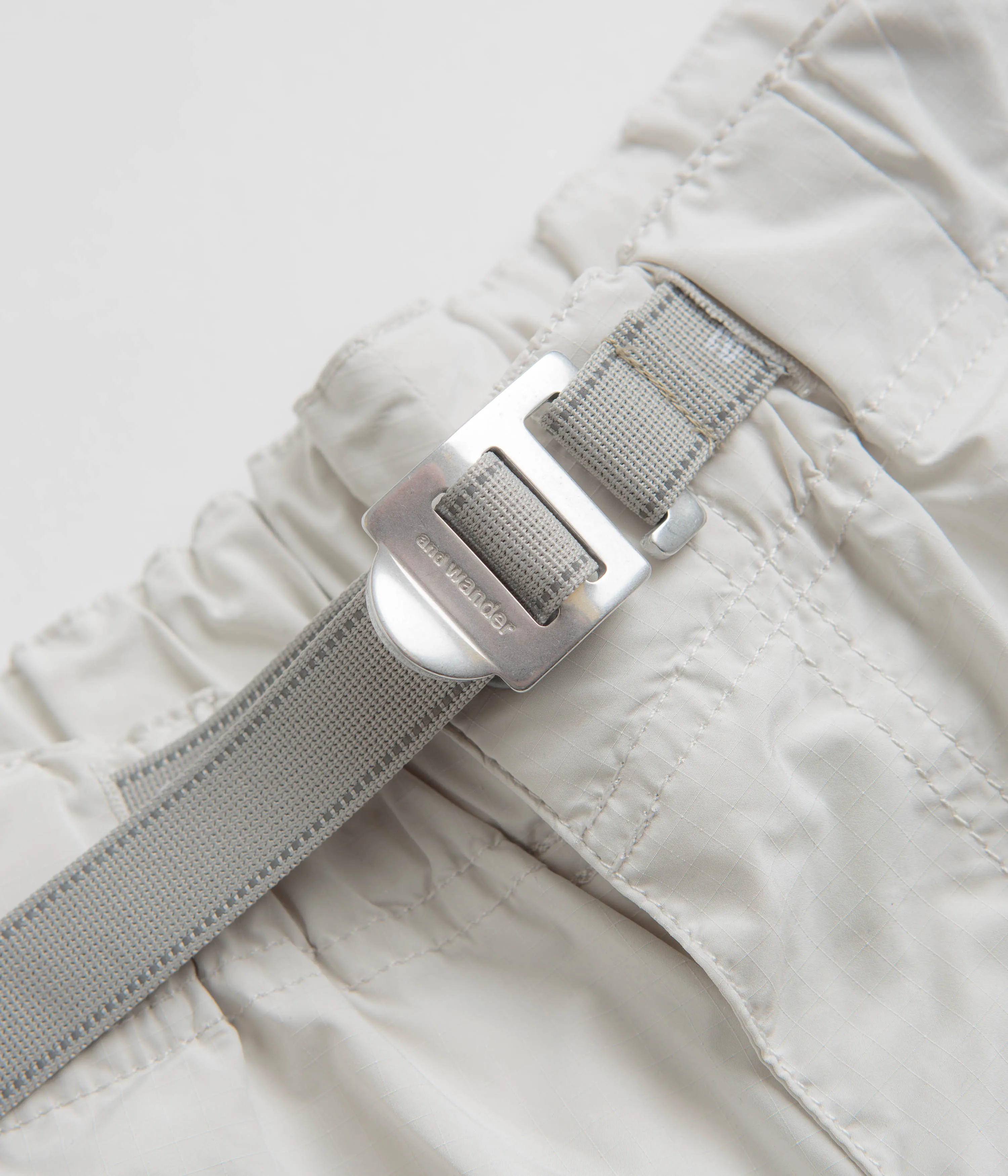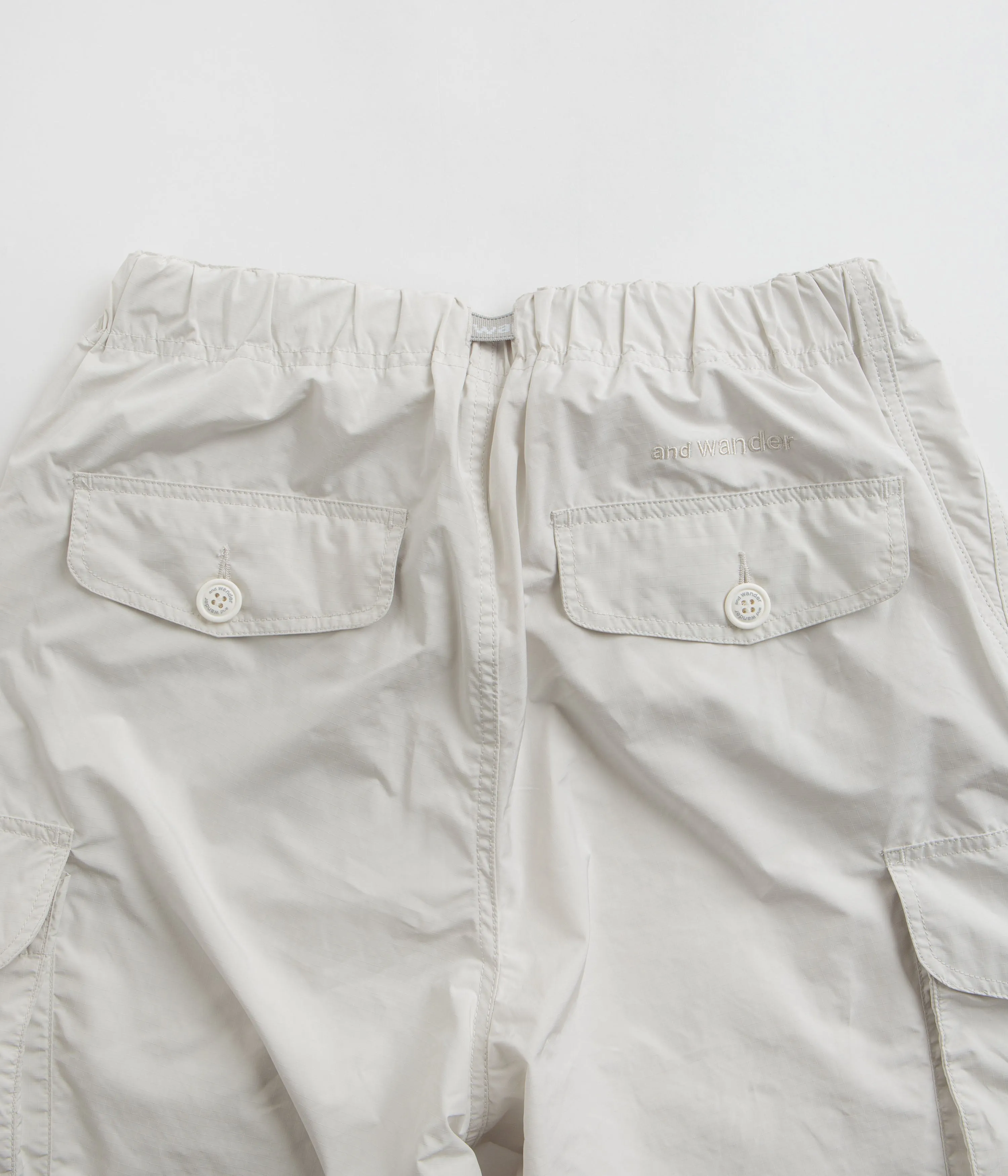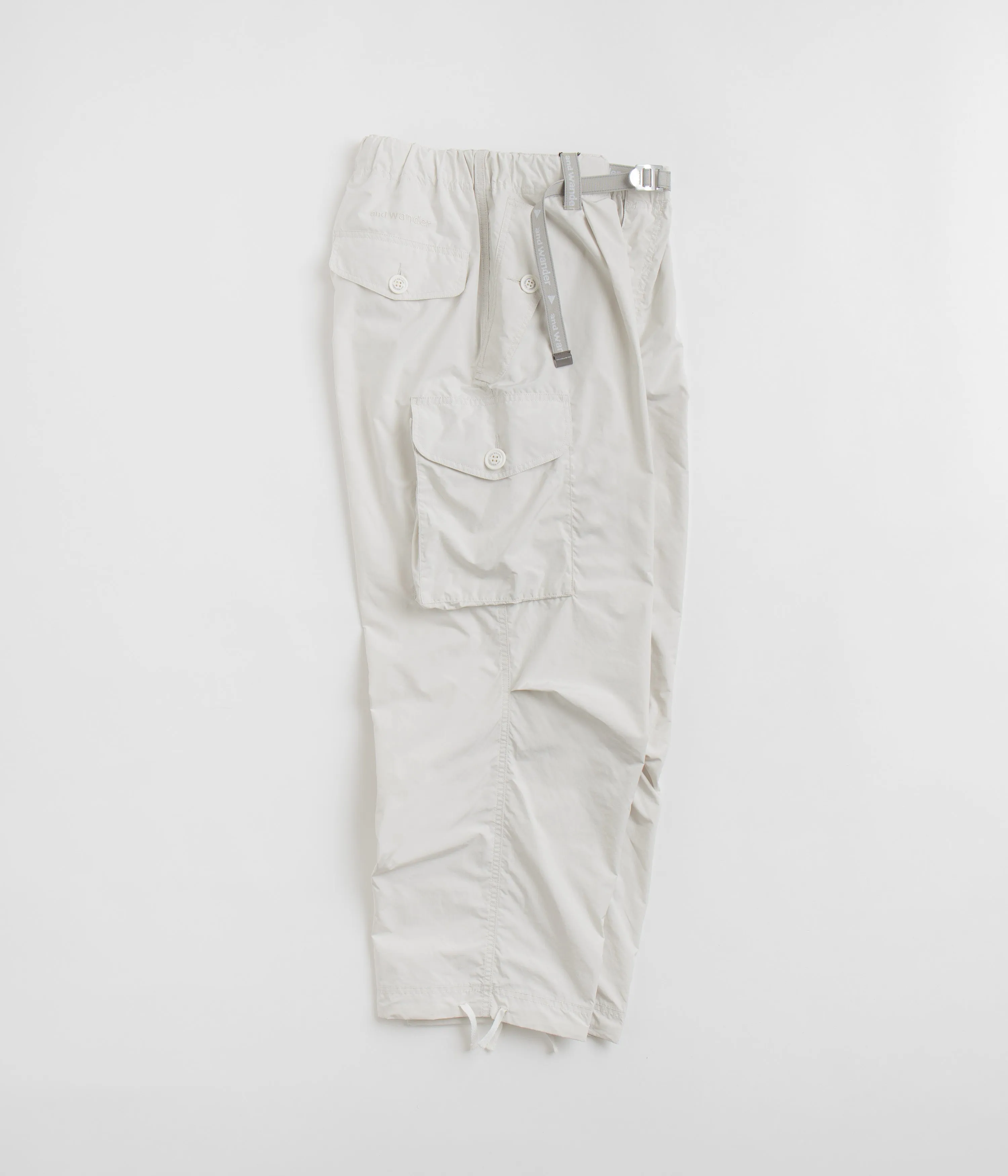 and wander Oversized Cargo Pants in Off White. Designed with a DWR shell and a split-yarn dye, these loose fitting and wander pants are crafted from a polyester-nylon blend. Cut with a wide leg to feature an elasticated waistband and a removable webbing belt, these white and wander cargo pants also feature pleated knees and additional utility pockets. Finished in a shade of white with a carabiner attachment point, two side pockets, two rear pockets and with embroidered logo branding.