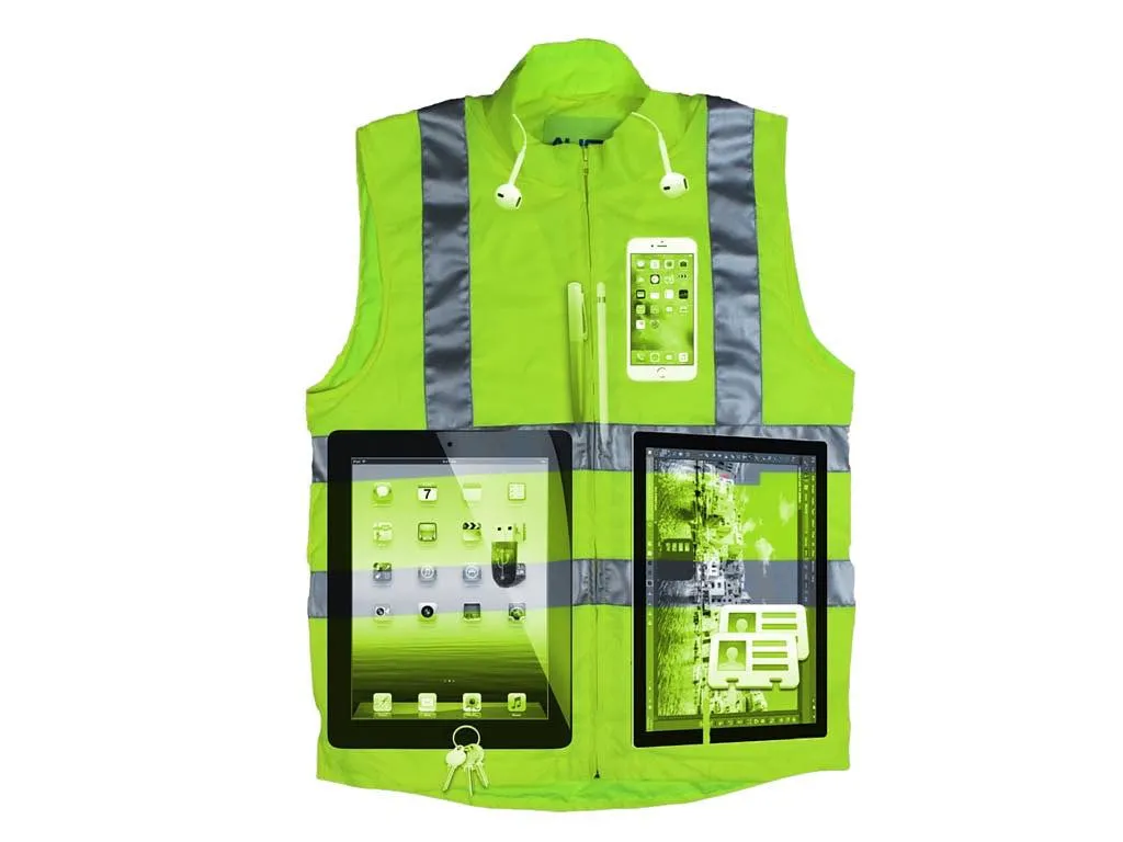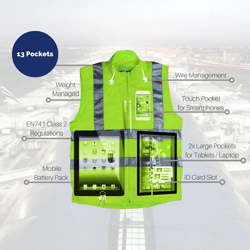The AyeGear® HV-13 is an executive style hi-visibility vest with the ultimate in connectivity, accessibility, mobility, safety & security which incorporates 13 separate compartments. Rugged, durable, weight balanced, wrinkle-free and extremely versatile, the HV-13 is ideal for use in (and not limited to) construction, hiking, cycling, dog walking, running, mountain rescue, accident investigation, airport operations or for use by law enforcement agencies.