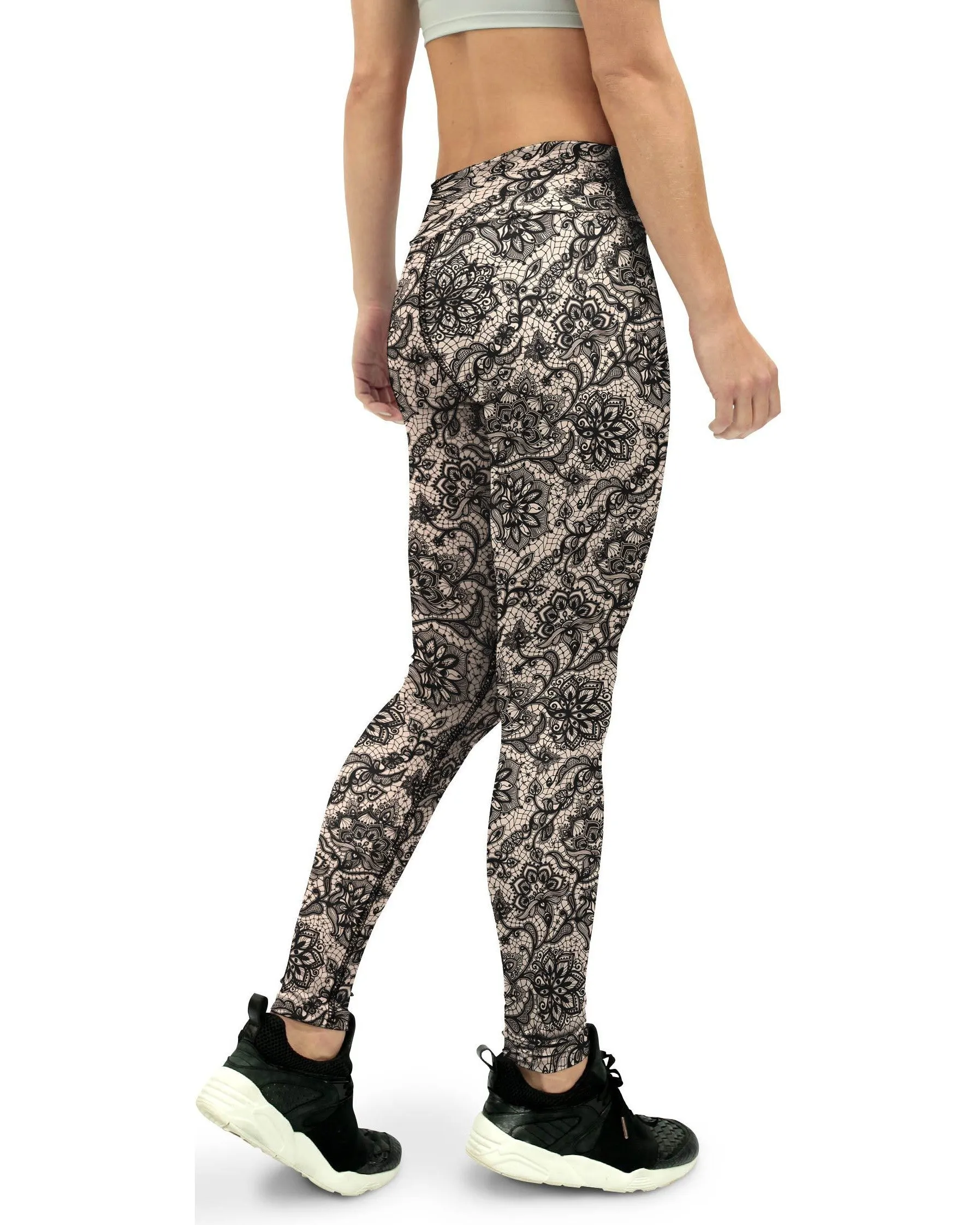 Solid flesh toned leggings with a black lace print, these leggings have a body-flattering fit that will make you feel super comfortable even during the most intense workouts. They come with a high waistband and are made from soft stretchy material.