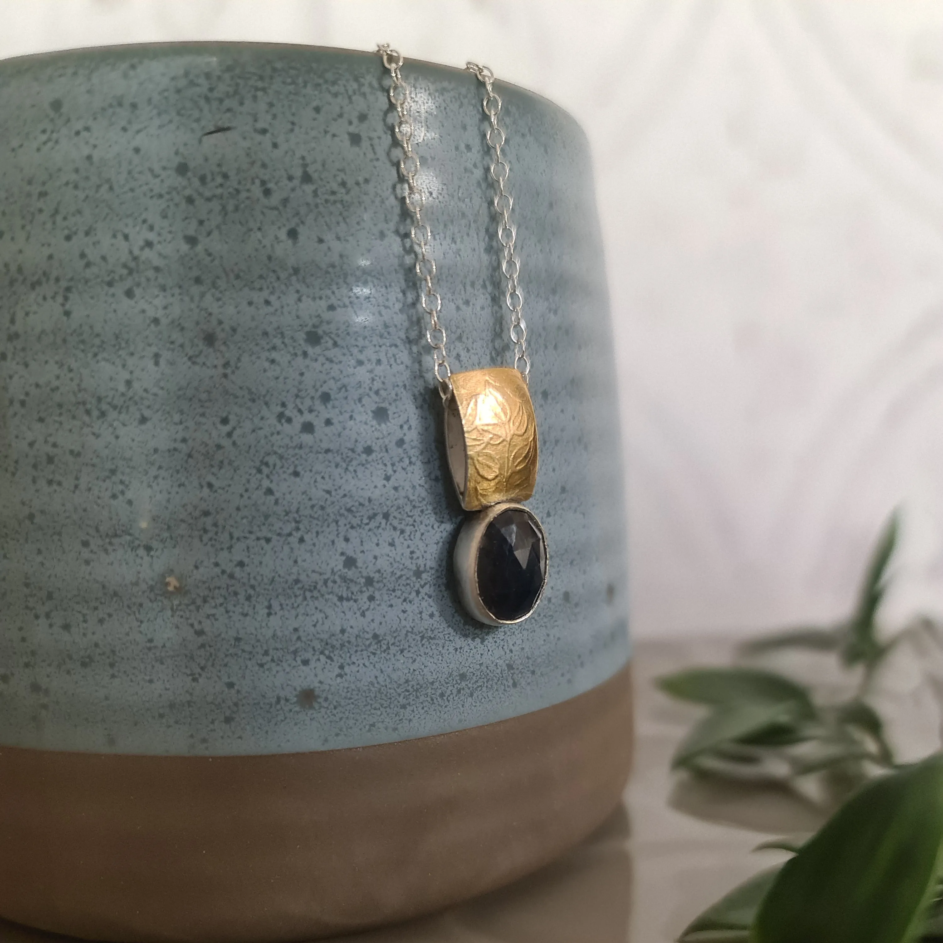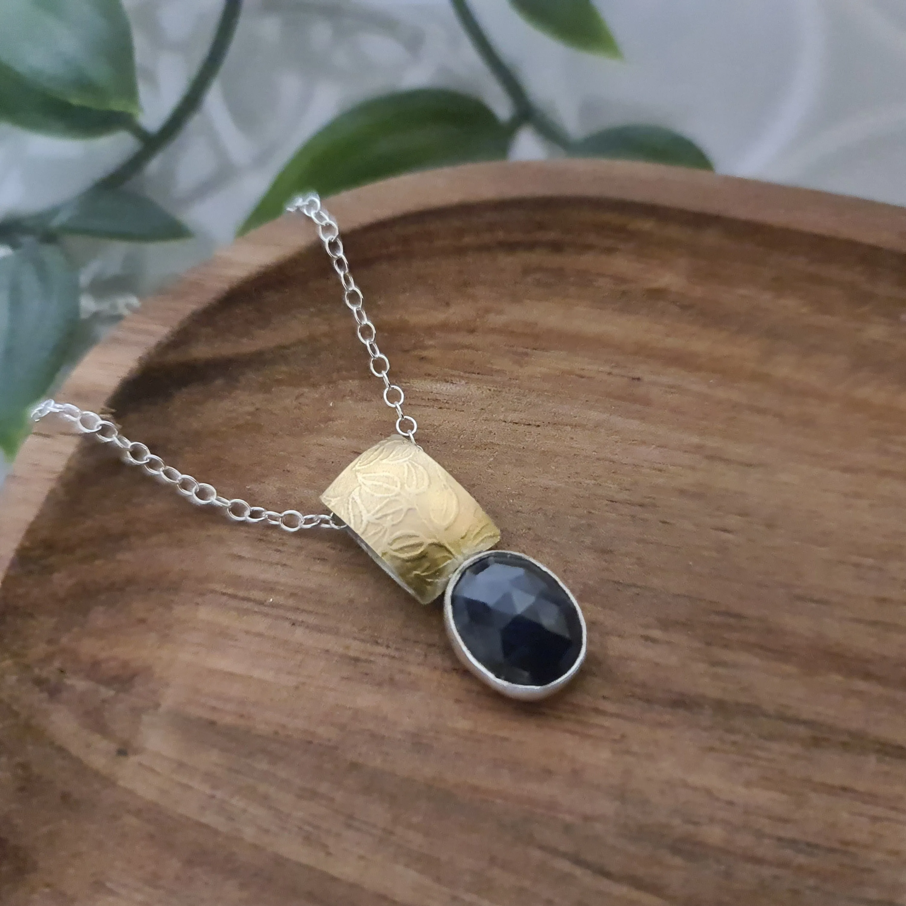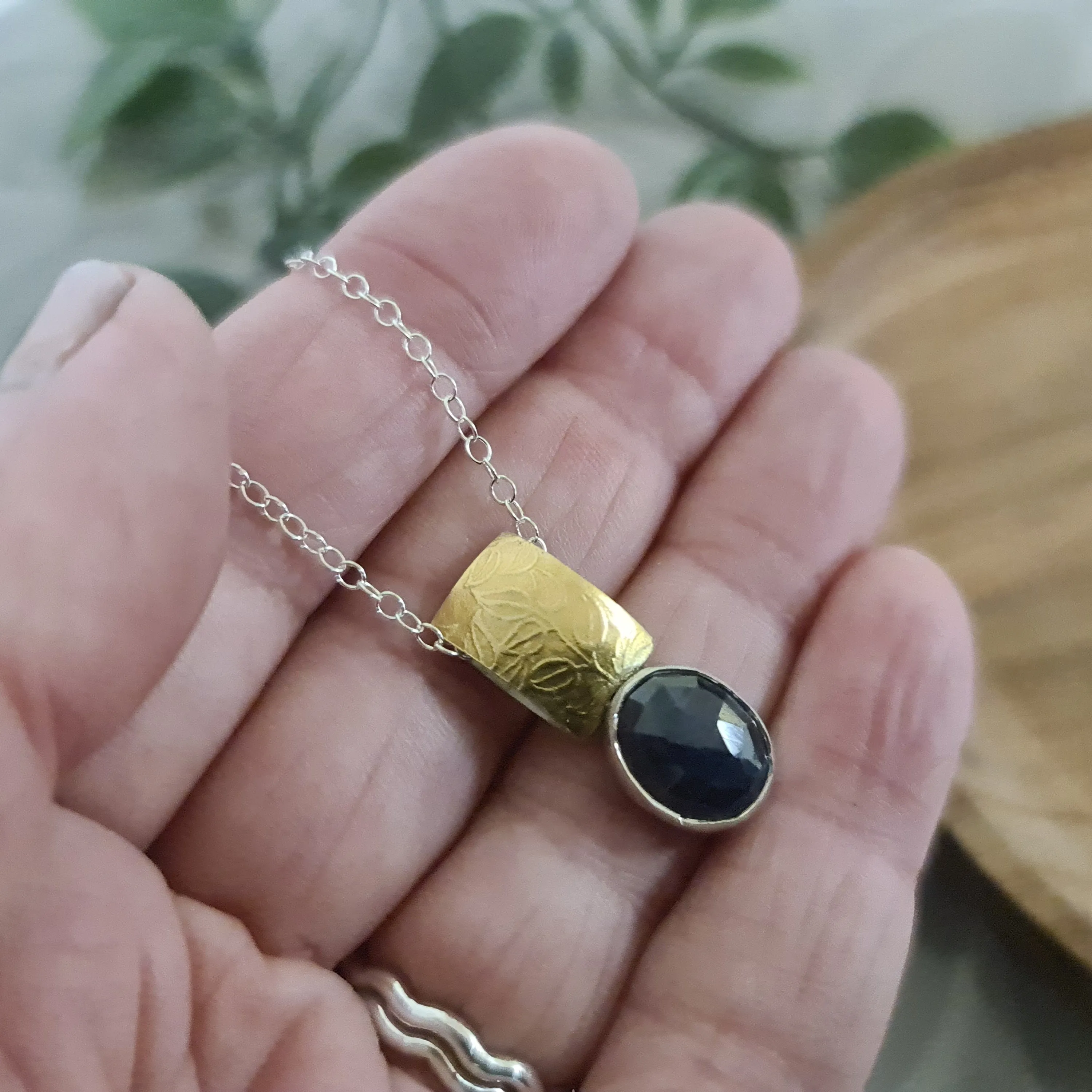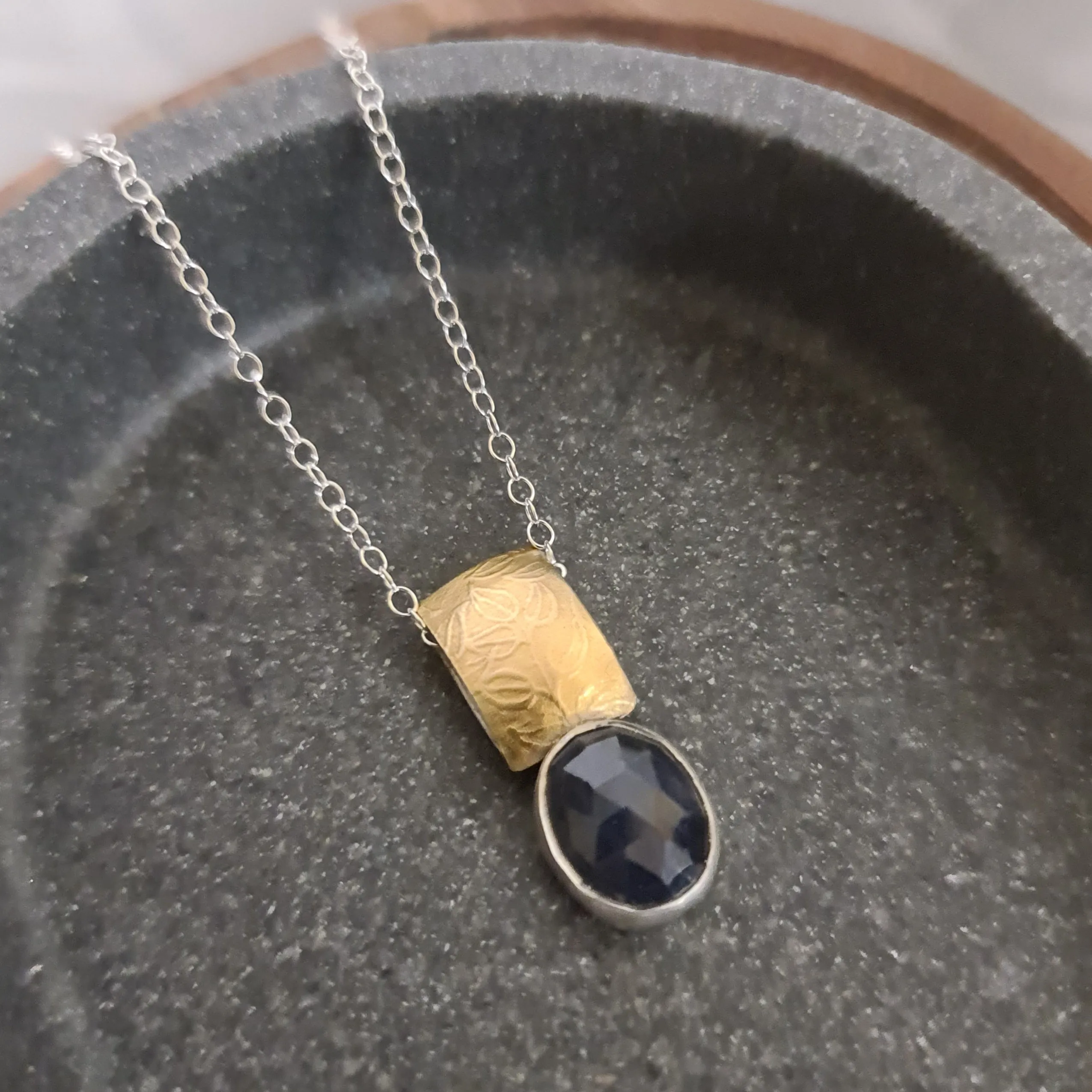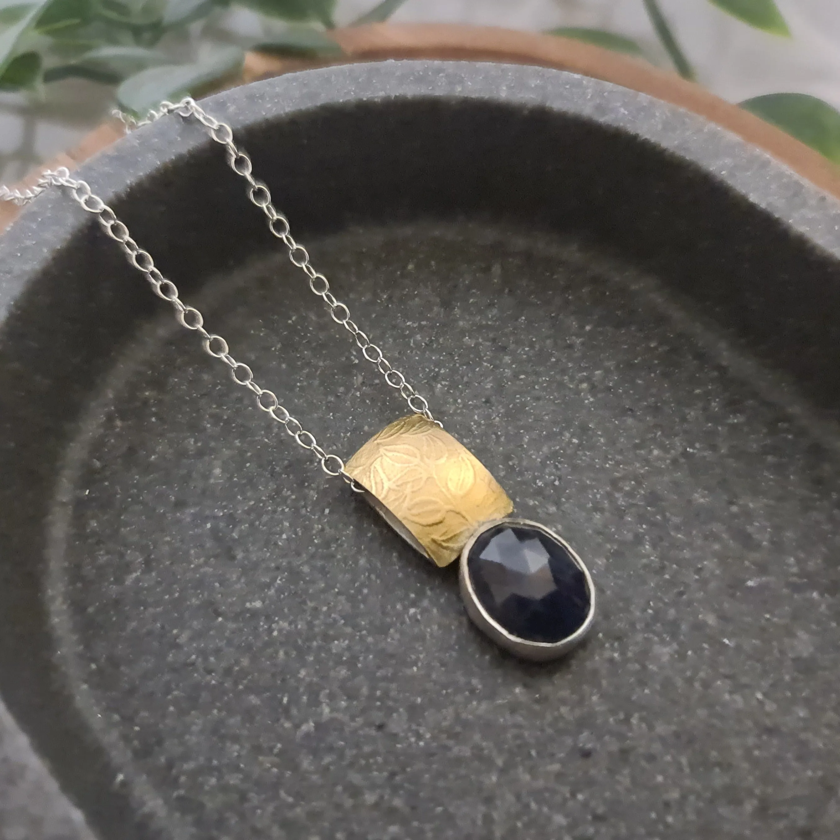 A deep blue sapphire, cut with facets that catch the light beautifully, has been set in silver, framing it beautifully. The hollow silver bead above the stone setting has been decorated with a delicate pattern on both sides and then made even more special with a 24k gold plating.