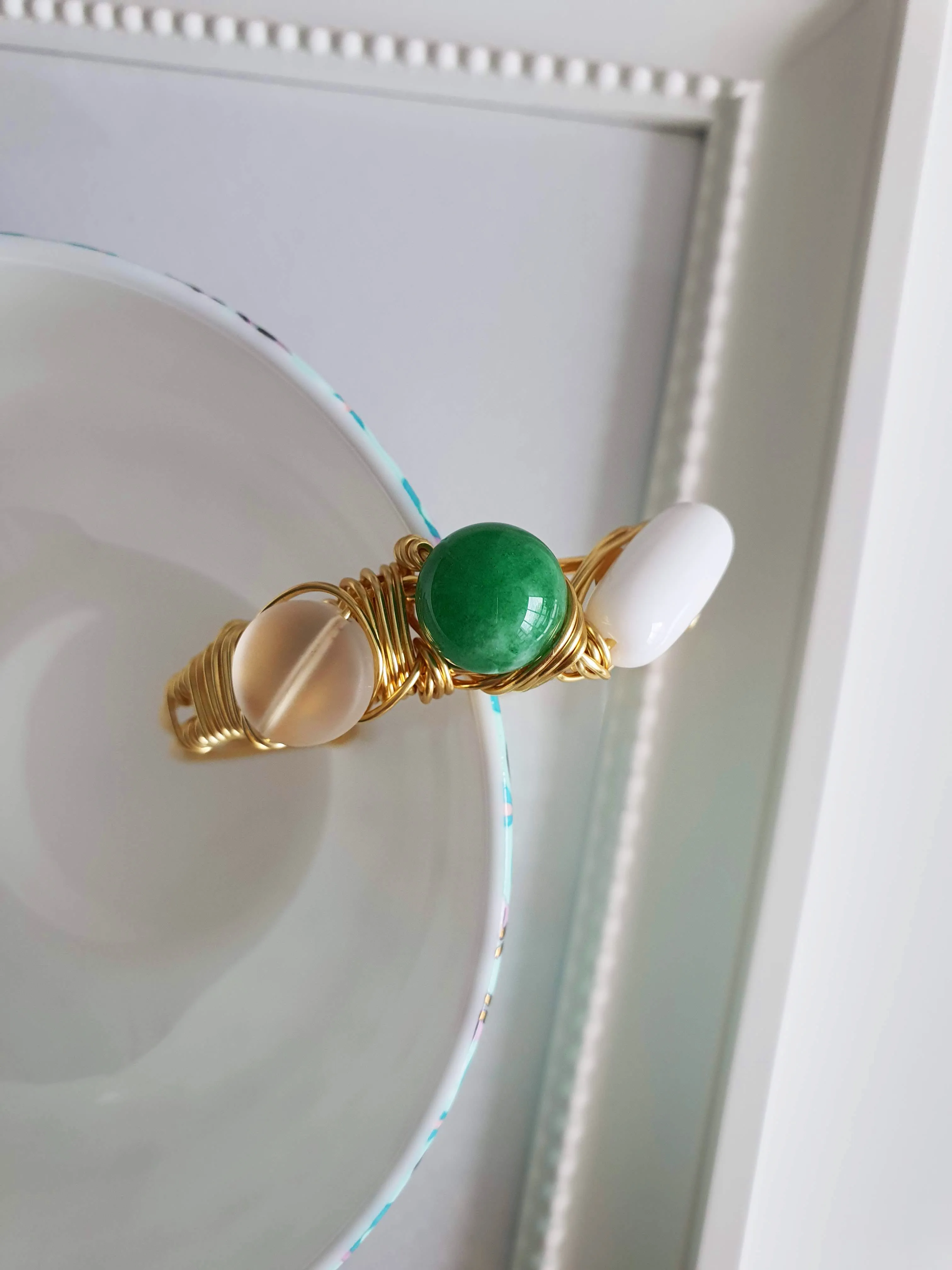 Green Agate Stone, White Ceramic Bead, Frosted Matte Glass Bead