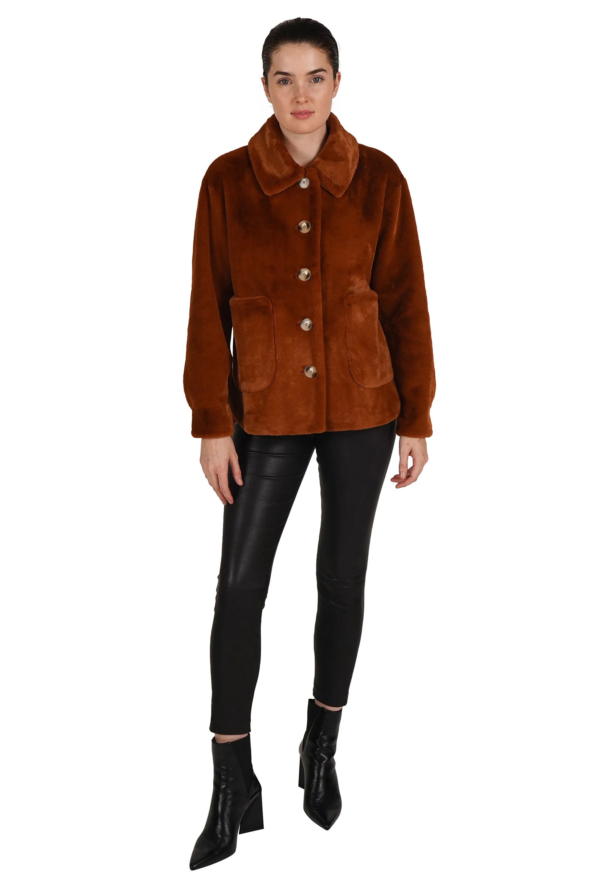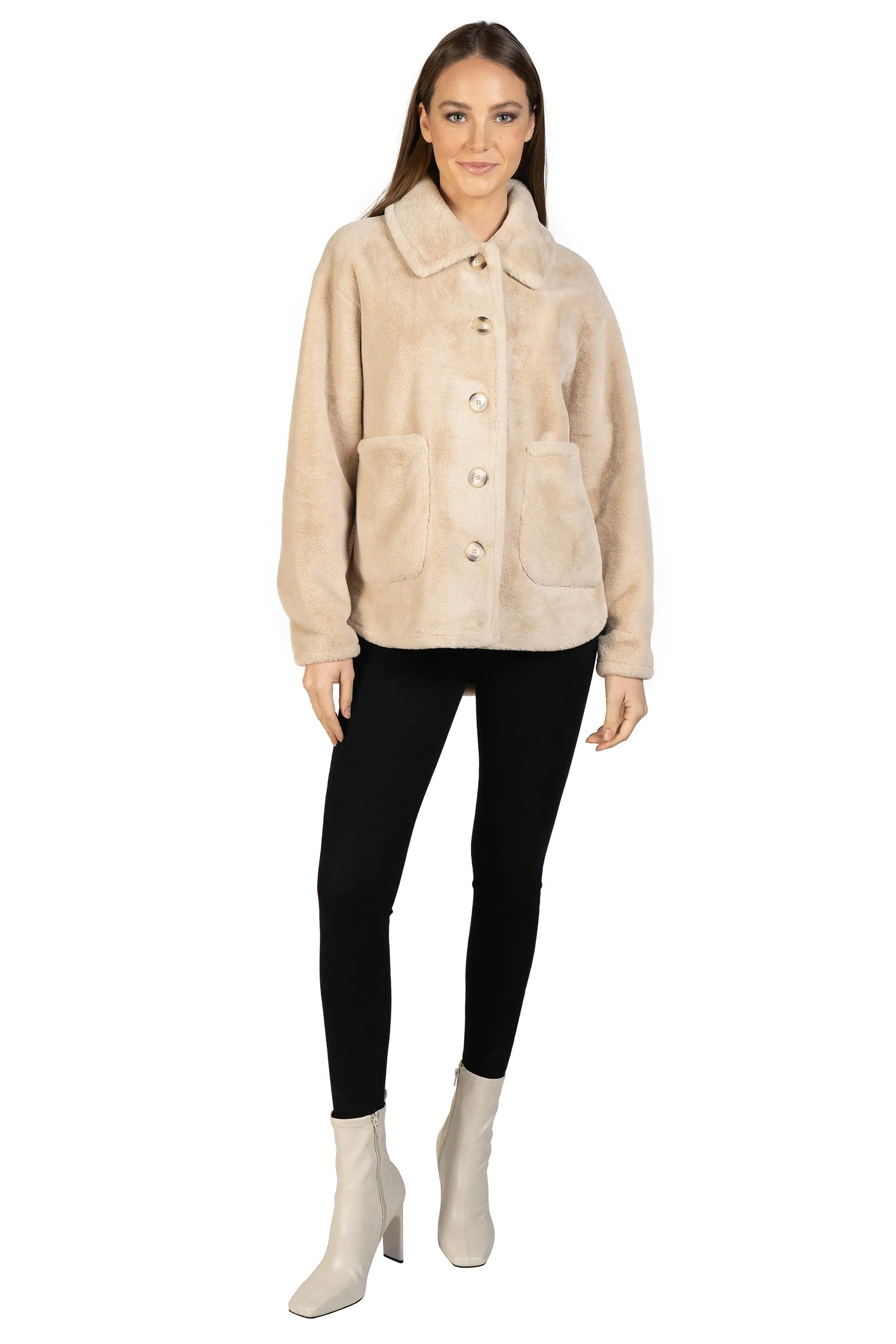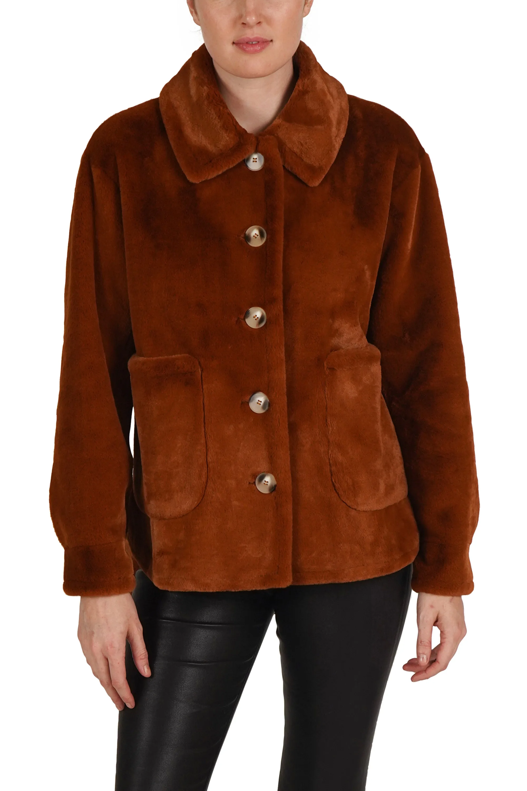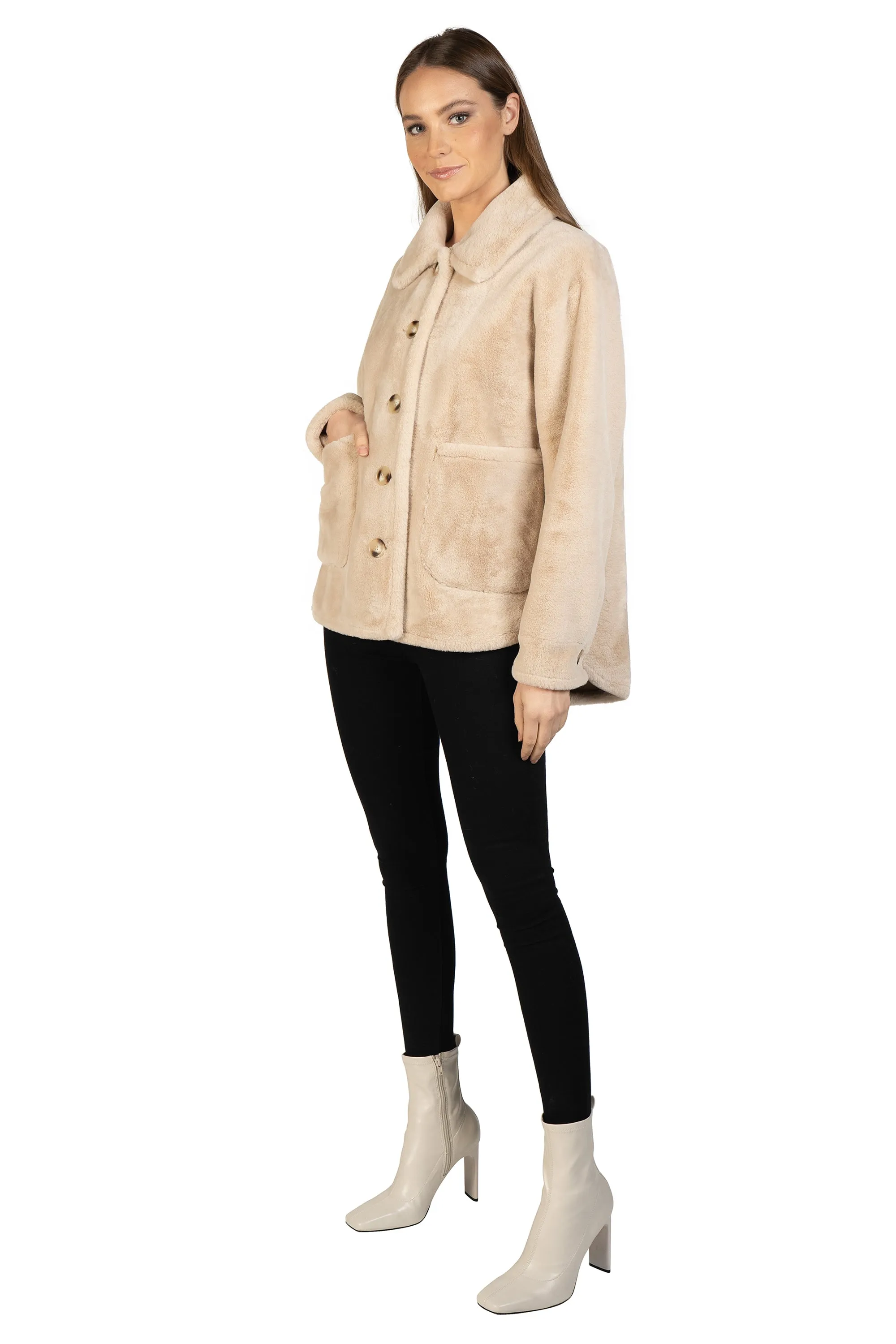 The jacket you need for the holidays. Beautifully crafted soft faux fur, button center front, collared and with two working patch pockets.