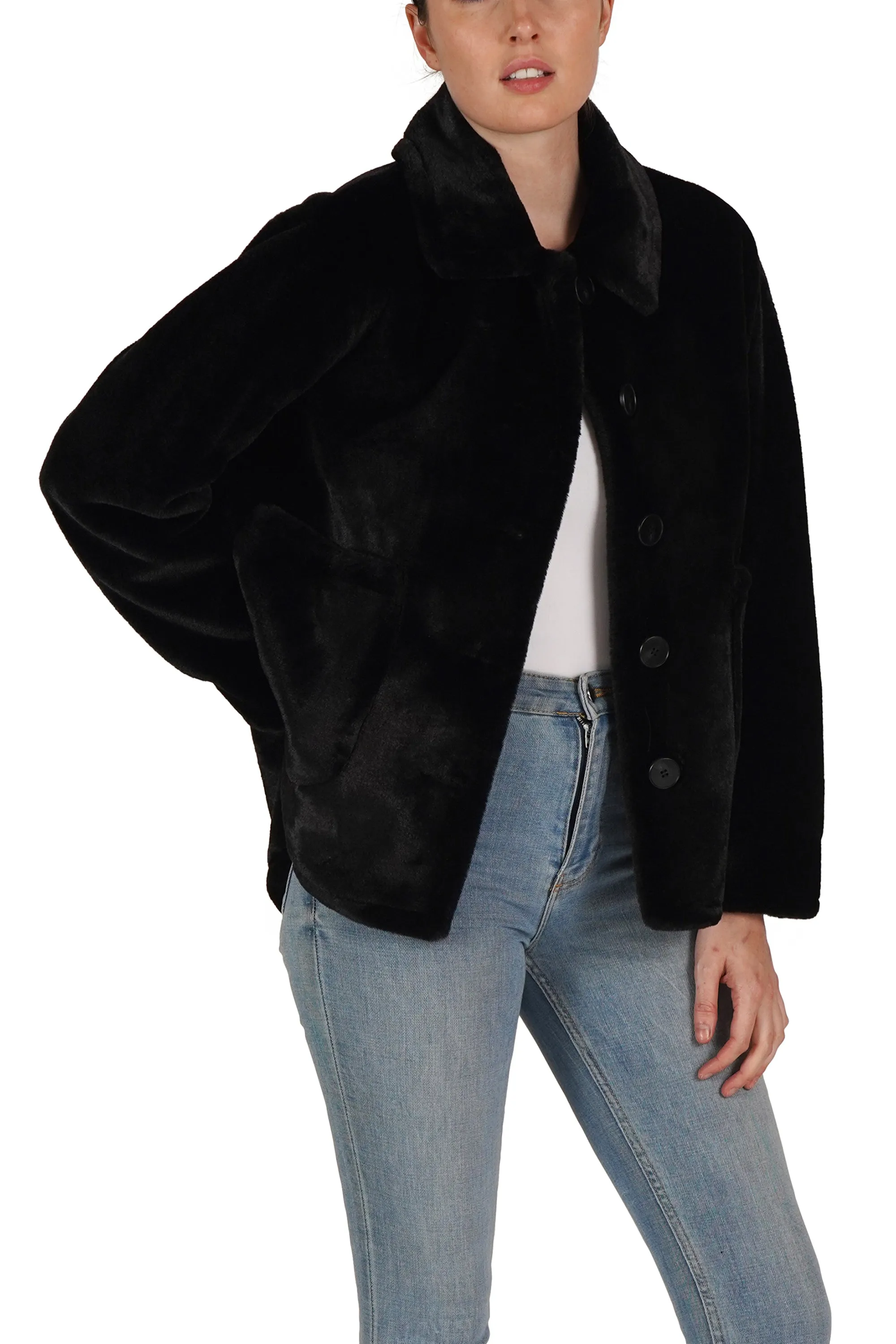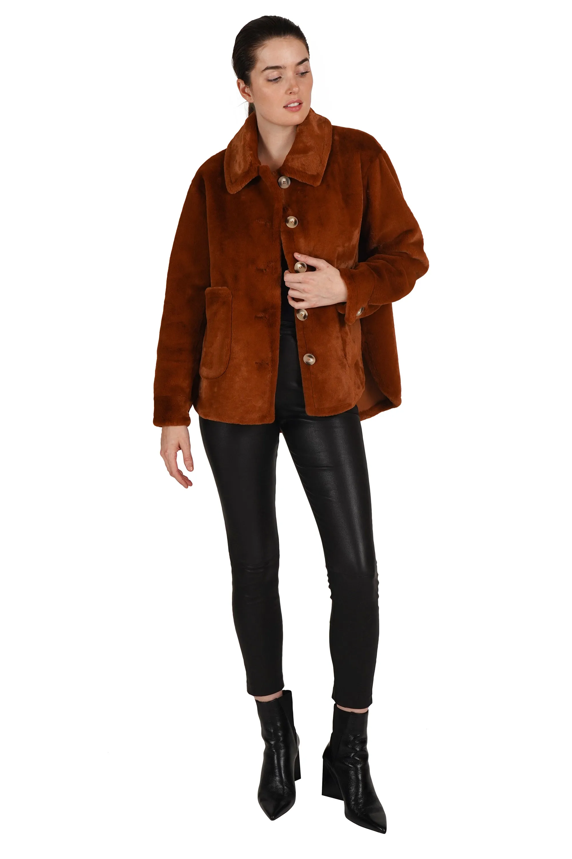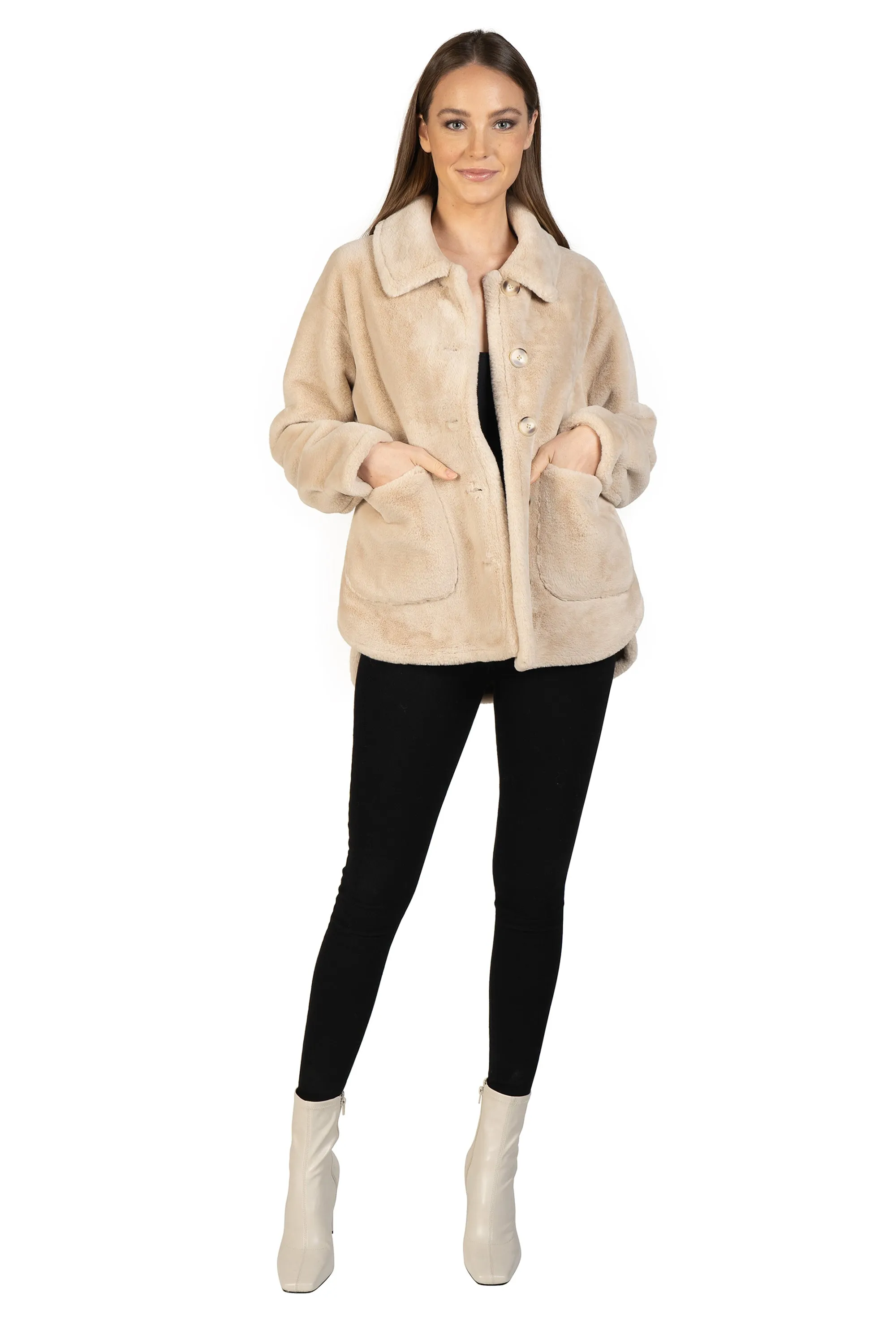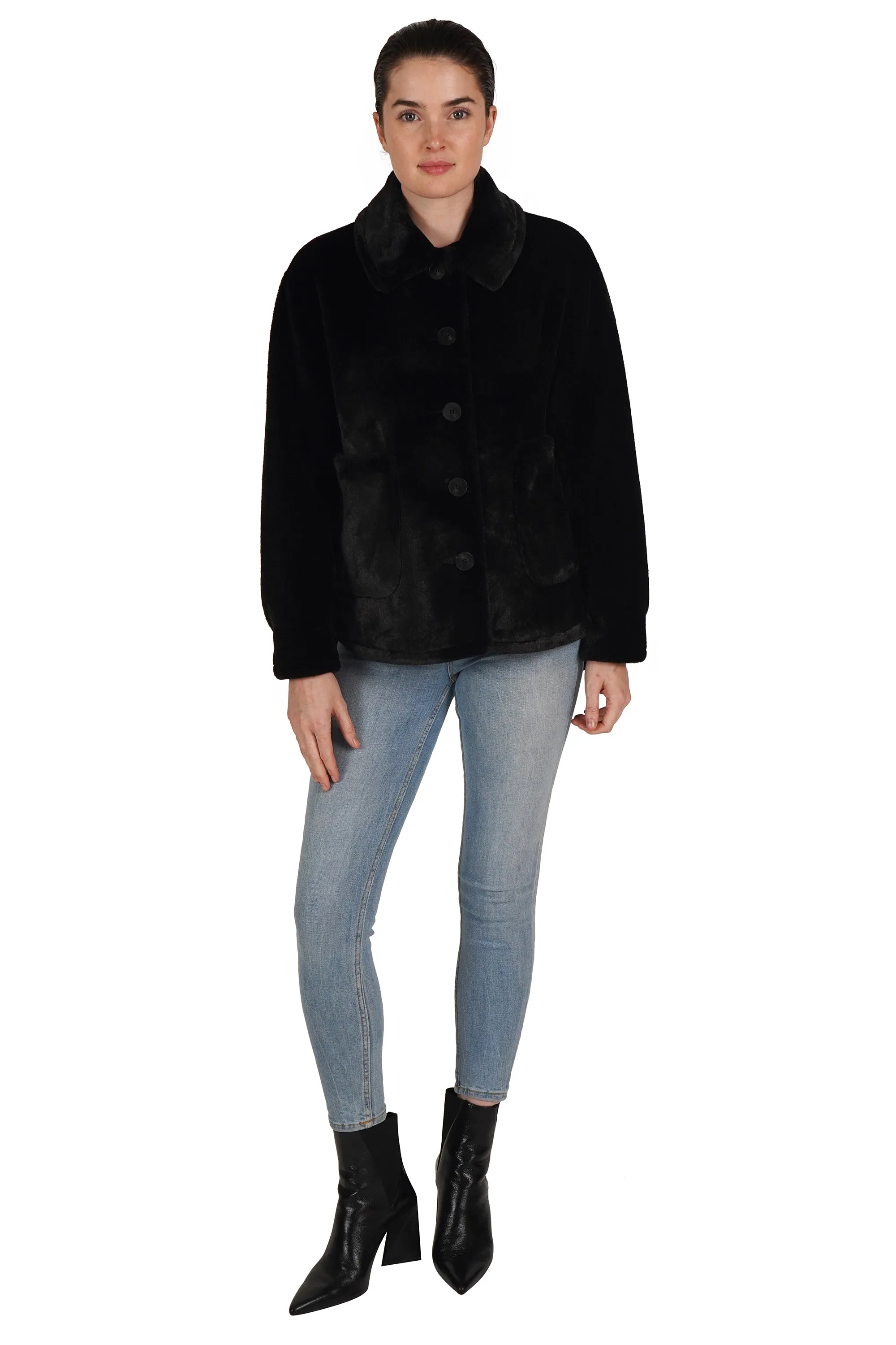 The jacket you need for the holidays. Beautifully crafted soft faux fur, button center front, collared and with two working patch pockets.
