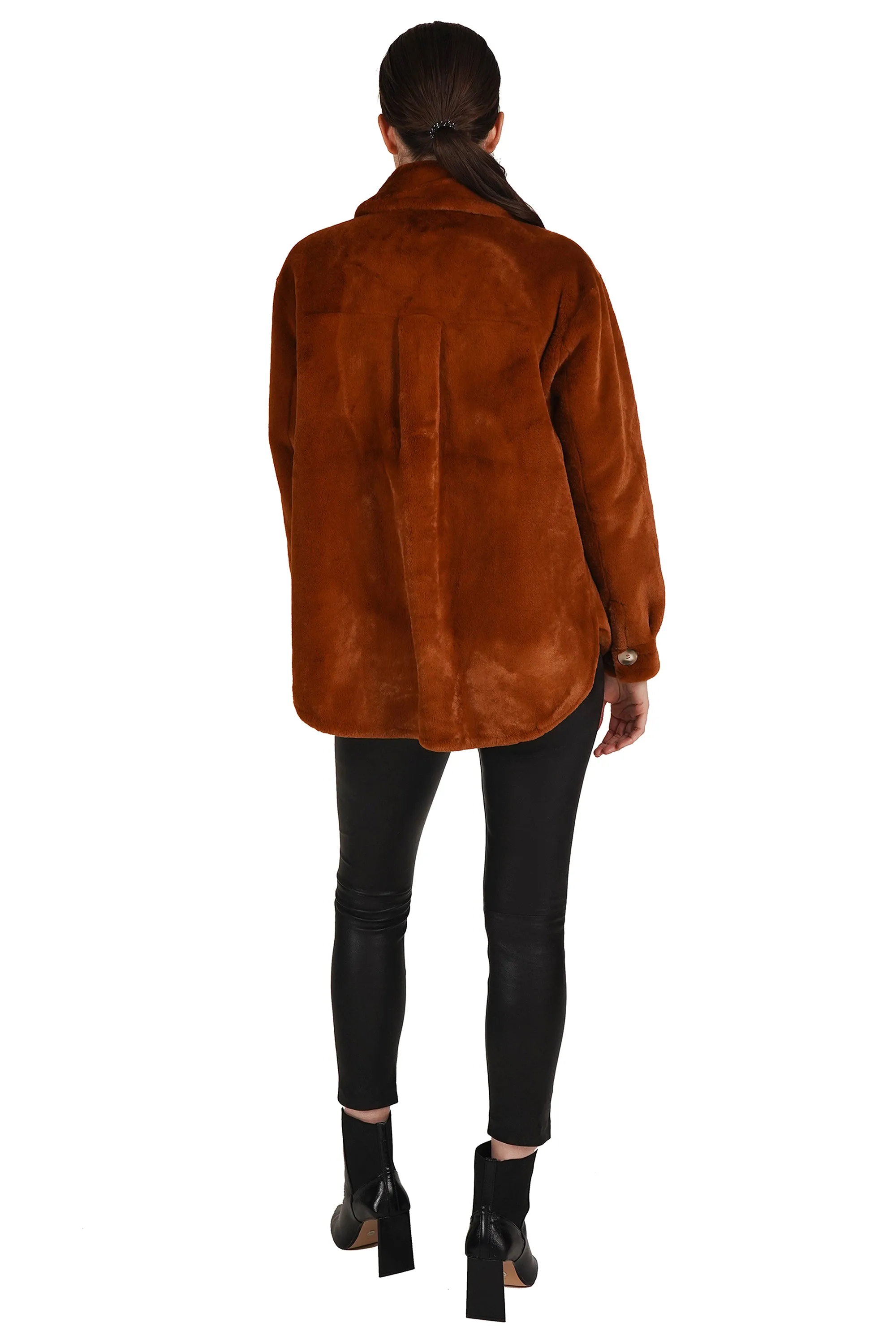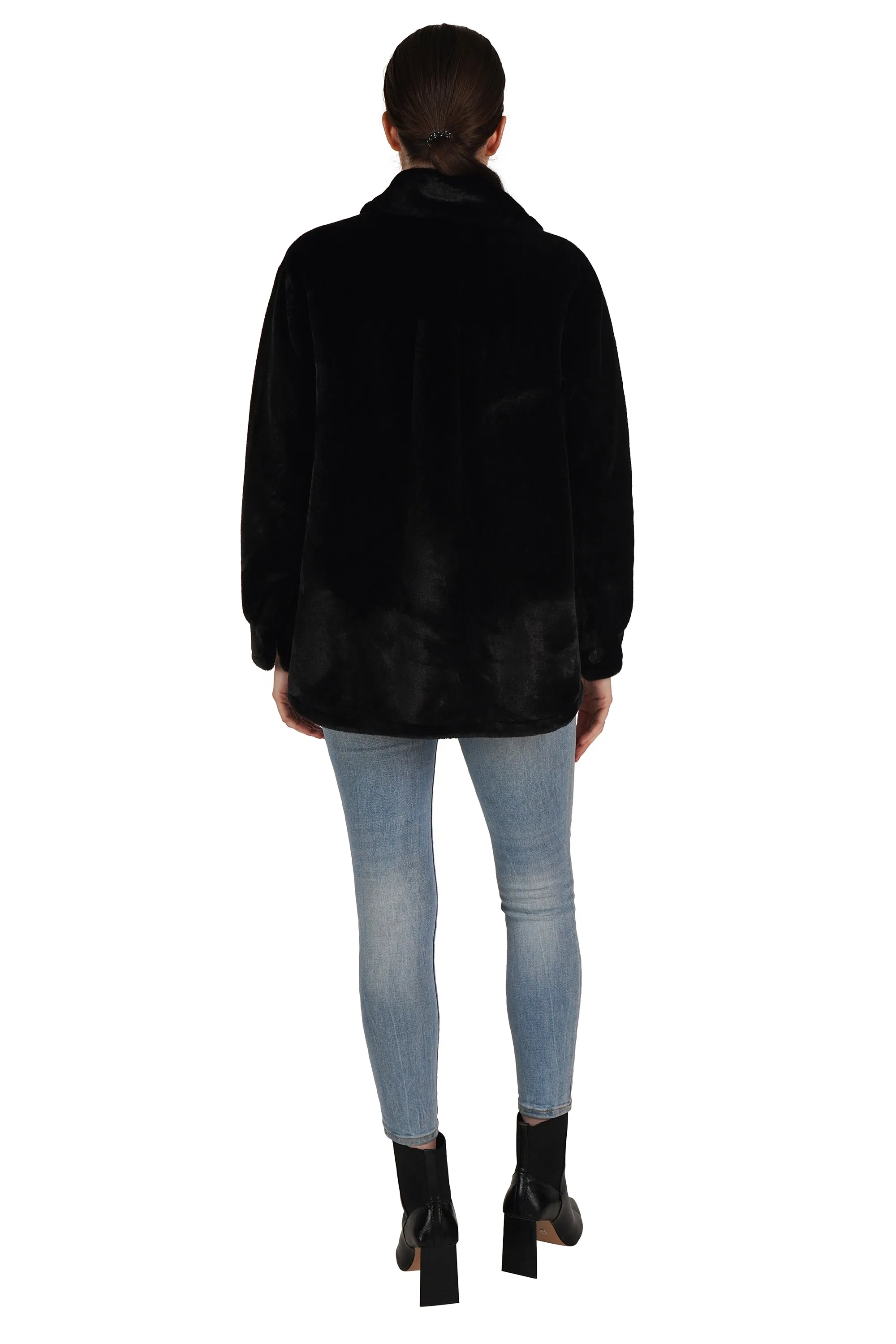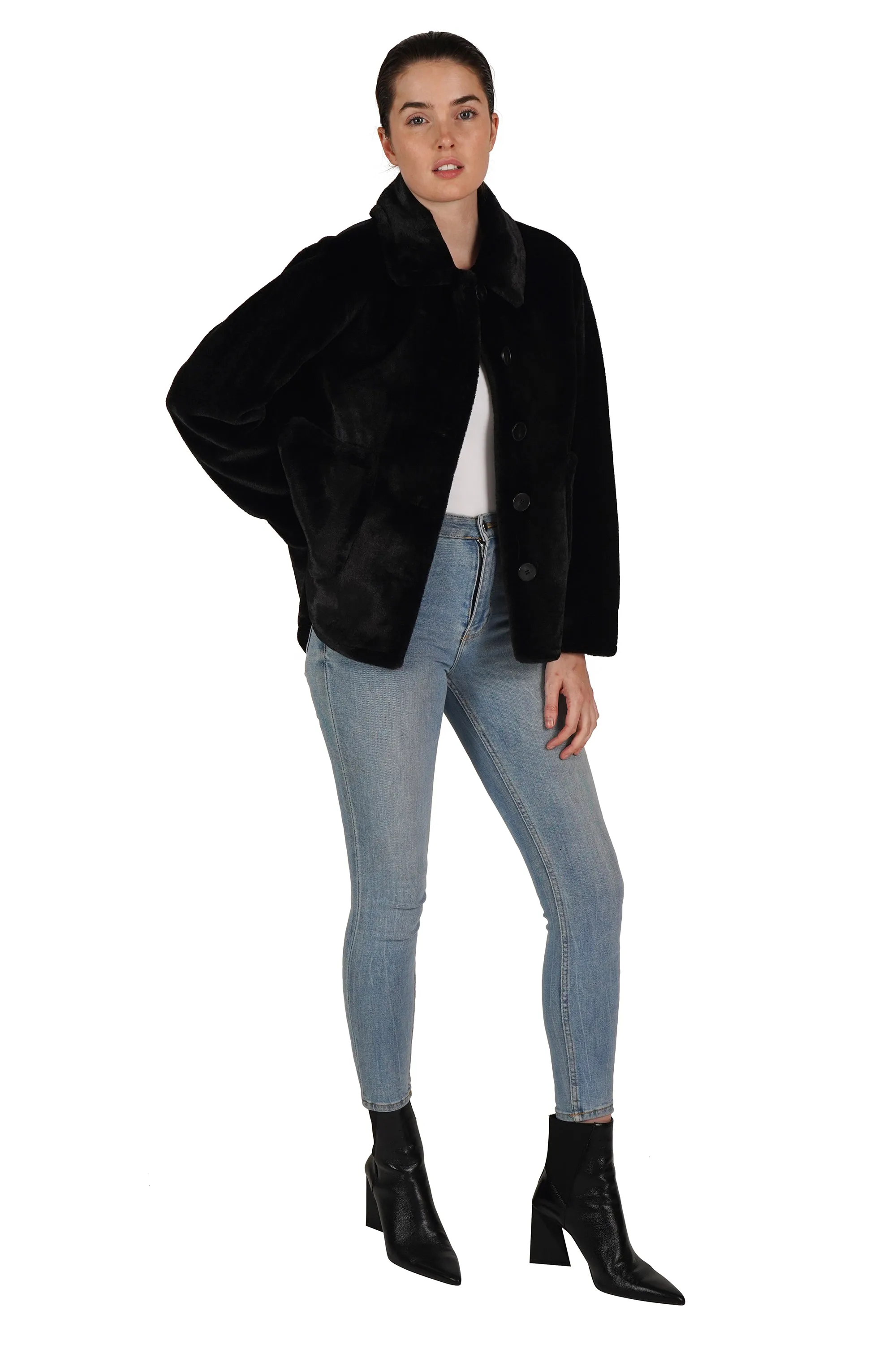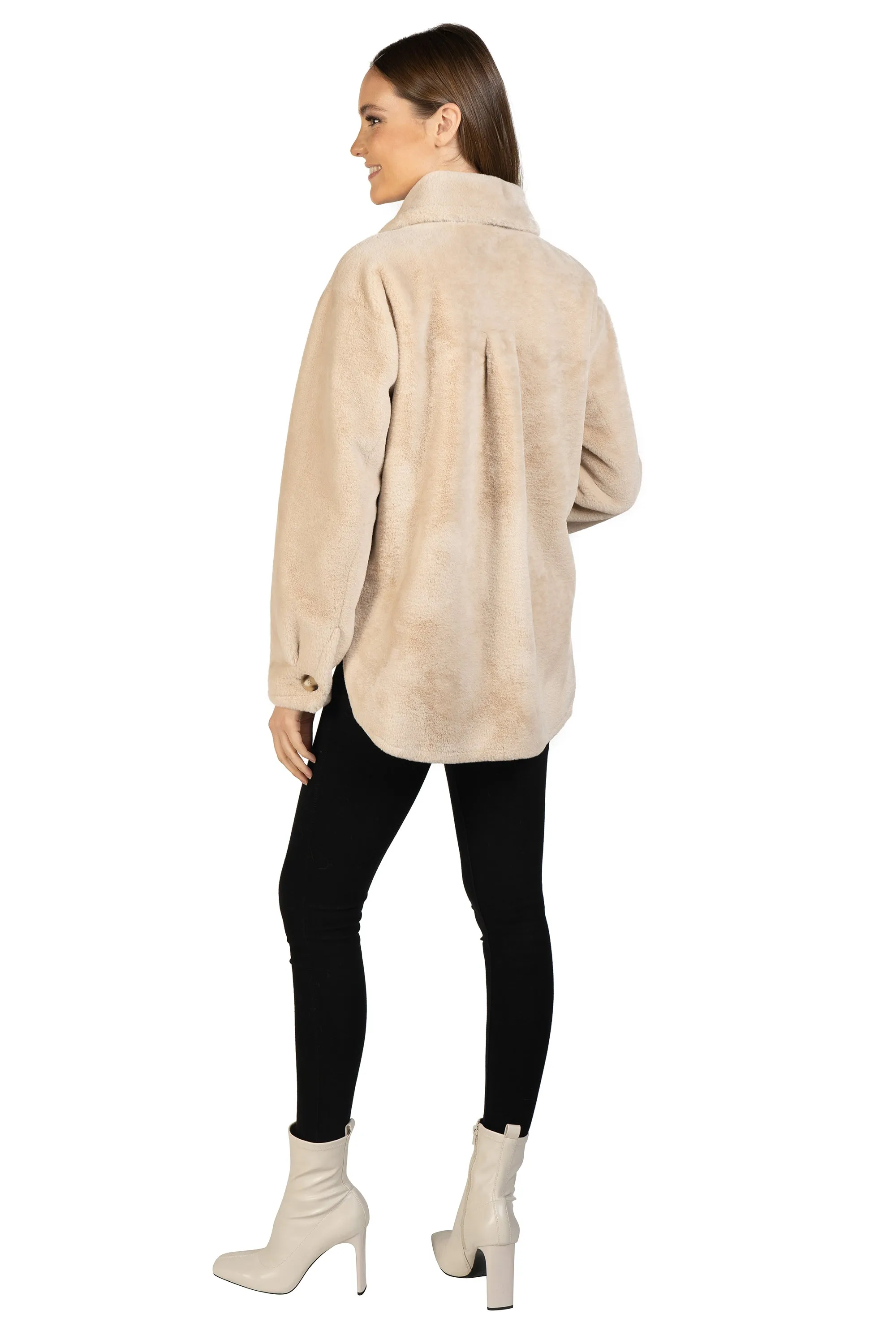 The jacket you need for the holidays. Beautifully crafted soft faux fur, button center front, collared and with two working patch pockets.