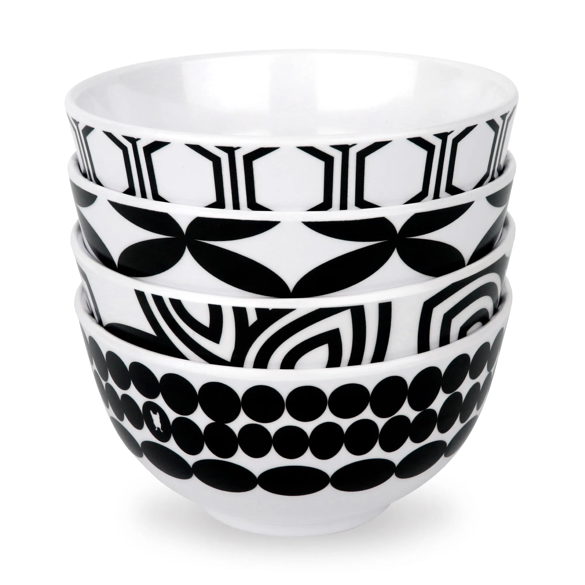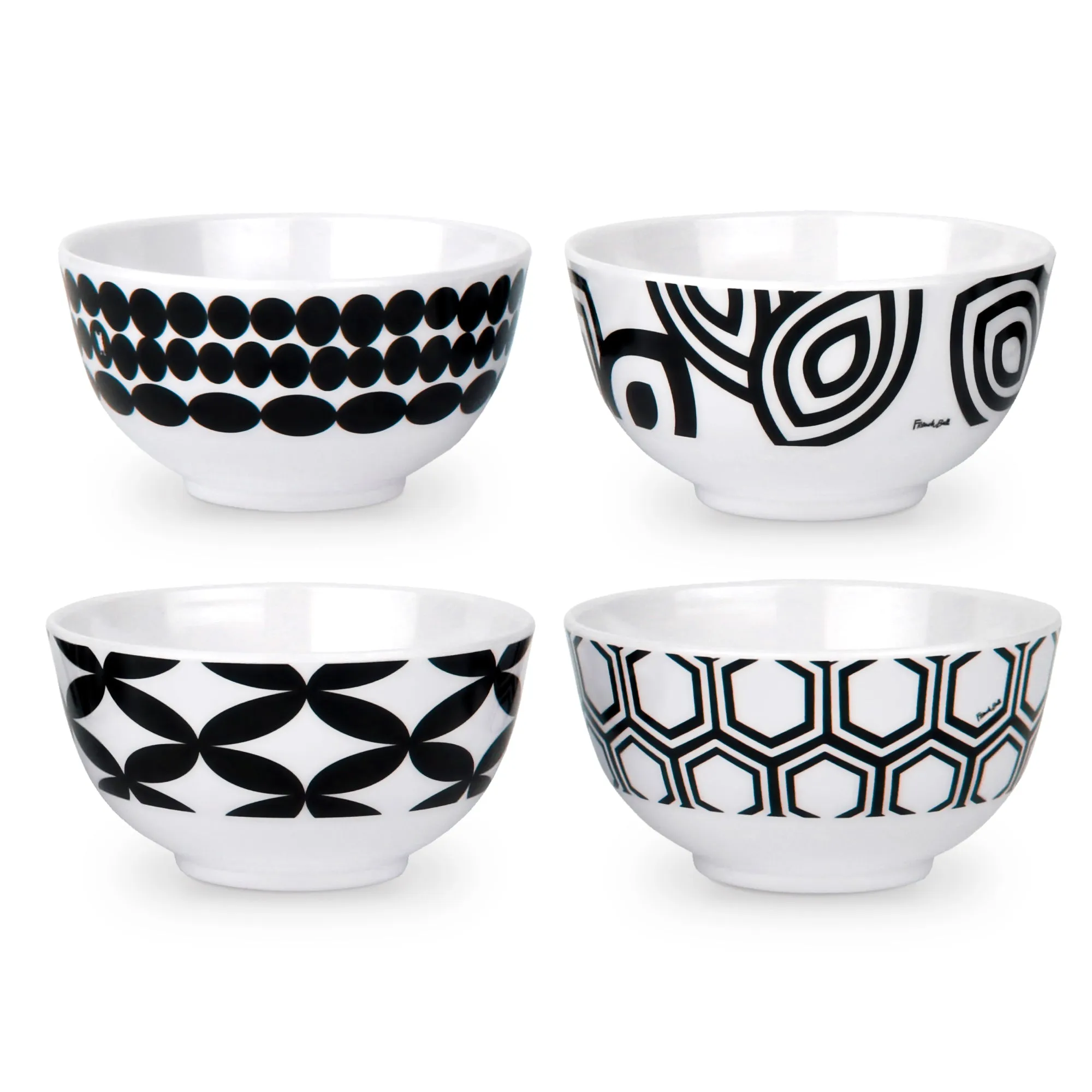 Set of 4 bowls great for ice cream, desserts, nuts and spreads. Each bowl is a unique black and white pattern and comes beautifully packaged in a French Bull gift box. Pick up a set of coordinating spreaders and platter to complete the look.