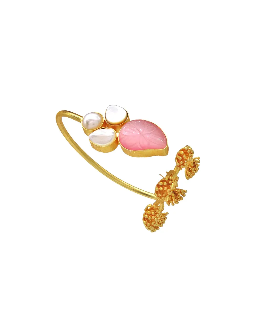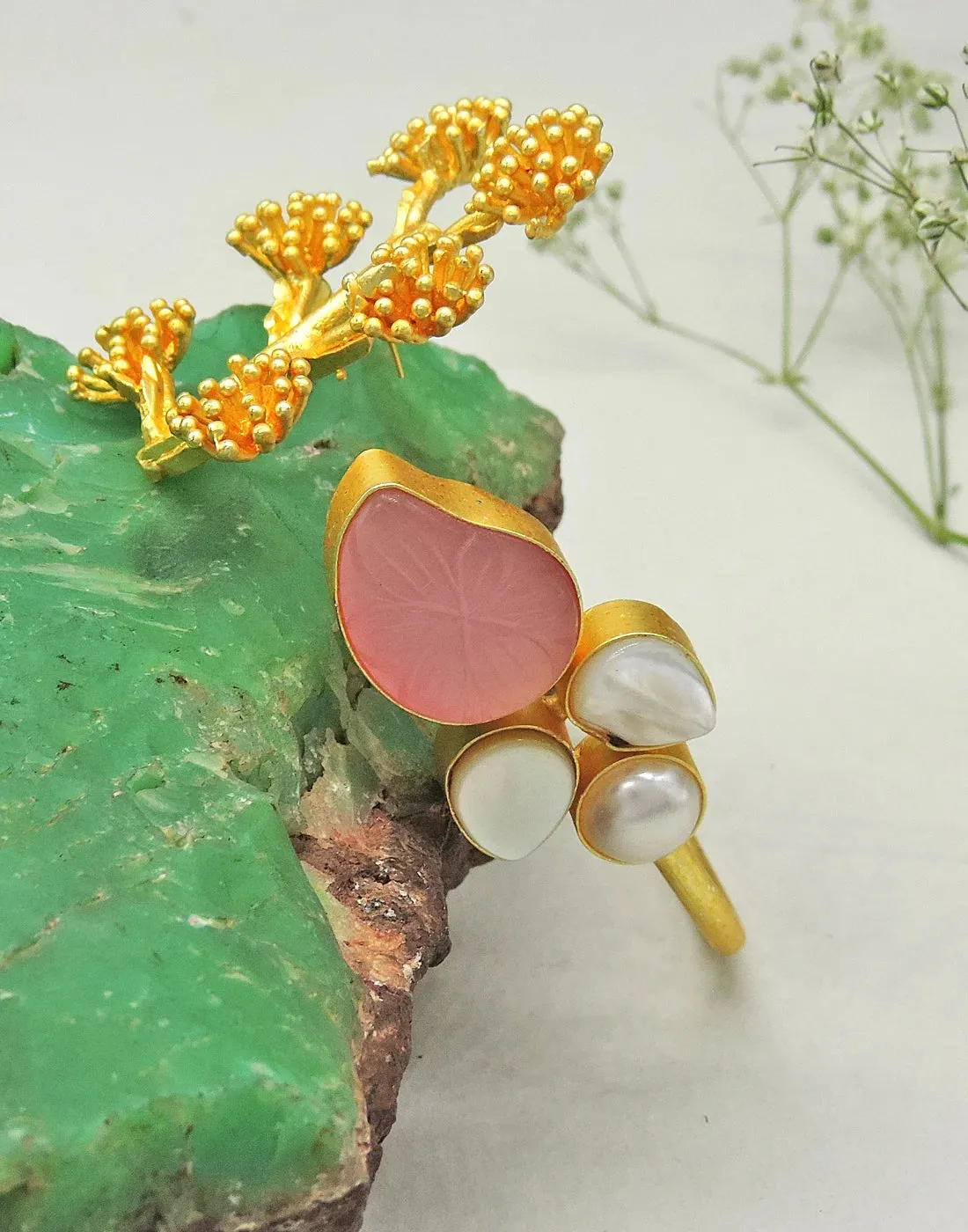 This unique golden bracelet features a clusters of natural stones, creating a delightful contrast between organic and polished elements. An eye-catching statement piece perfect for complementing breezy summer looks or adding a touch of sophisticated glamour.