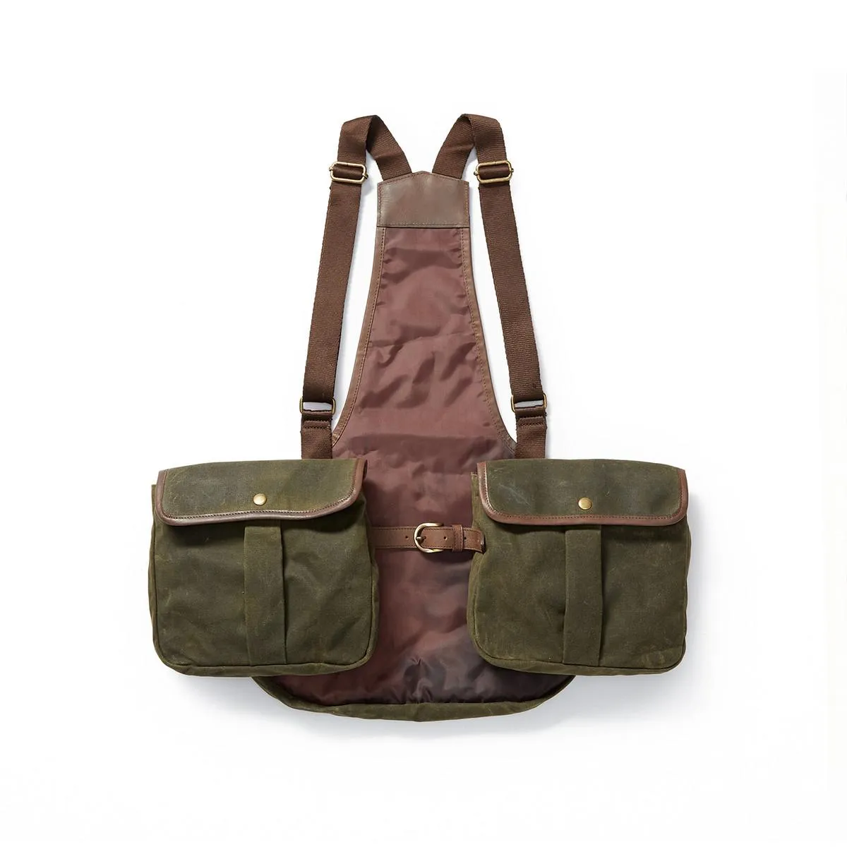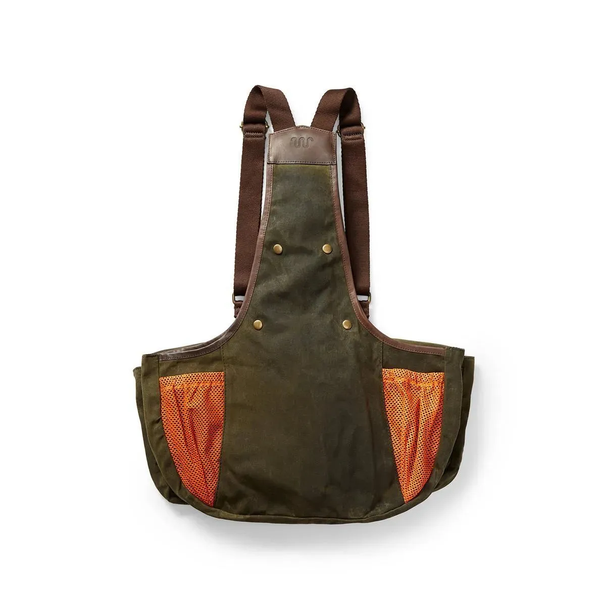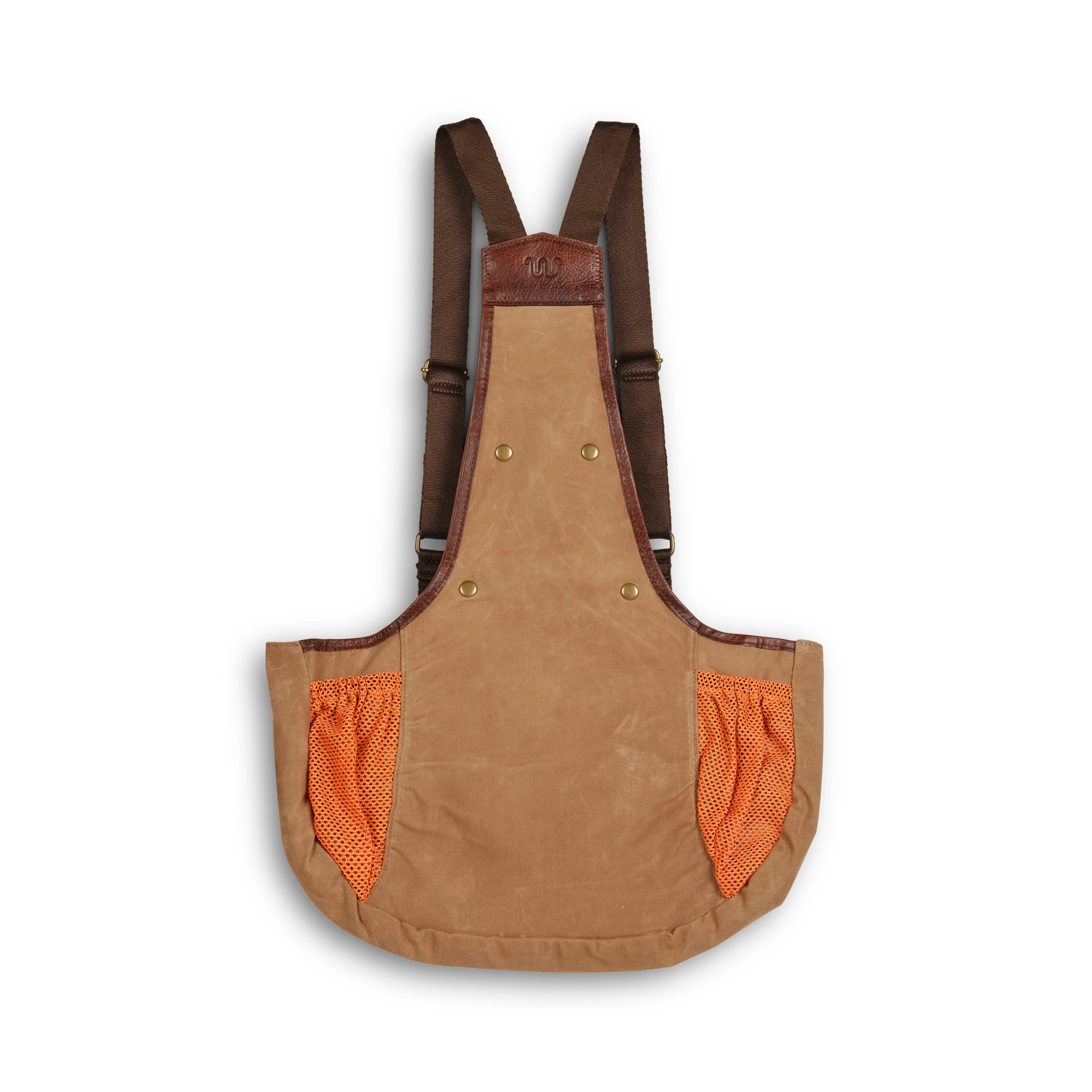 Game vest in soft and durable webbing straps adjust for a comfortable fit. Back panel features large and secure bird pocket with snaps. Orange webbing on sides for water bottle or additional gear