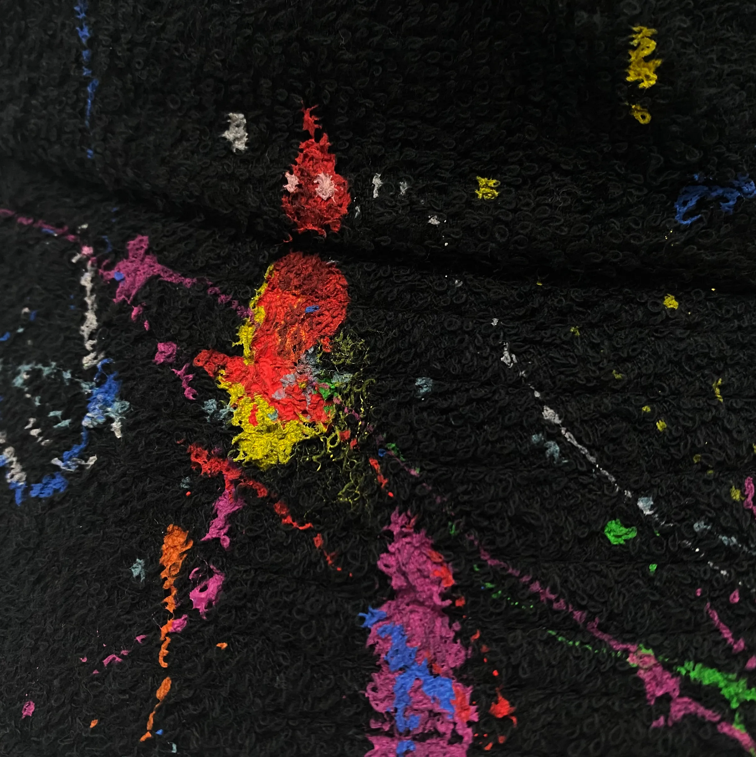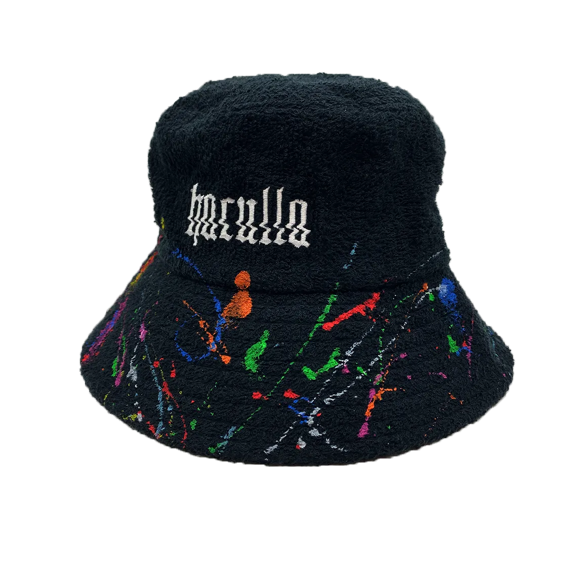 Black cotton textured bucket hat with embroidered glitched Haculla and artisanal hand-painted finish.