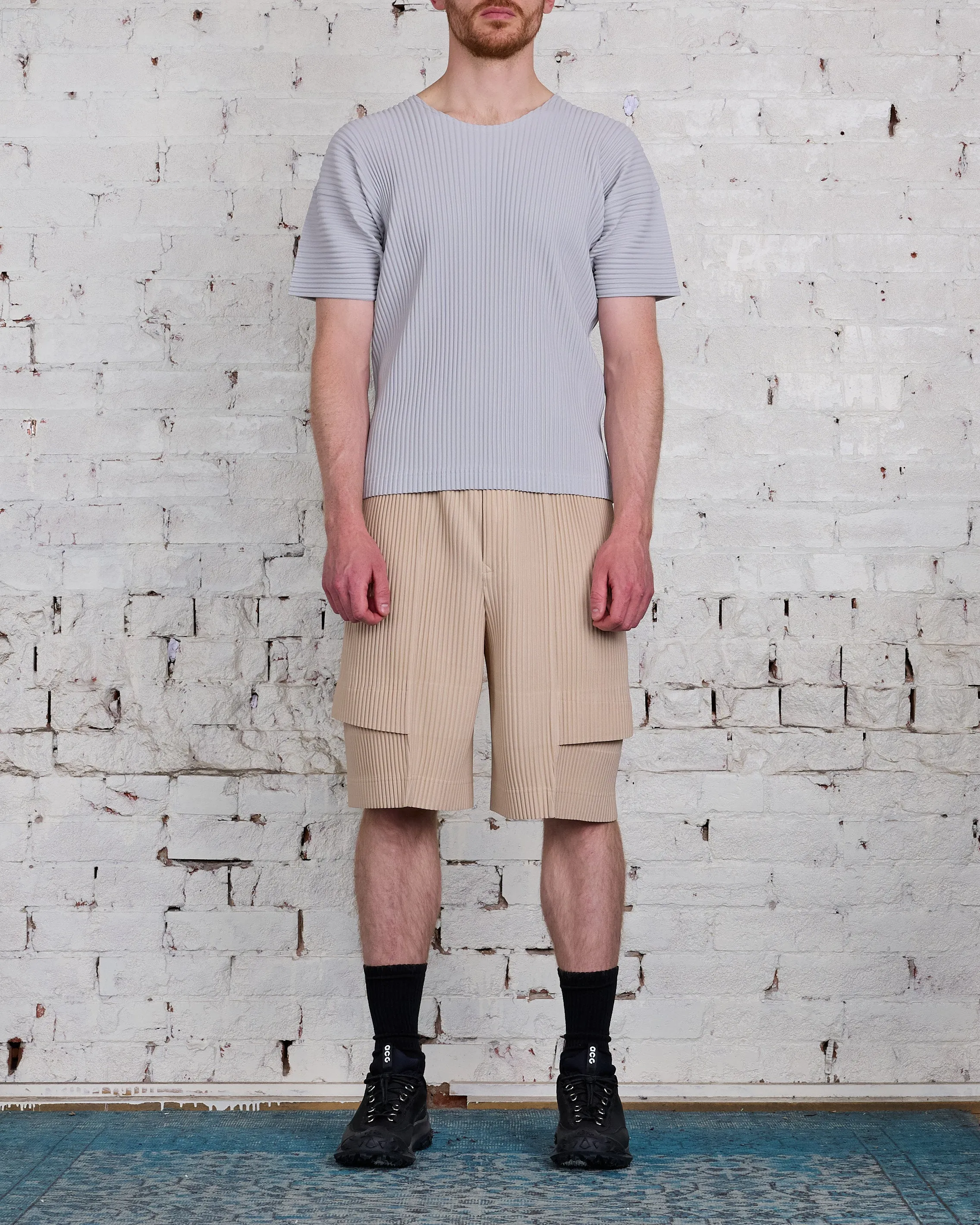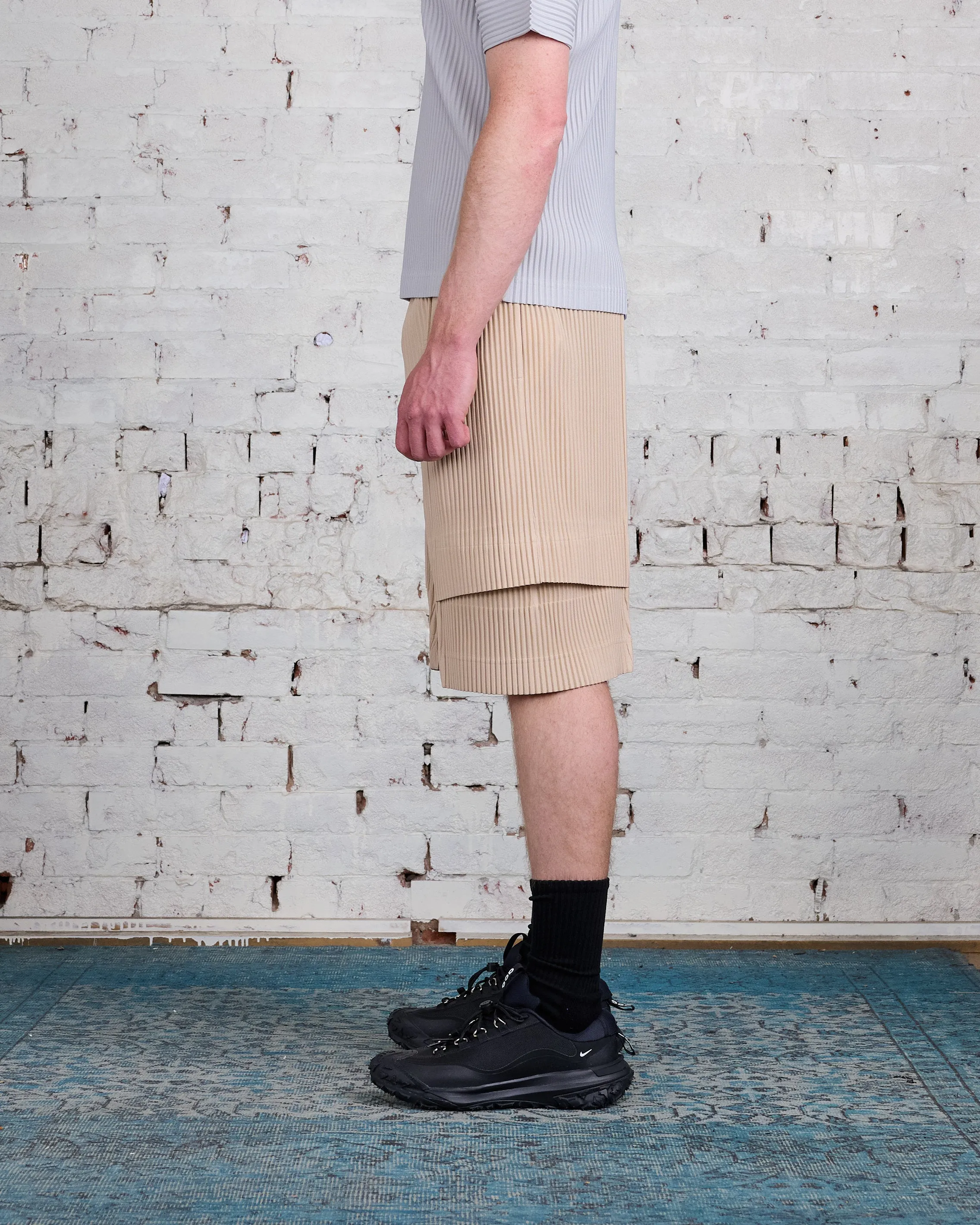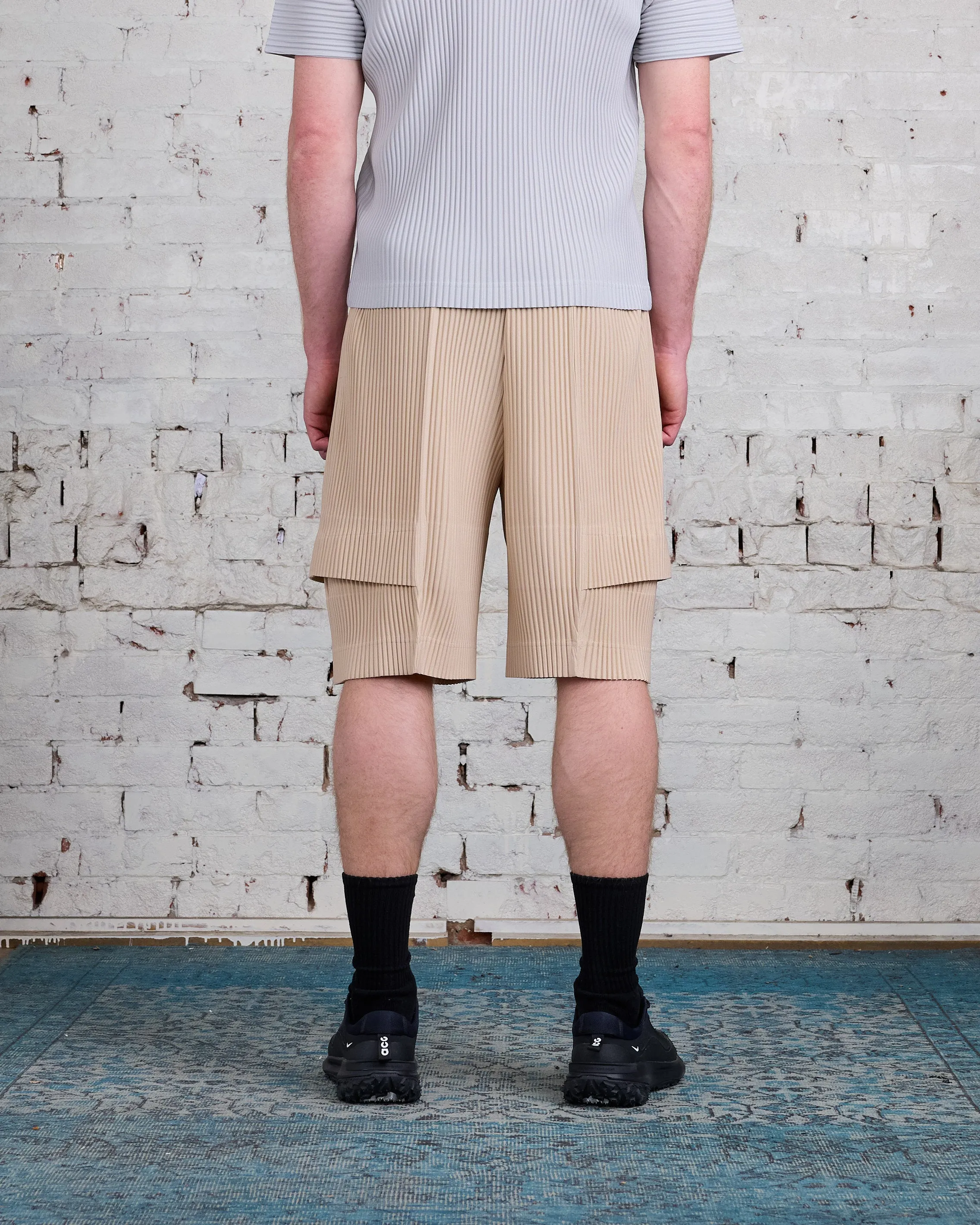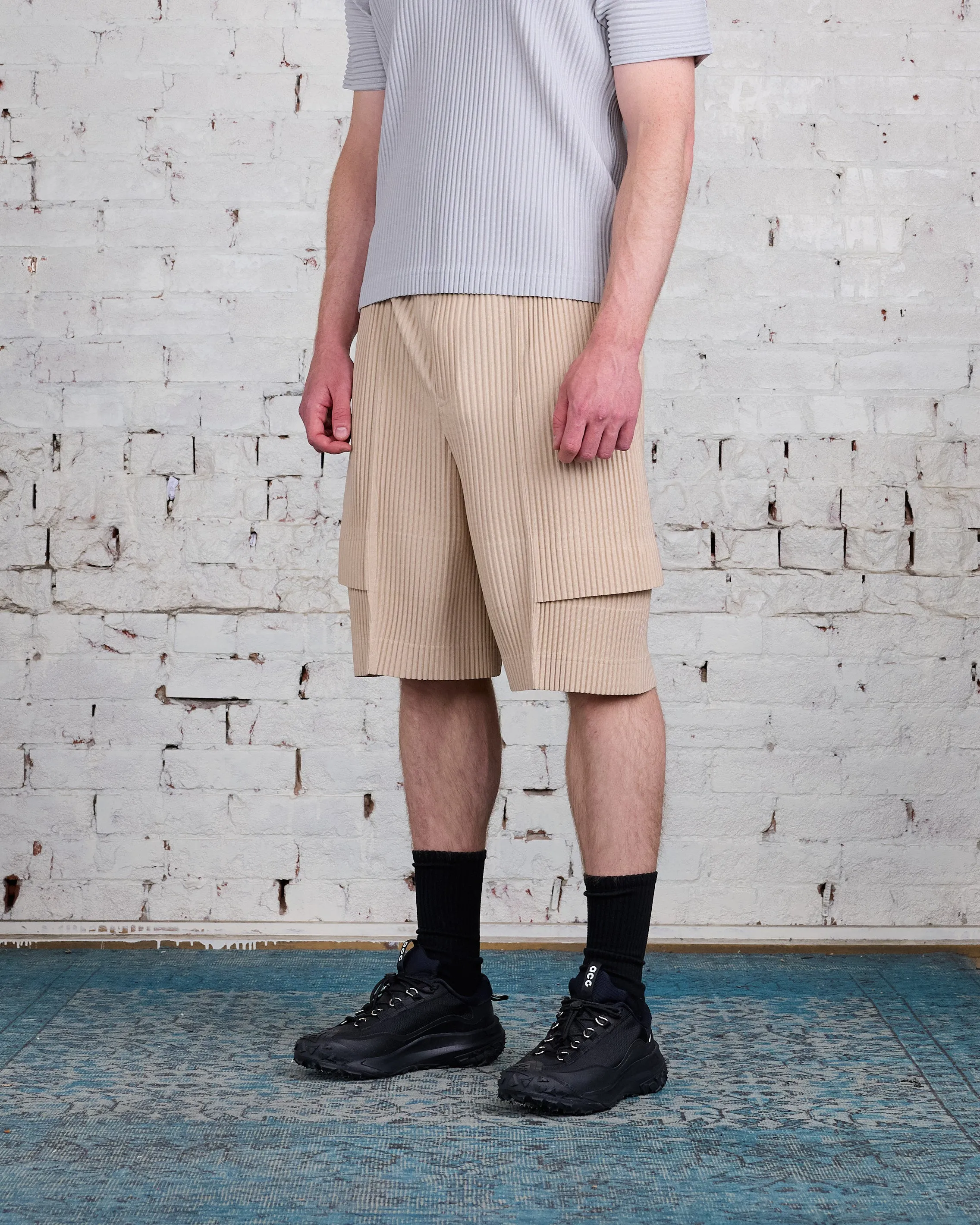 These shorts are made from pleated material with a cargo pants design. They are characterized by their bold tucks. They have pockets on both sides and an inner drawcord. They have a front-opening buttoned fly.