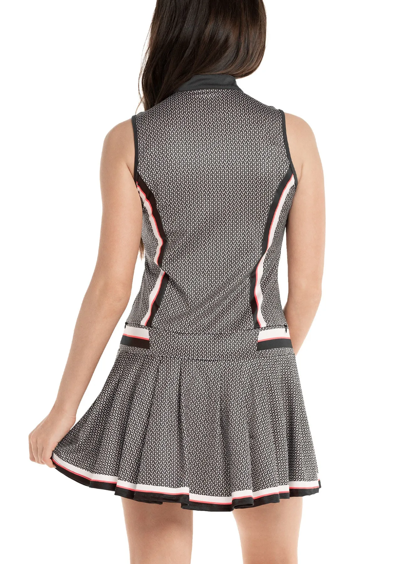 We brought the intensity in this eye-catching dress. Sophisticated ditzy patterns and bold coral crush color blocking bring a fun sporty look to the course. The drop waist dress also features a mock neck line, fuller back, shortie and zip back pocket for functionality.