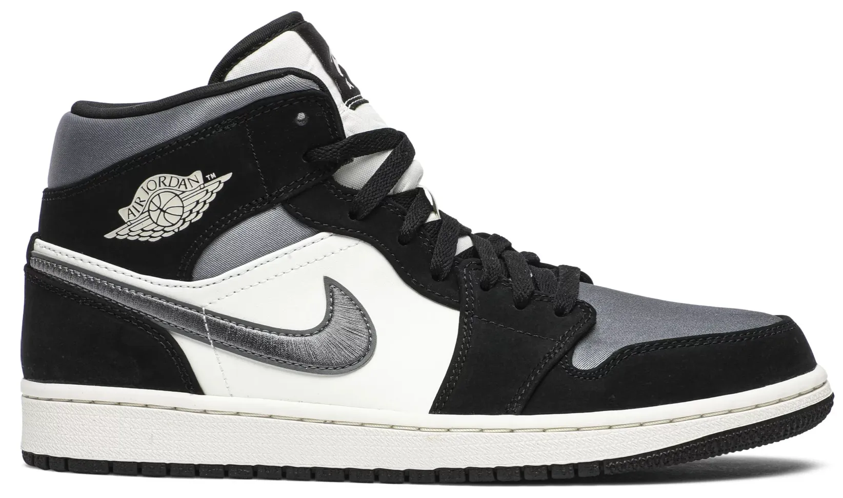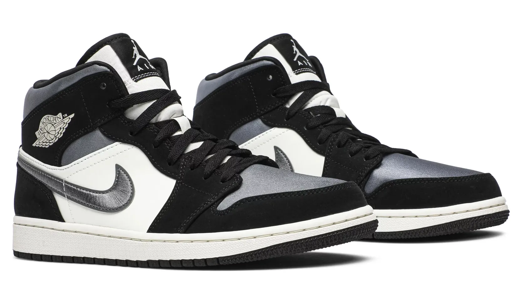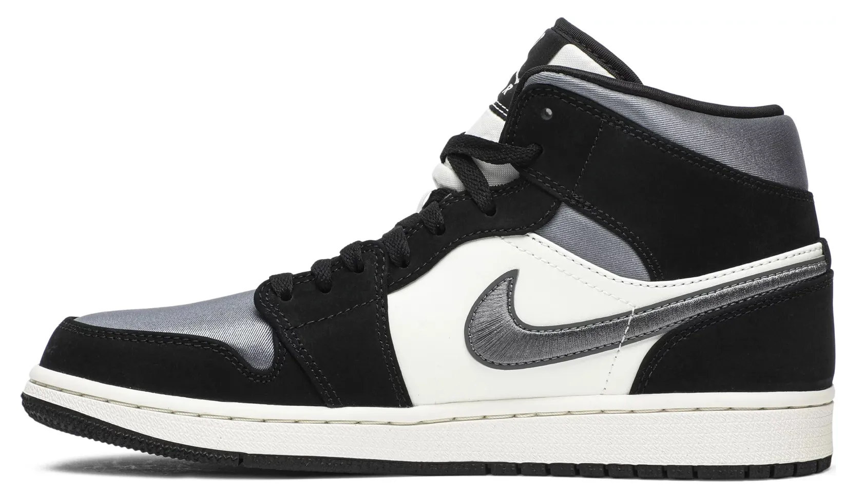 The Air Jordan 1 Mid SE 'Satin Smoke Grey' showcases the timeless appeal of the AJ1 silhouette, updated here with a neutral color scheme and nontraditional materials. The upper is constructed from a blend of white leather at the quarter panel and shiny grey satin at the toe box, collar and Nike Swoosh. Black suede overlays are applied to the forefoot, heel and collar, the latter featuring a classic Wings logo on the lateral side.