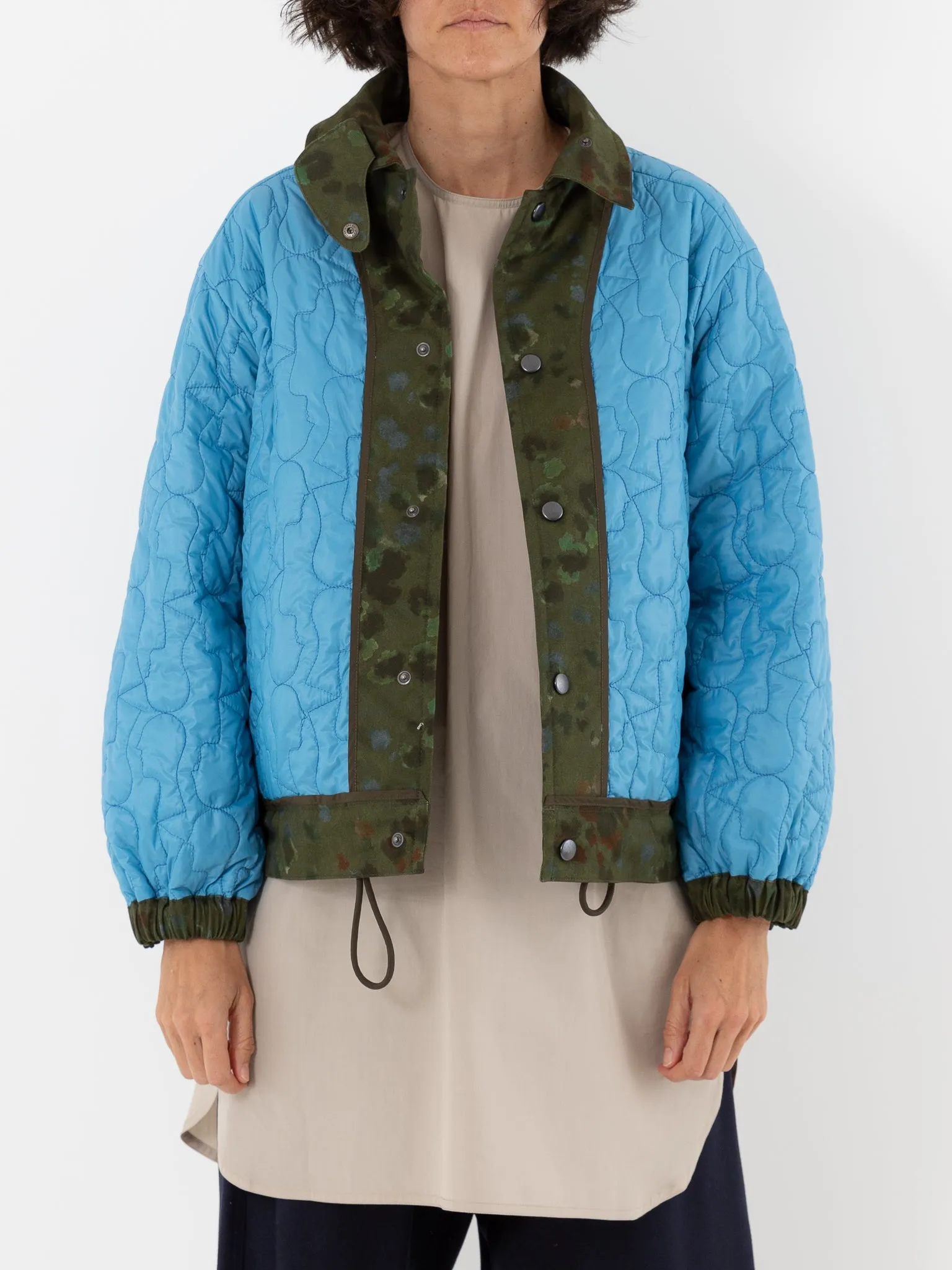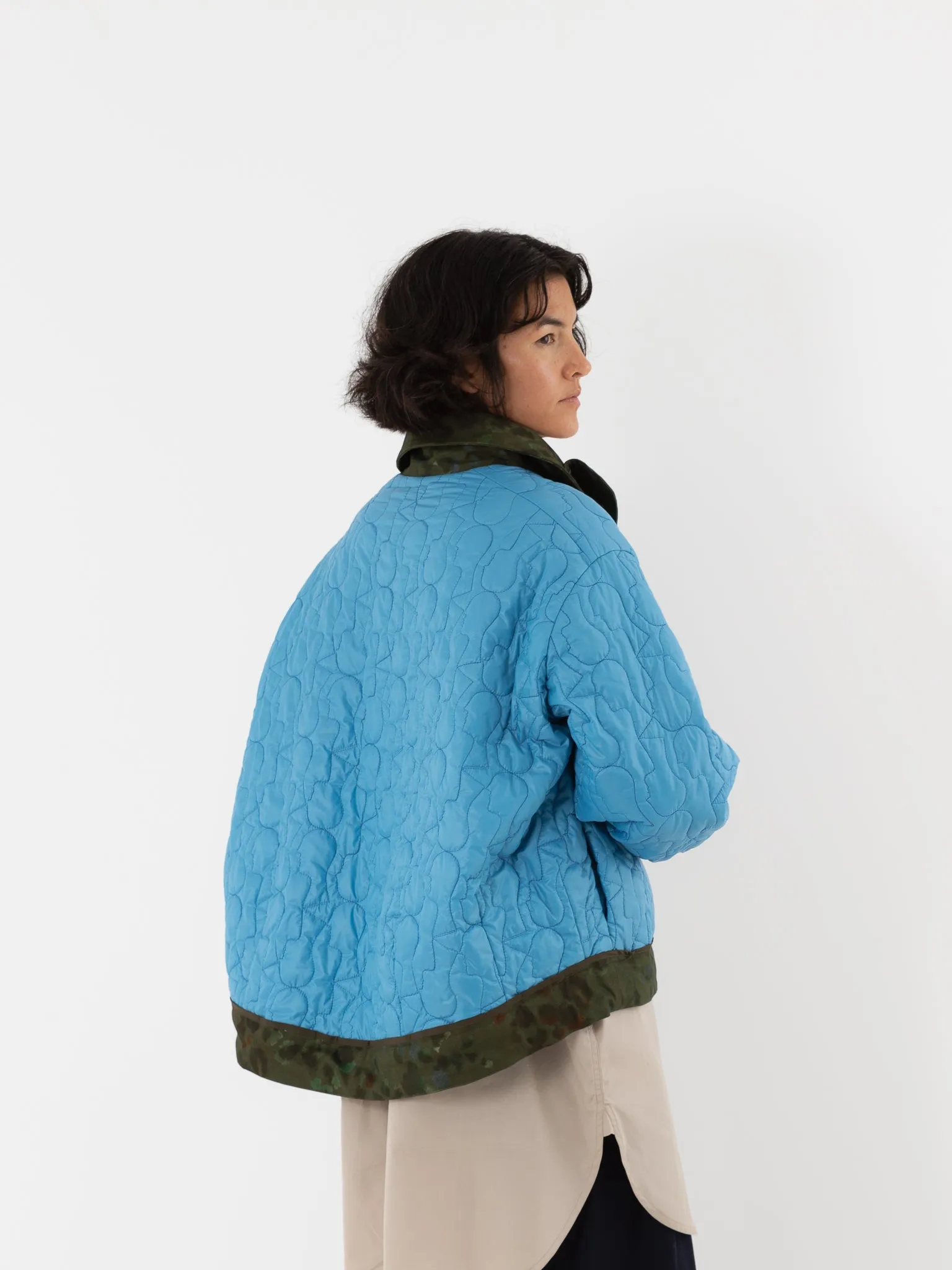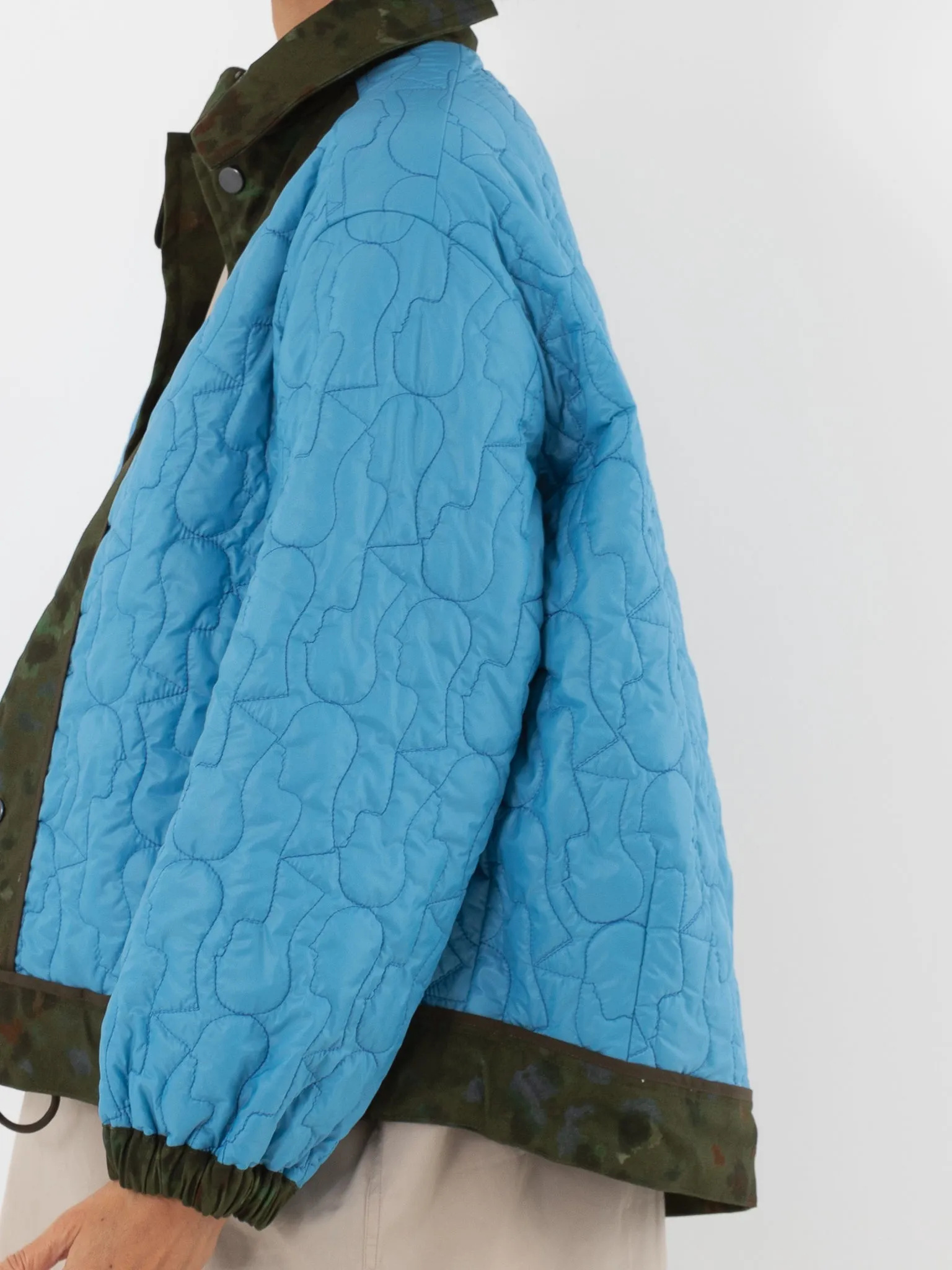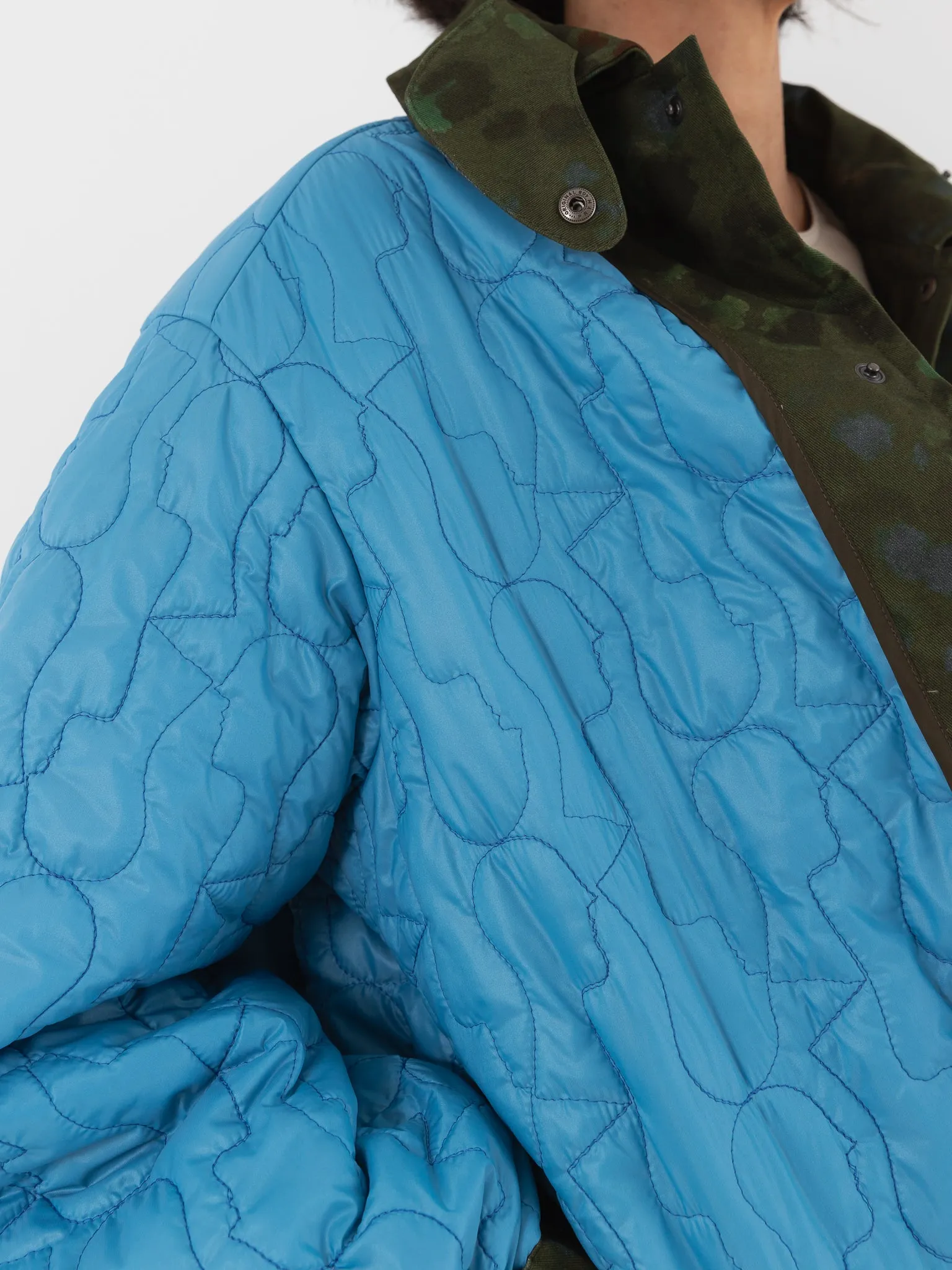 Konrad EV Coat in Painters Apron/Sea. Reversible coat with "heads" silhouette quilting on one side and a soft cotton print on the reverse. Snap closure with a collar that can be worn upright with a snap tab for extra warmth. One side is an abstract painterly print with large welt pockets, while the reverse is bright blue with slit pockets. The sleeves have an elastic cuff. To wear on the reverse side, simply feed the cloth label through the slit to hide it on the other side.