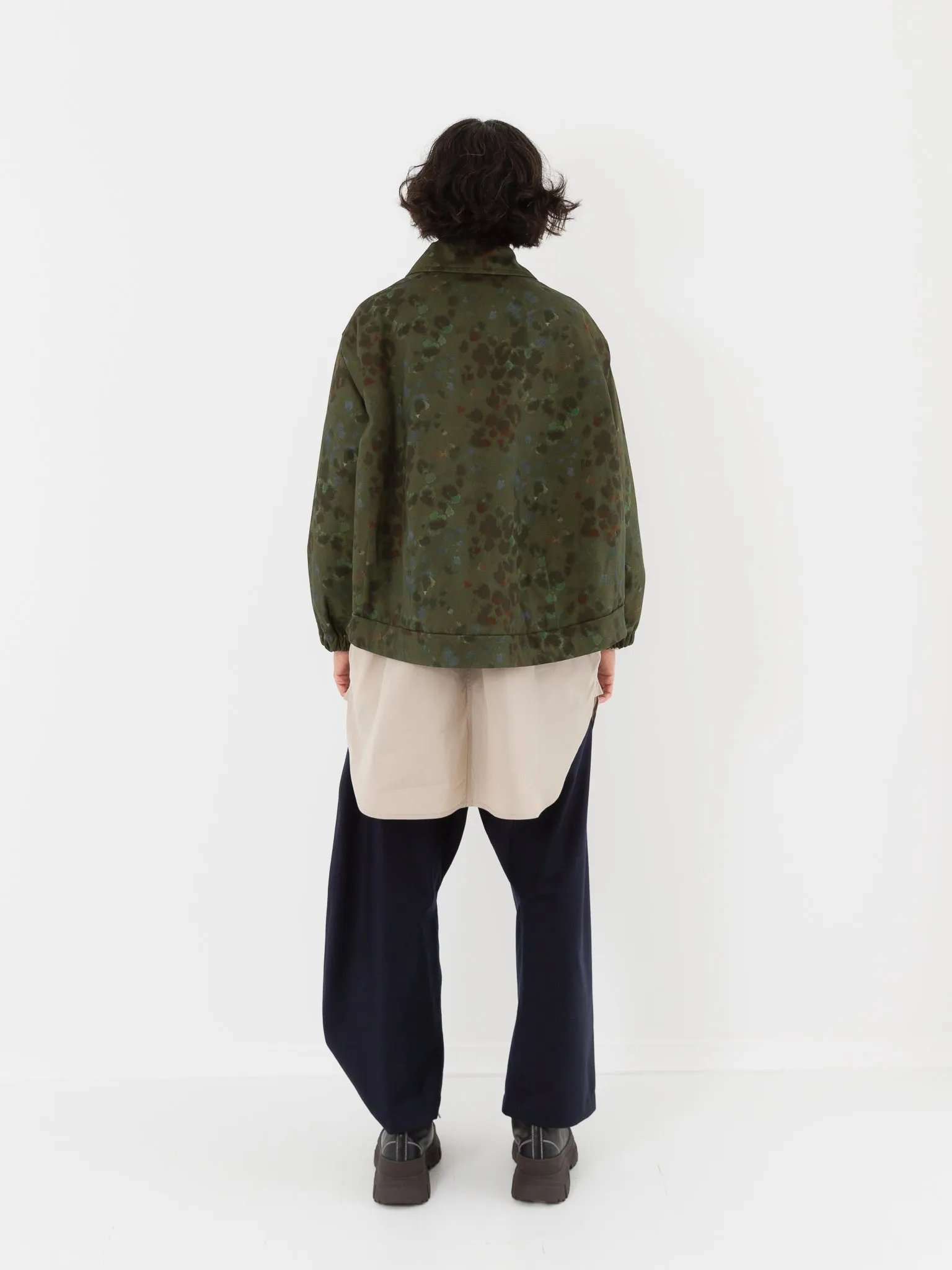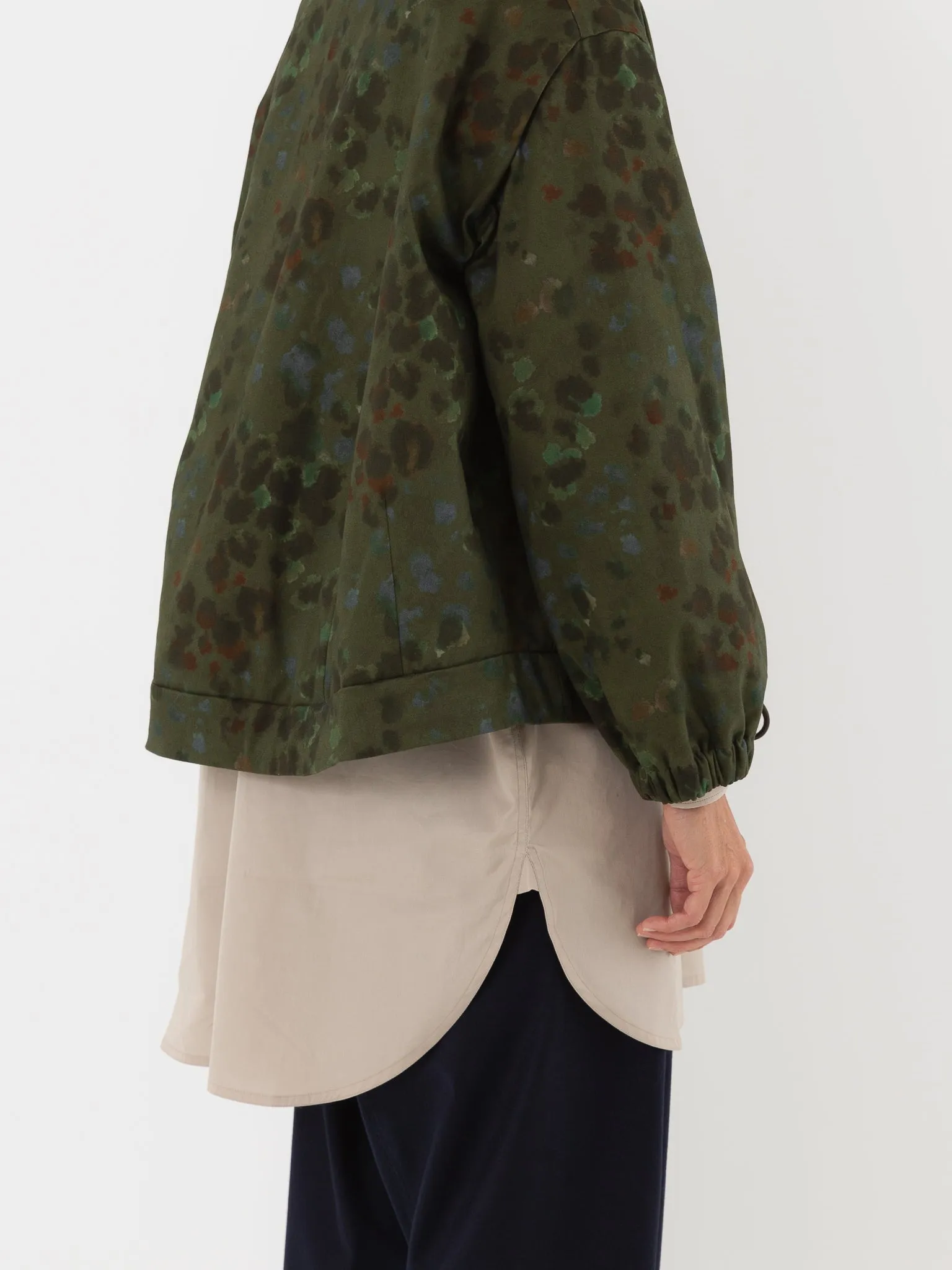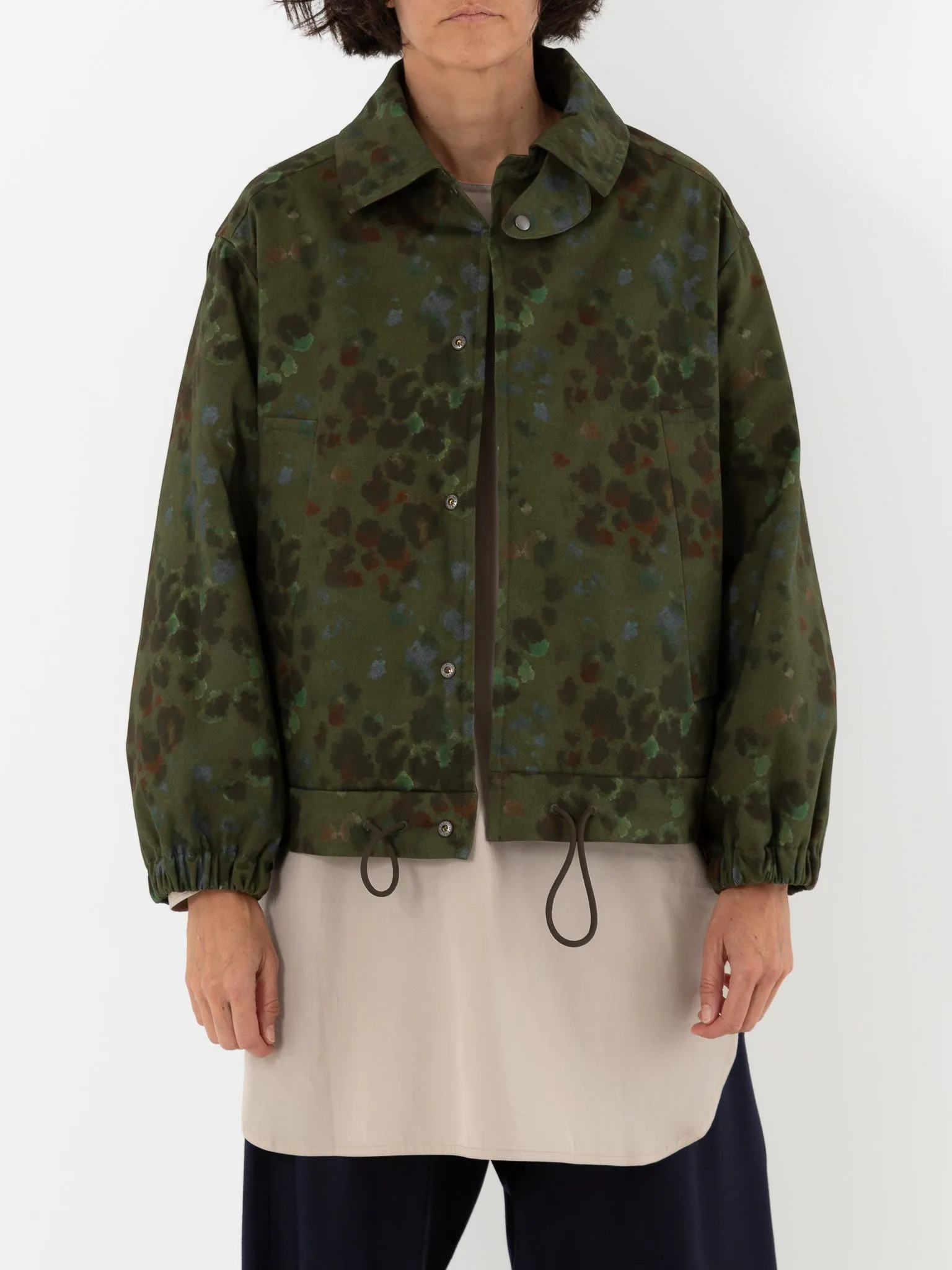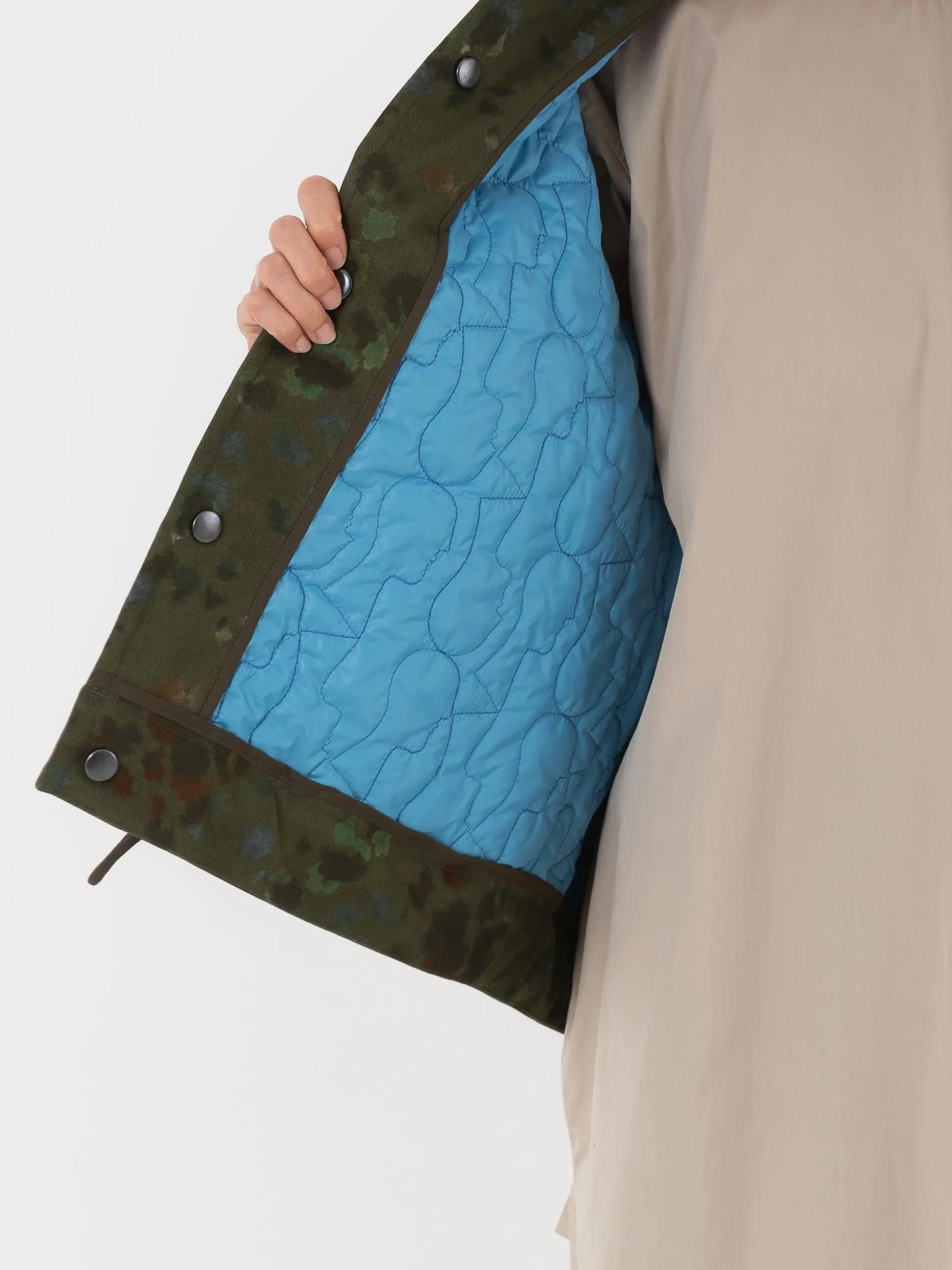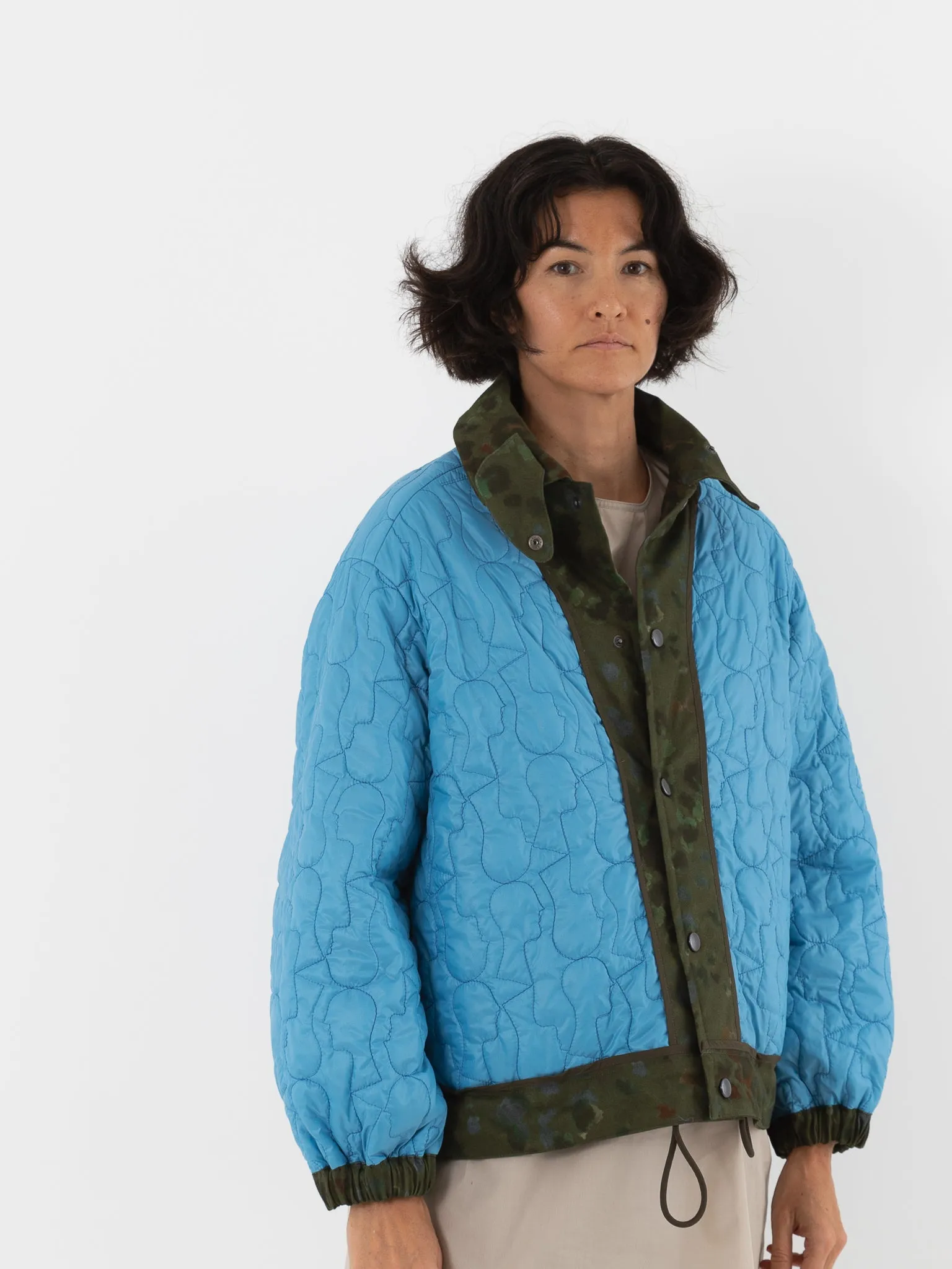Konrad EV Coat in Painters Apron/Sea. Reversible coat with "heads" silhouette quilting on one side and a soft cotton print on the reverse. Snap closure with a collar that can be worn upright with a snap tab for extra warmth. One side is an abstract painterly print with large welt pockets, while the reverse is bright blue with slit pockets. The sleeves have an elastic cuff. To wear on the reverse side, simply feed the cloth label through the slit to hide it on the other side.