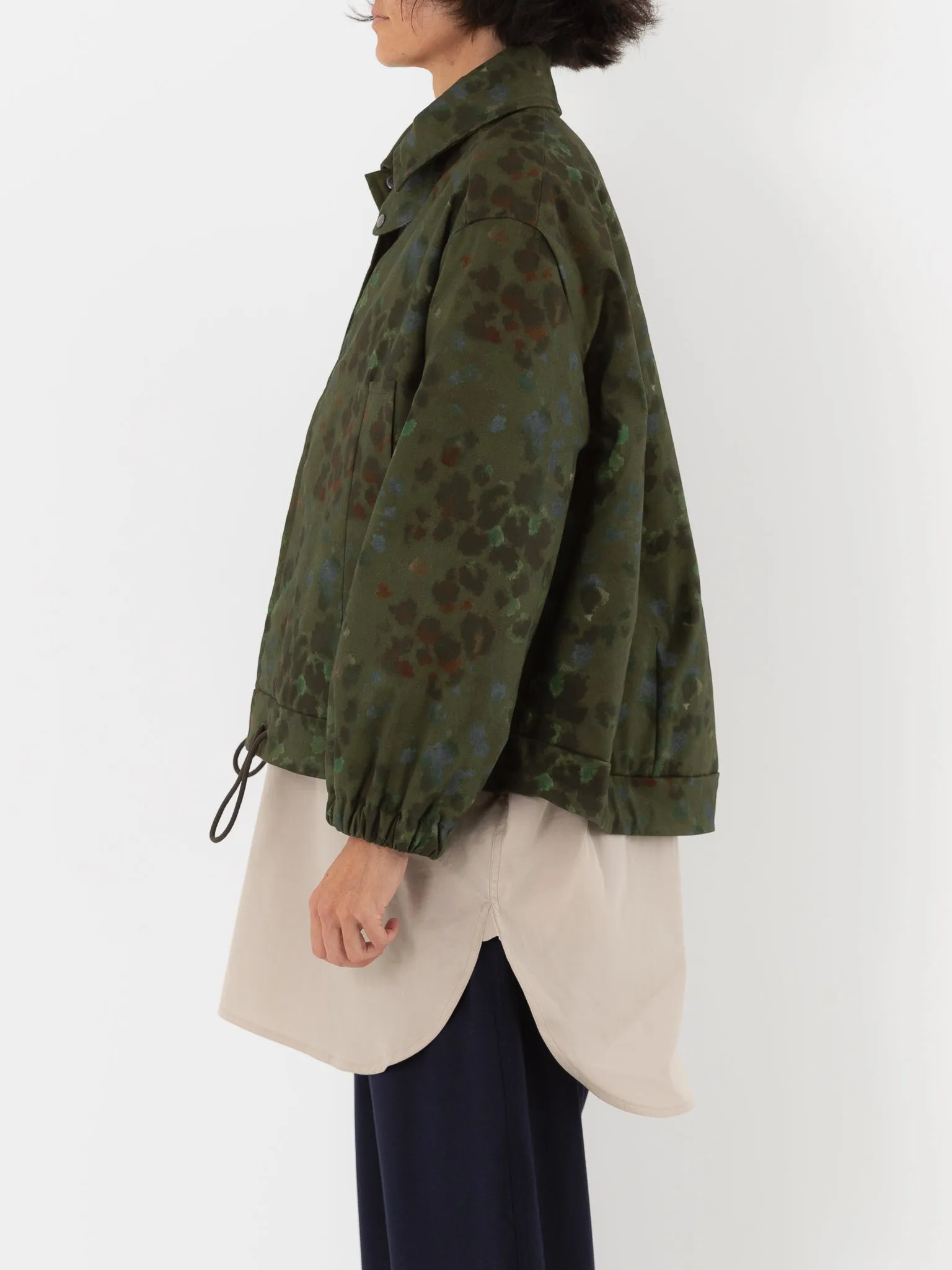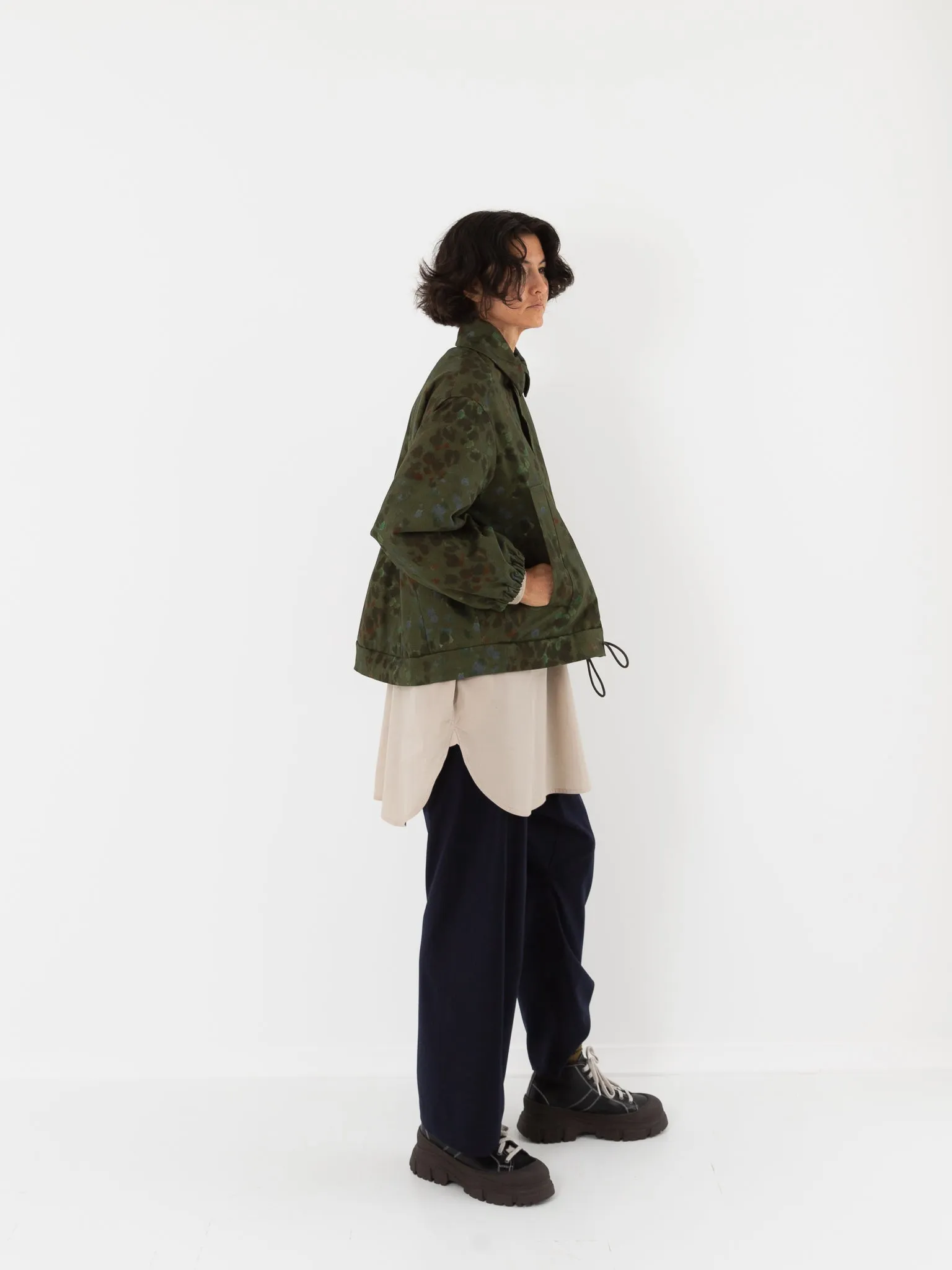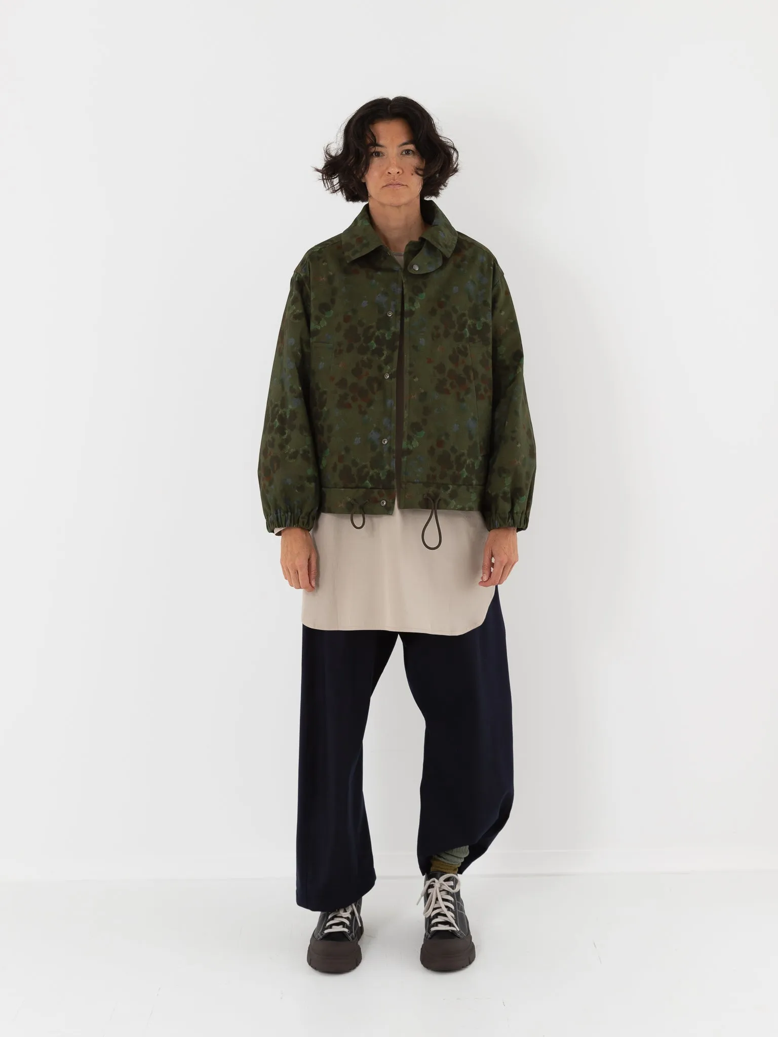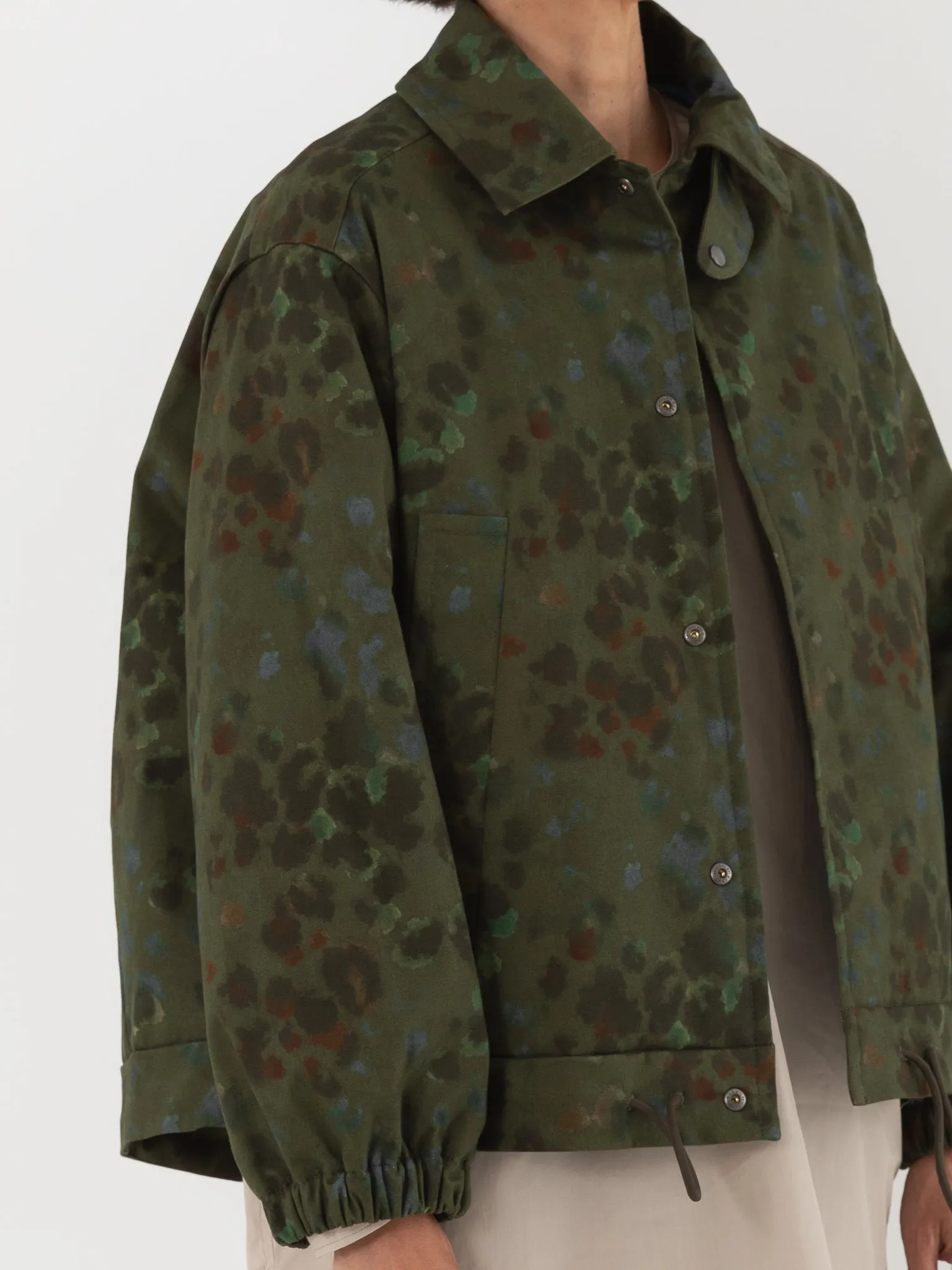 Konrad EV Coat in Painters Apron/Sea. Reversible coat with "heads" silhouette quilting on one side and a soft cotton print on the reverse. Snap closure with a collar that can be worn upright with a snap tab for extra warmth. One side is an abstract painterly print with large welt pockets, while the reverse is bright blue with slit pockets. The sleeves have an elastic cuff. To wear on the reverse side, simply feed the cloth label through the slit to hide it on the other side.