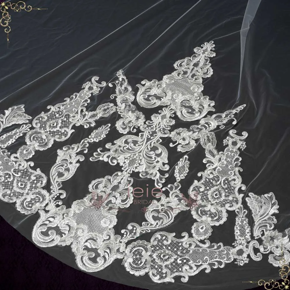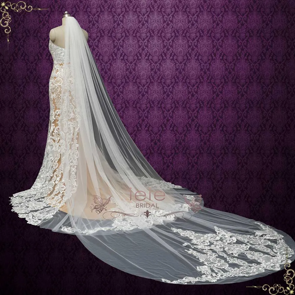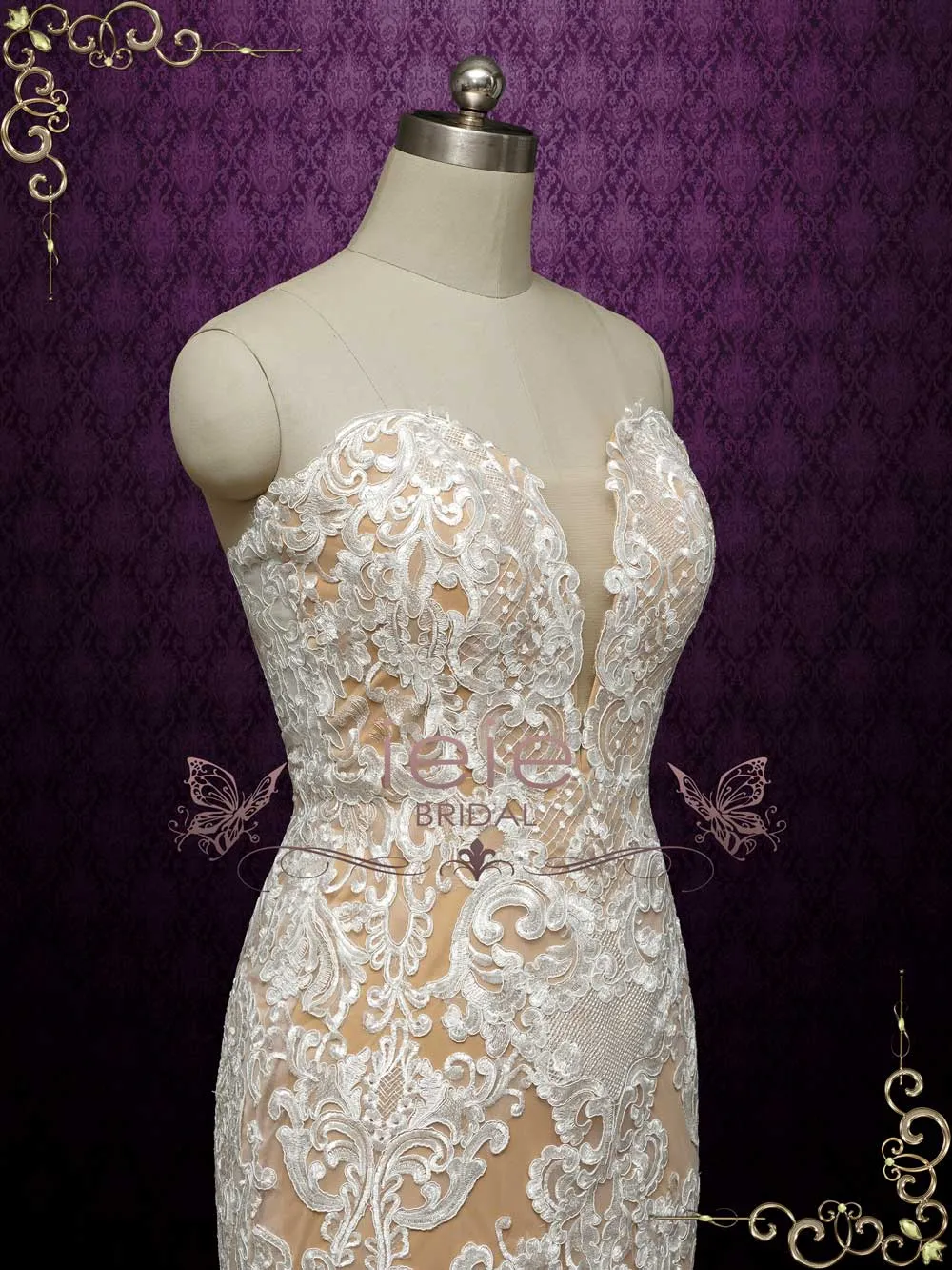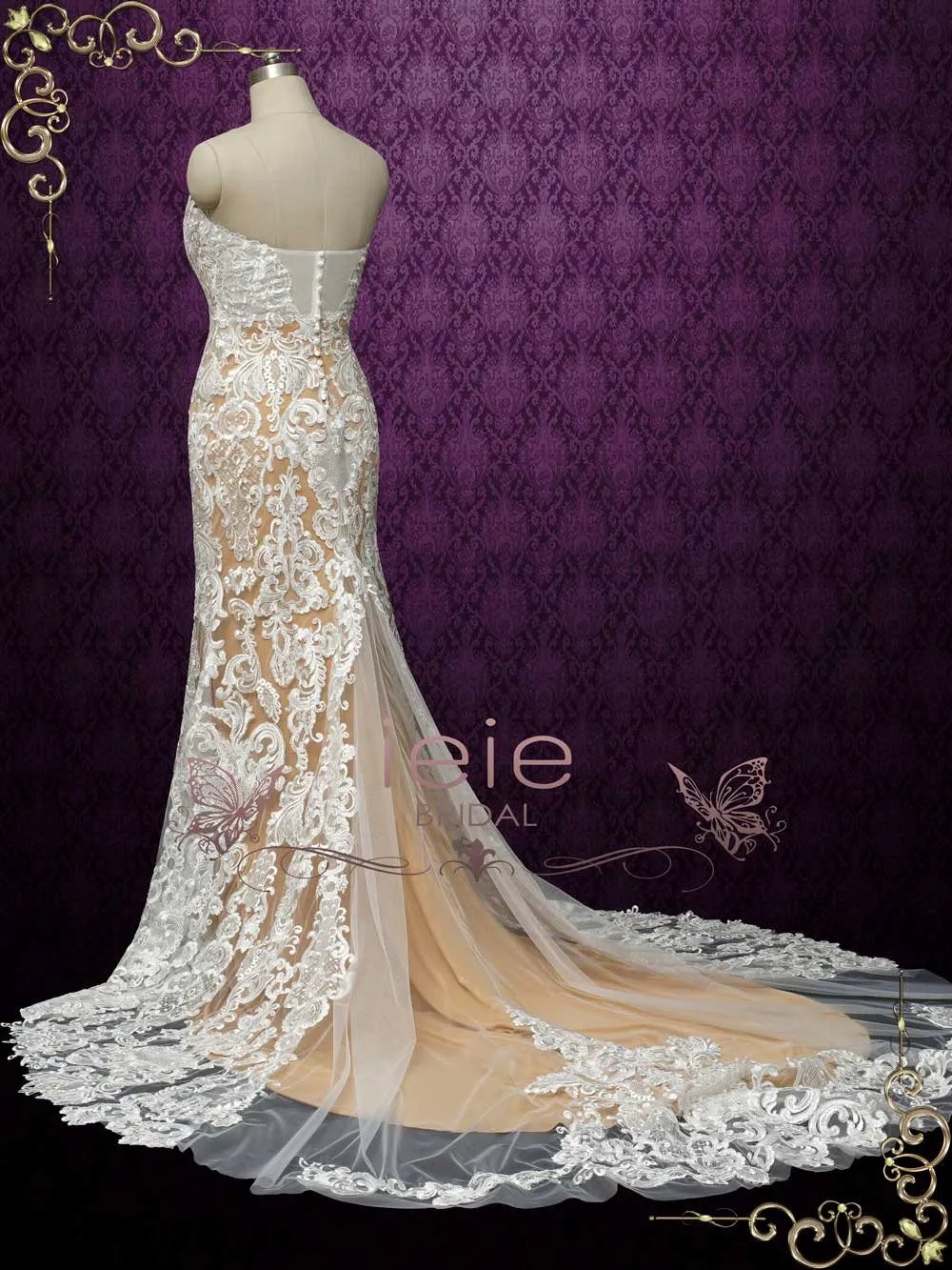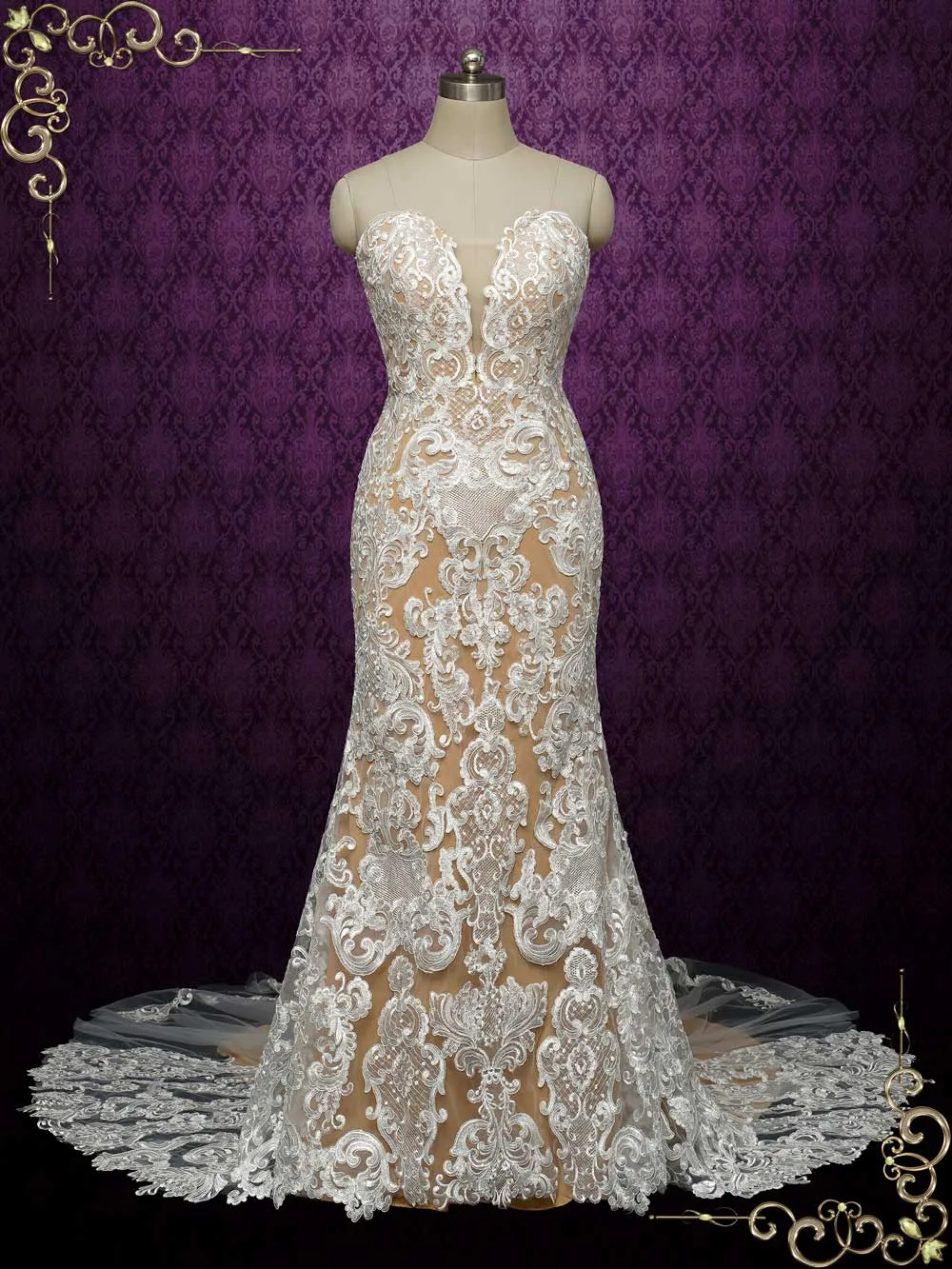 Introducing ISADORA's Mermaid Lace Wedding Dress with Matching Veil: a luxurious and romantic ensemble featuring a fitted mermaid silhouette and exquisite European lace. The strapless sweetheart neckline adds a sexy and timeless touch, while the matching veil complements the design and completes the look.