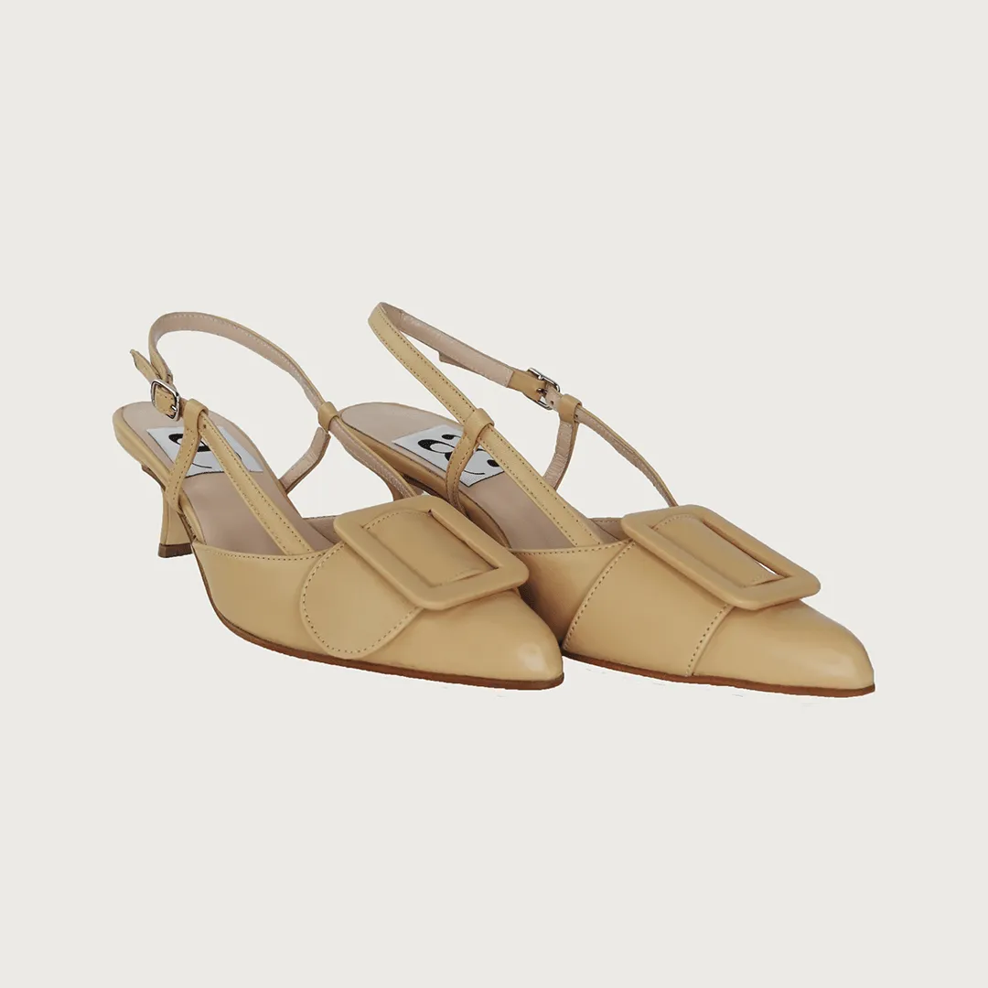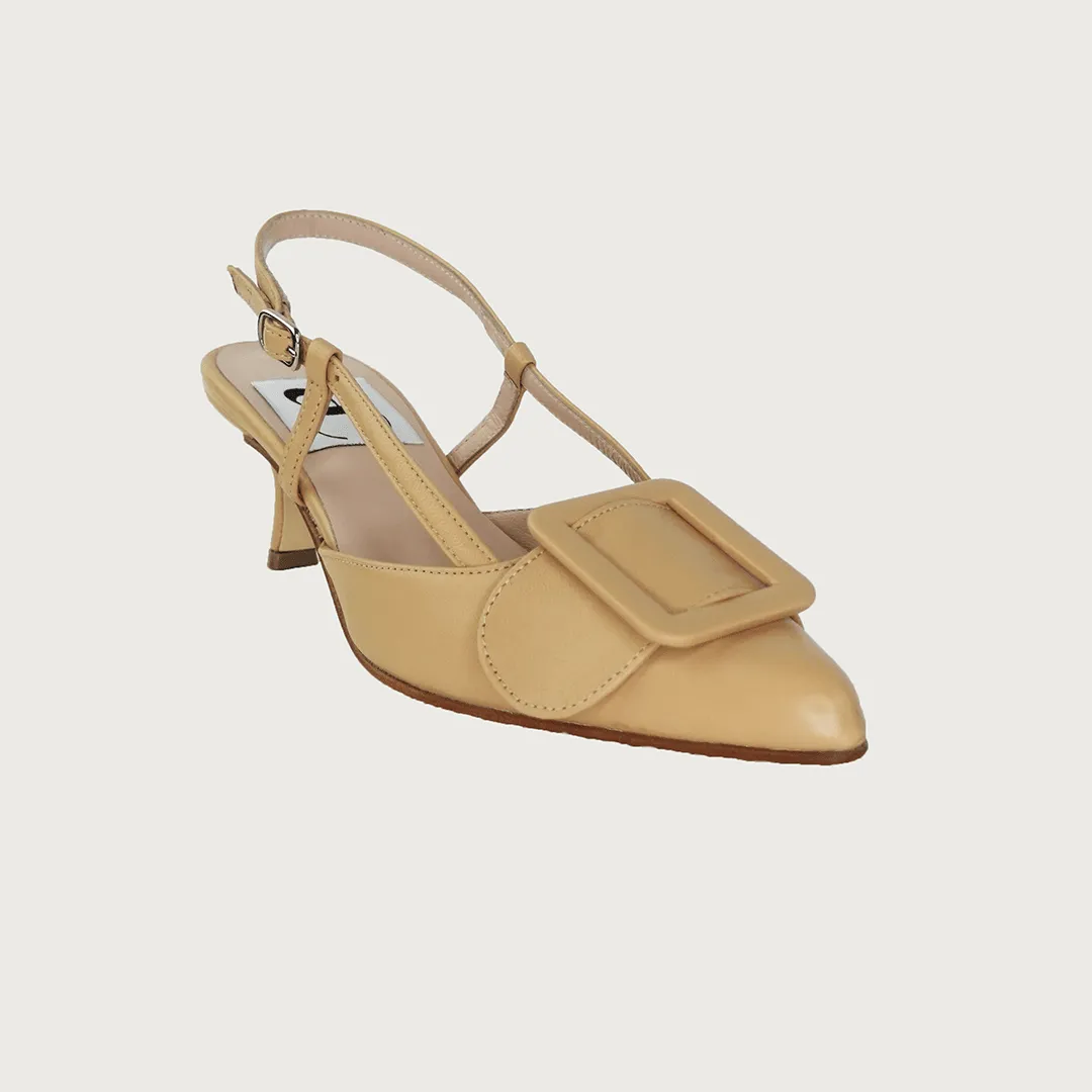 Drawing inspiration from our popular MILK design, the sophisticated Mia leather kitten pump boasts a sleek silhouette. Featuring a refined ankle strap adorned with a striking buckle, this pointy-toe everyday heel exudes contemporary charm. Embrace both elegance and comfort with every wear.
