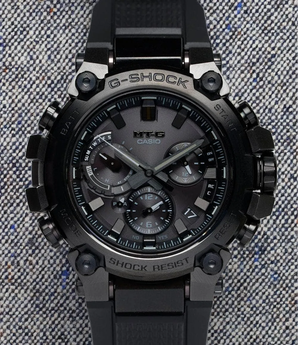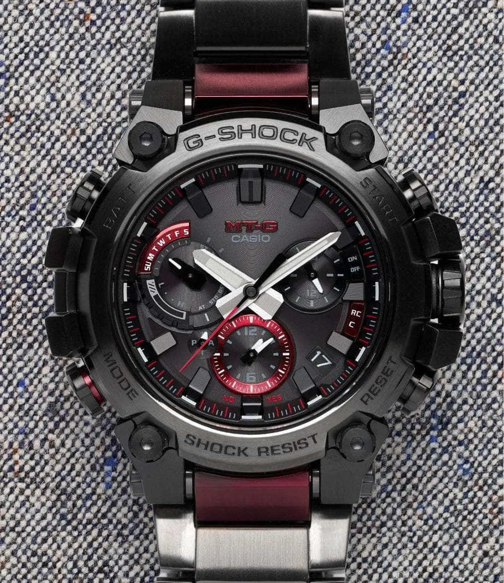 G-SHOCK’s “MT-G” series consists of premium models that pair advanced internal modules with metal exterior case components to create an elevated take on the brand’s legendary bomb-proof wristwatch. The G-SHOCK MTGB3000 series features an entirely analog display that is protected by carbon-reinforced resin enclosed by ion-plated stainless steel for an ultra-durable yet refined overall package.