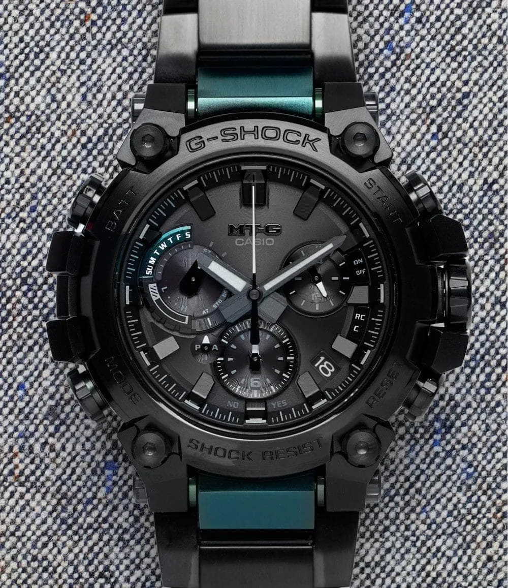Featuring an advanced Dual Core Guard structure, the 50.9mm by 51.9mm case of the MTGB3000 features a carbon-reinforced resin middle section that is enclosed by a steel bezel and a specially-formed steel case-back that extends upwards on the sides to meet the bezel and offer protection for the crown and buttons. The case-back’s unique integrated design also allows it to serve as the lugs for the watch, which include an innovative quick-release system that enables instantaneous tool-free strap changes. Fitted with a high-transparency sapphire crystal with a glare-resistant coating, the MTGB3000 measures just 12.1mm thick, making it significantly thinner than its predecessors without sacrificing any of the G-SHOCK collection’s legendary impact-resistance or durability. Completing the watch is either a soft urethane strap or a layered-composite bracelet, which consists of hollow metal segments encasing resin internal parts.