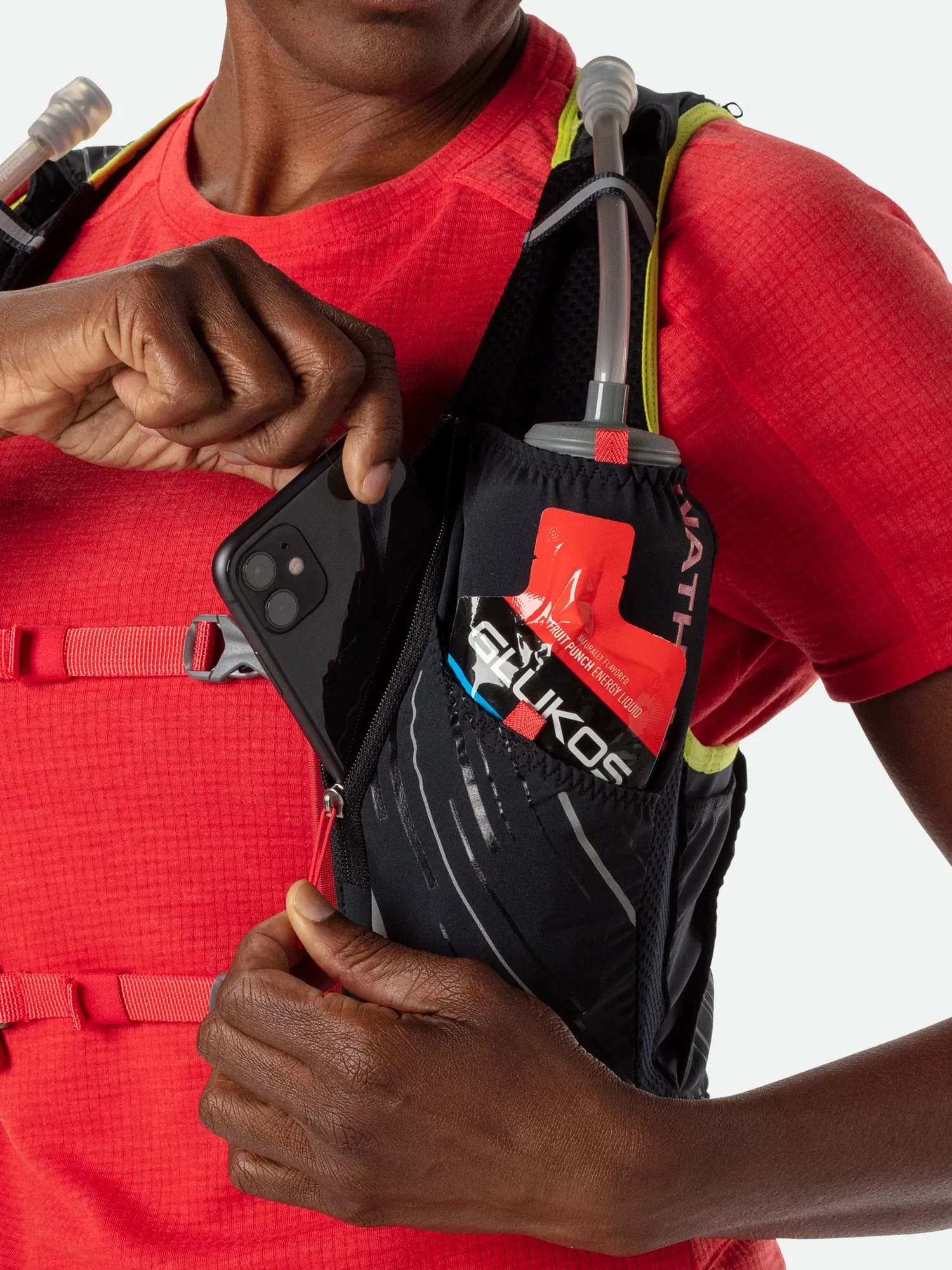 Thoughtful storage is always in reach including two new Kangaroo pockets allowing one side entry access point and a vertical pocket for larger items like trekking poles. Two water-resistant pockets are included on the chest for phone and a pill pocket complete with whistle. Side pockets allow for easy access to larger items and smaller things like keys and nutrition.