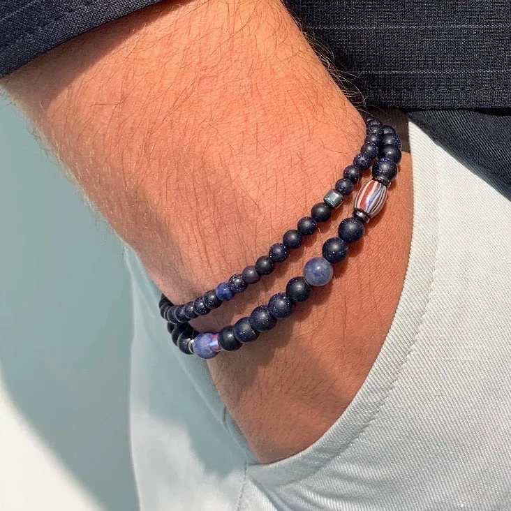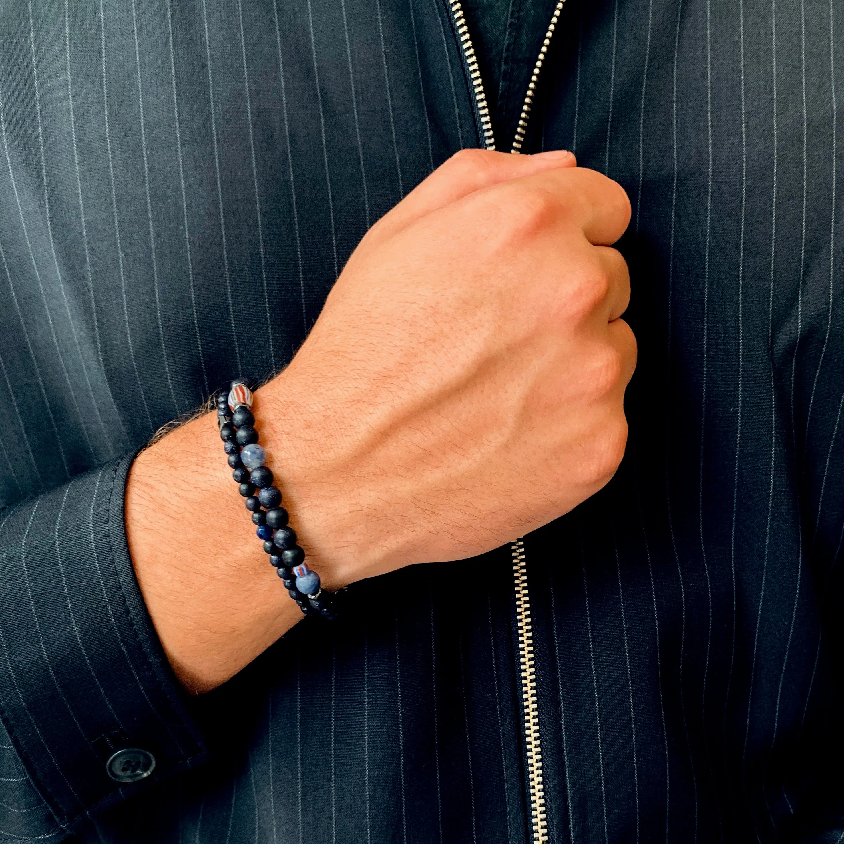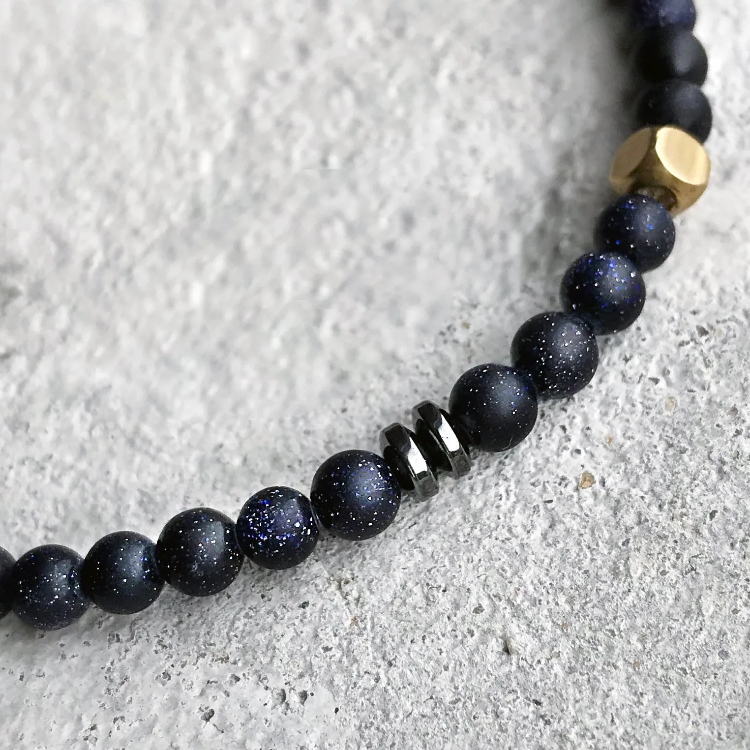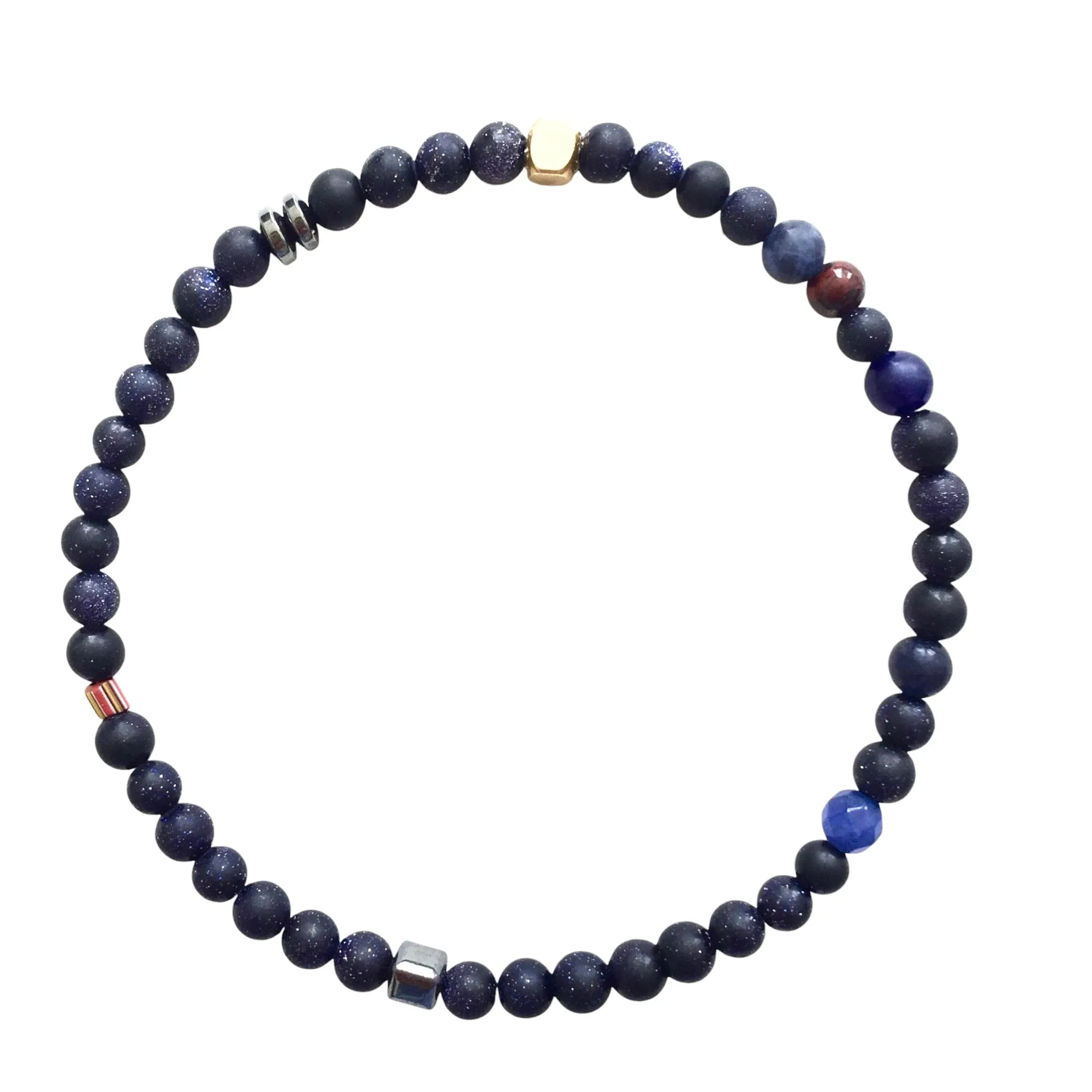 It's like looking into a dark blue night sky full of stars, Blue Sandstone has a stunning depth. In combination with Sodalite, Hematite, Jasper, Striped Trade bead and Brass. Size beads 4mm. This unique piece is perfect for stacking.