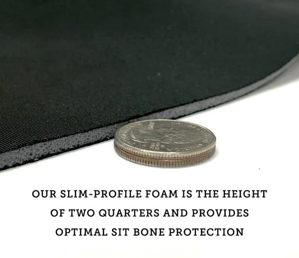 Our strategically placed technology is thin, but effective, boasting a slimness of a stack of two quarters. You’ll know you have them on, but no one else will! And, your sit bones will thank you!