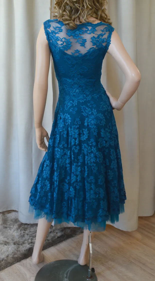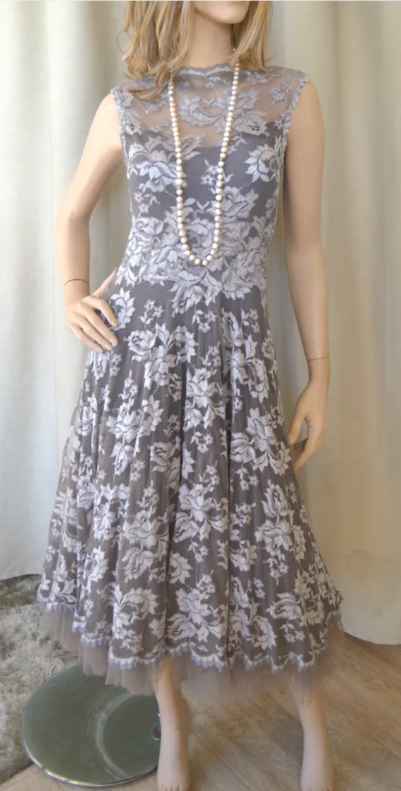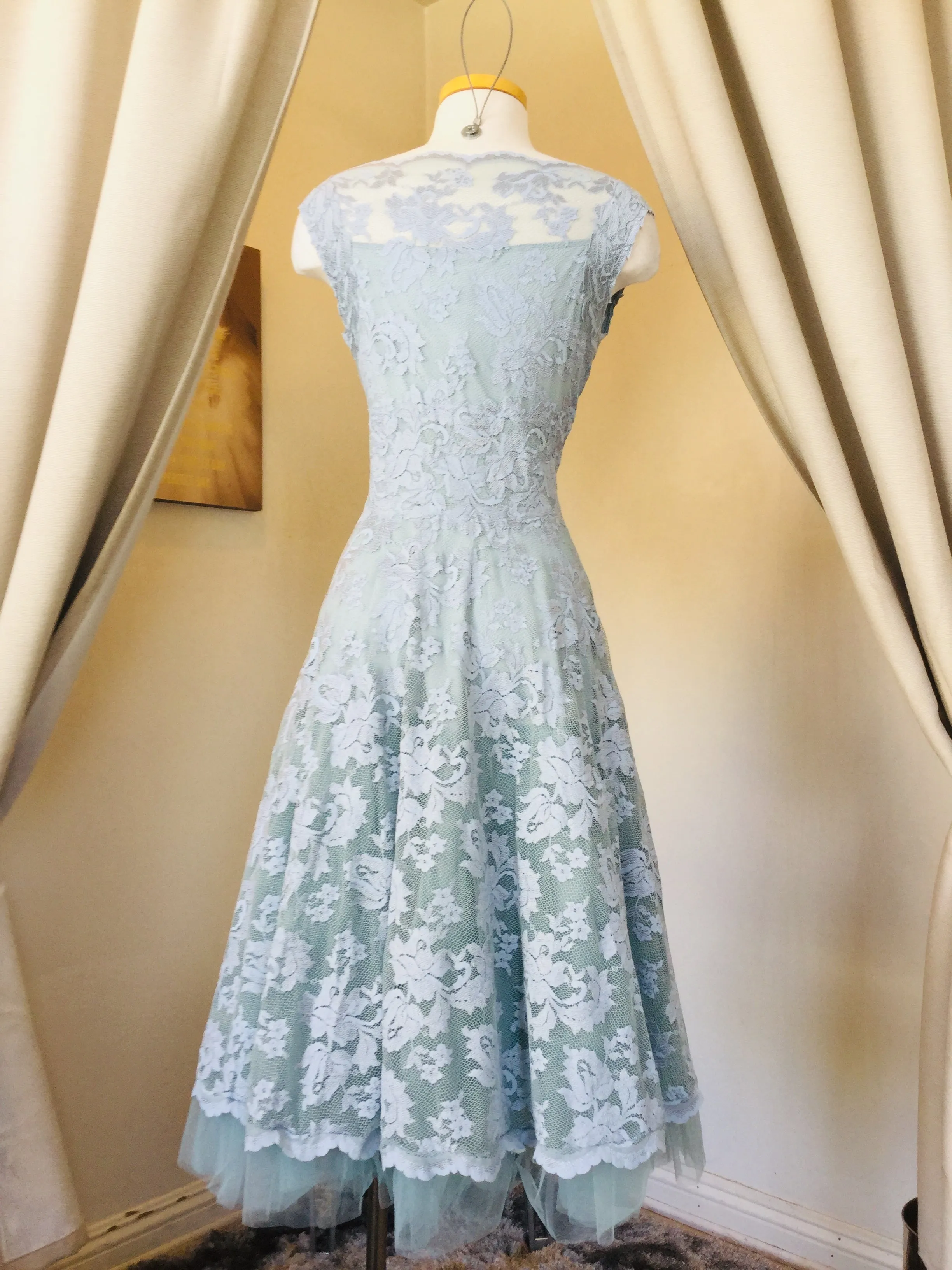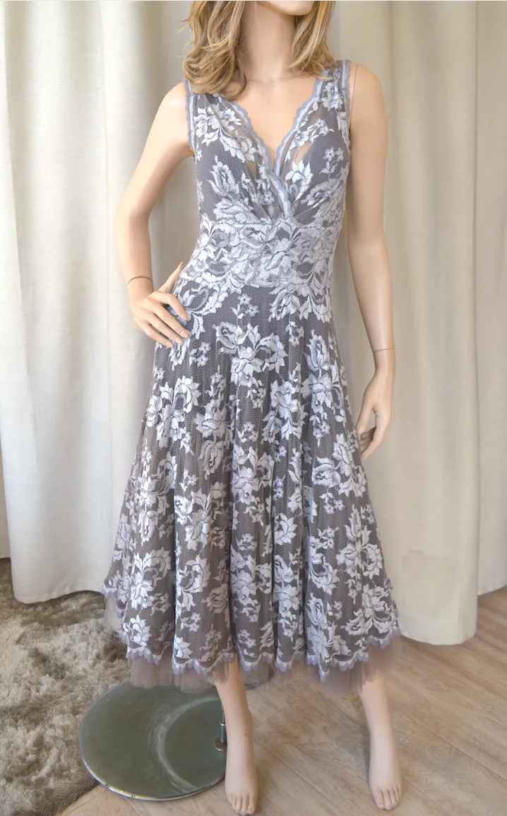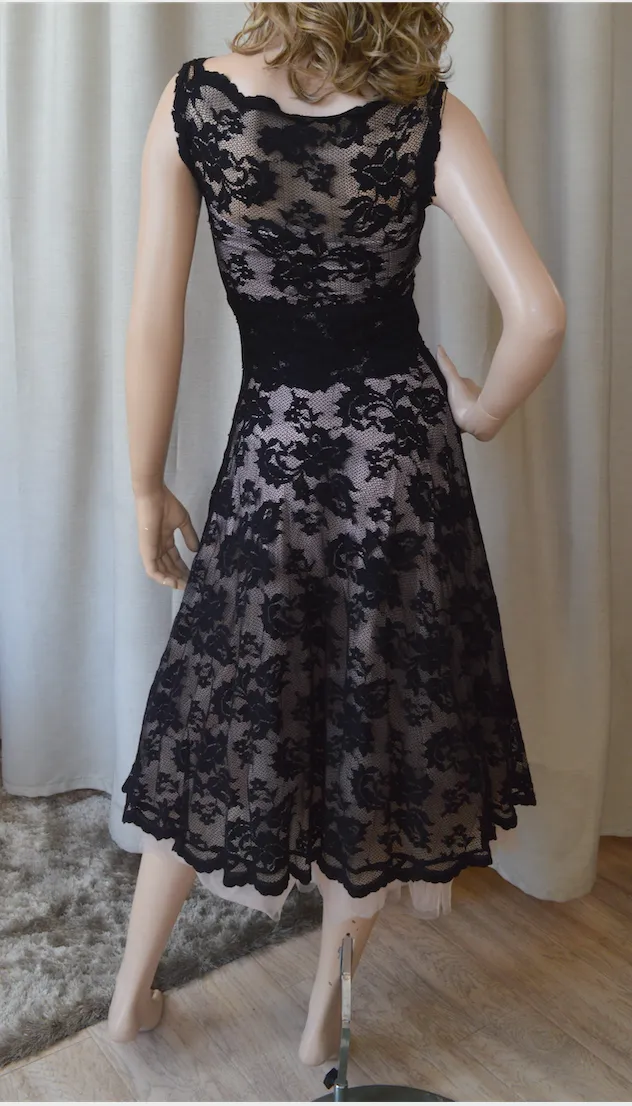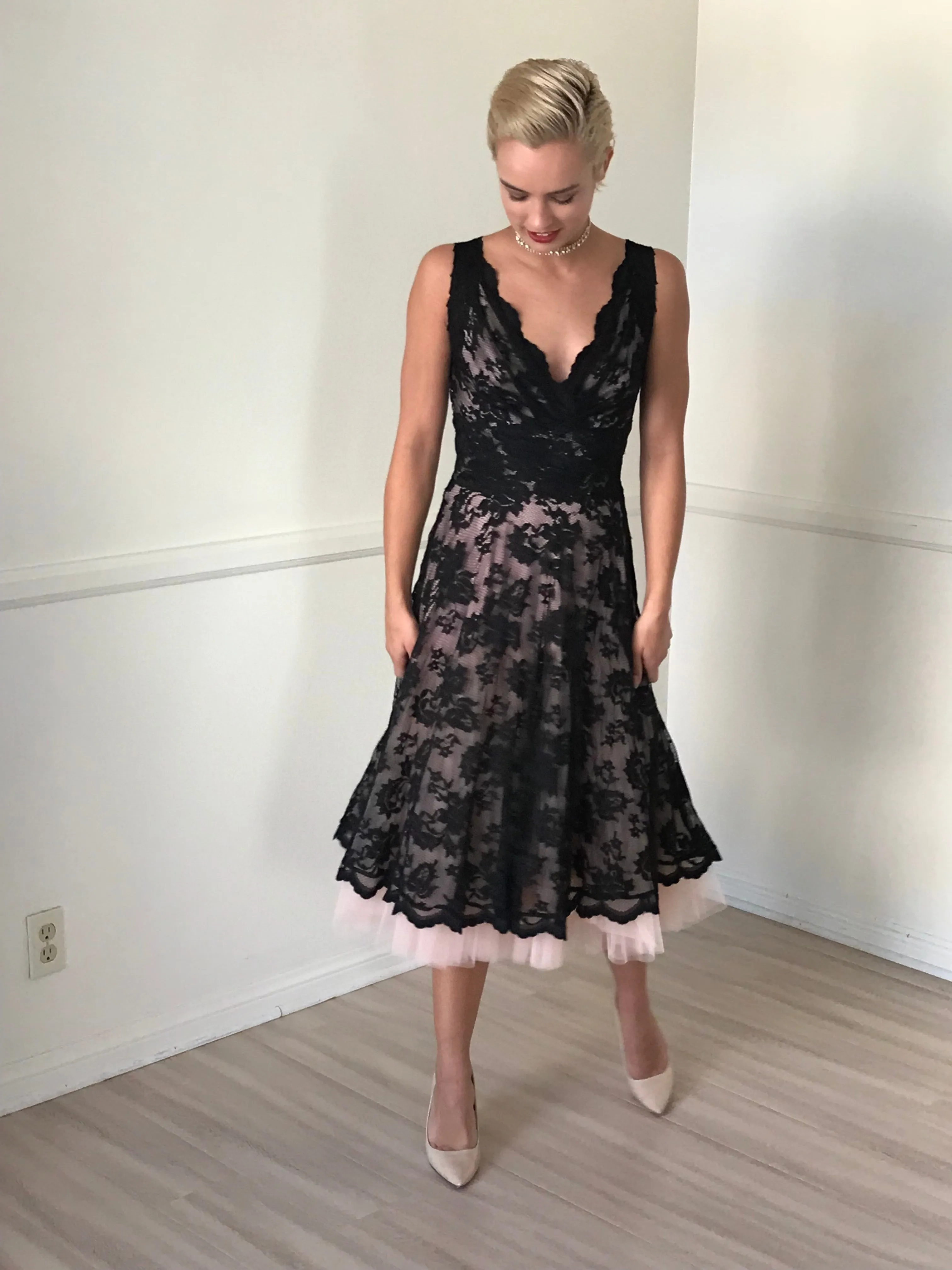 Lace Grace Kelly Dress. This is What I Call A Dream Dress! The Fit Is Outstanding, Regardless Of Size Or Body Type. Fitted On Bodice Area, Then Gradually Has Different Layers Of Tulle Under, That Go From Higher To Lower, Which Avoids Adding Volume To The Skirt, But Instead It has Just Enough Weight and Volume to Have it Perform Beautifully As You Walk, Stroll, Dance Or Just Stand. This is a Timeless, Magical, Gorgeous Dress! It's a Blend Of Sophisticated, Playful, Ultra Feminine, Yet Not Girly. Perfect For... Well... Whatever you want really, from a Nice Dinner, to a Cocktail Party, Even Black Tie Event, The Opera, Garden Weddings, Fundraising Events, Etc. You Will Turn Heads Wearing This Dress, But People Will Love You. It is also reversible!Turn the dress around, and you are left with an elegant neckline in the front and a deep v in the back.