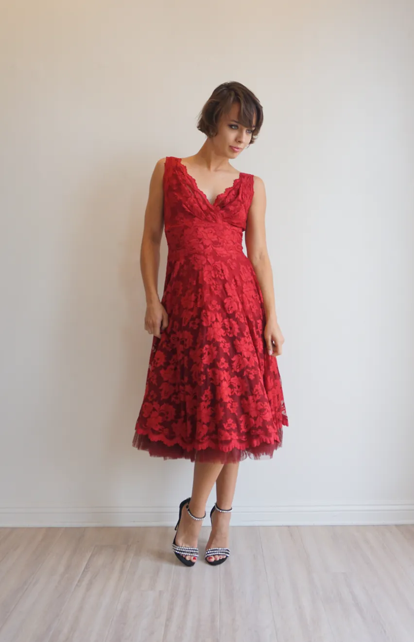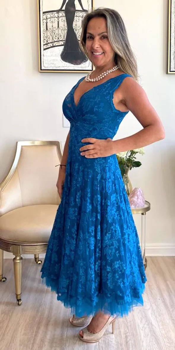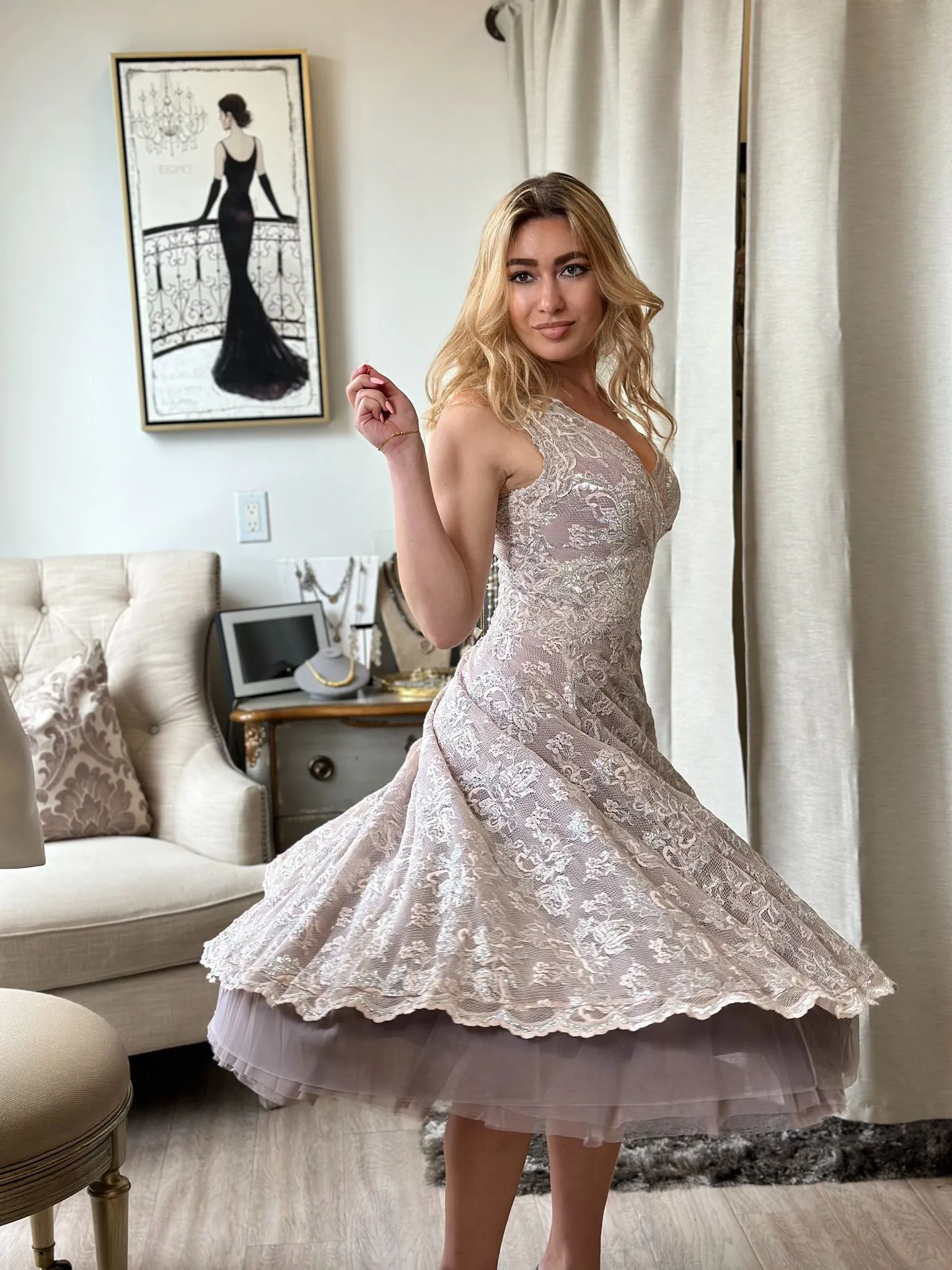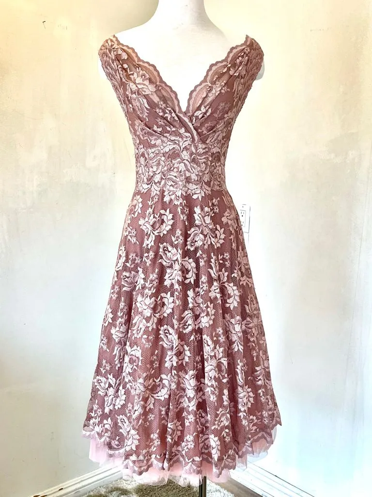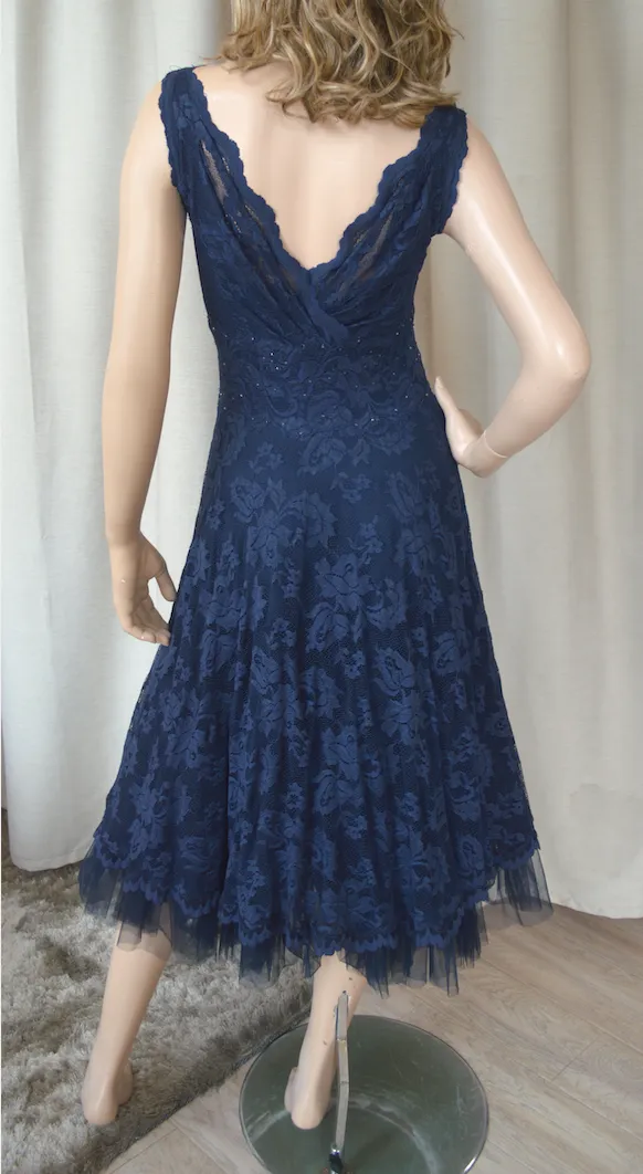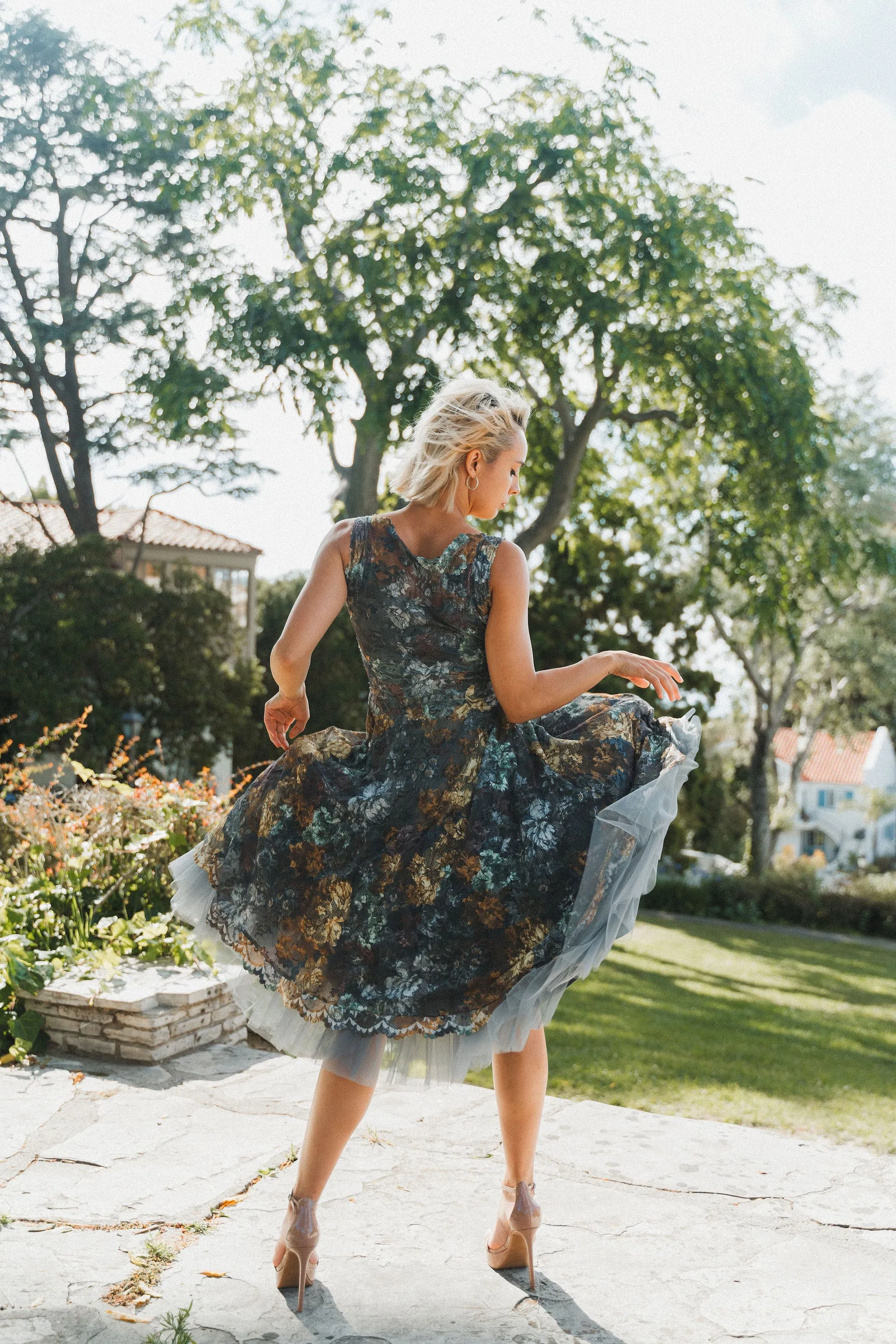 Lace Grace Kelly Dress. This is What I Call A Dream Dress! The Fit Is Outstanding, Regardless Of Size Or Body Type. Fitted On Bodice Area, Then Gradually Has Different Layers Of Tulle Under, That Go From Higher To Lower, Which Avoids Adding Volume To The Skirt, But Instead It has Just Enough Weight and Volume to Have it Perform Beautifully As You Walk, Stroll, Dance Or Just Stand. This is a Timeless, Magical, Gorgeous Dress! It's a Blend Of Sophisticated, Playful, Ultra Feminine, Yet Not Girly. Perfect For... Well... Whatever you want really, from a Nice Dinner, to a Cocktail Party, Even Black Tie Event, The Opera, Garden Weddings, Fundraising Events, Etc. You Will Turn Heads Wearing This Dress, But People Will Love You. It is also reversible!Turn the dress around, and you are left with an elegant neckline in the front and a deep v in the back.