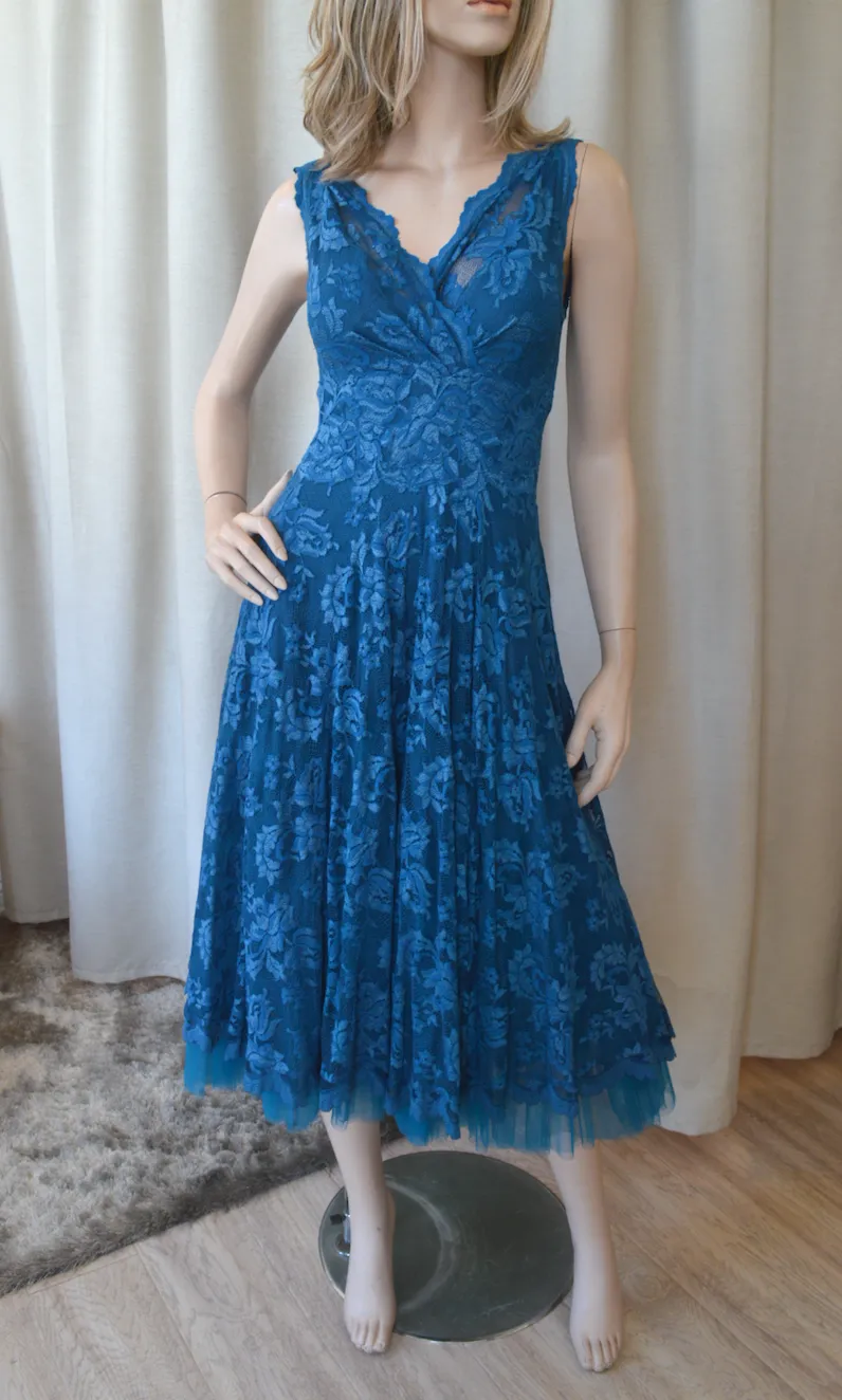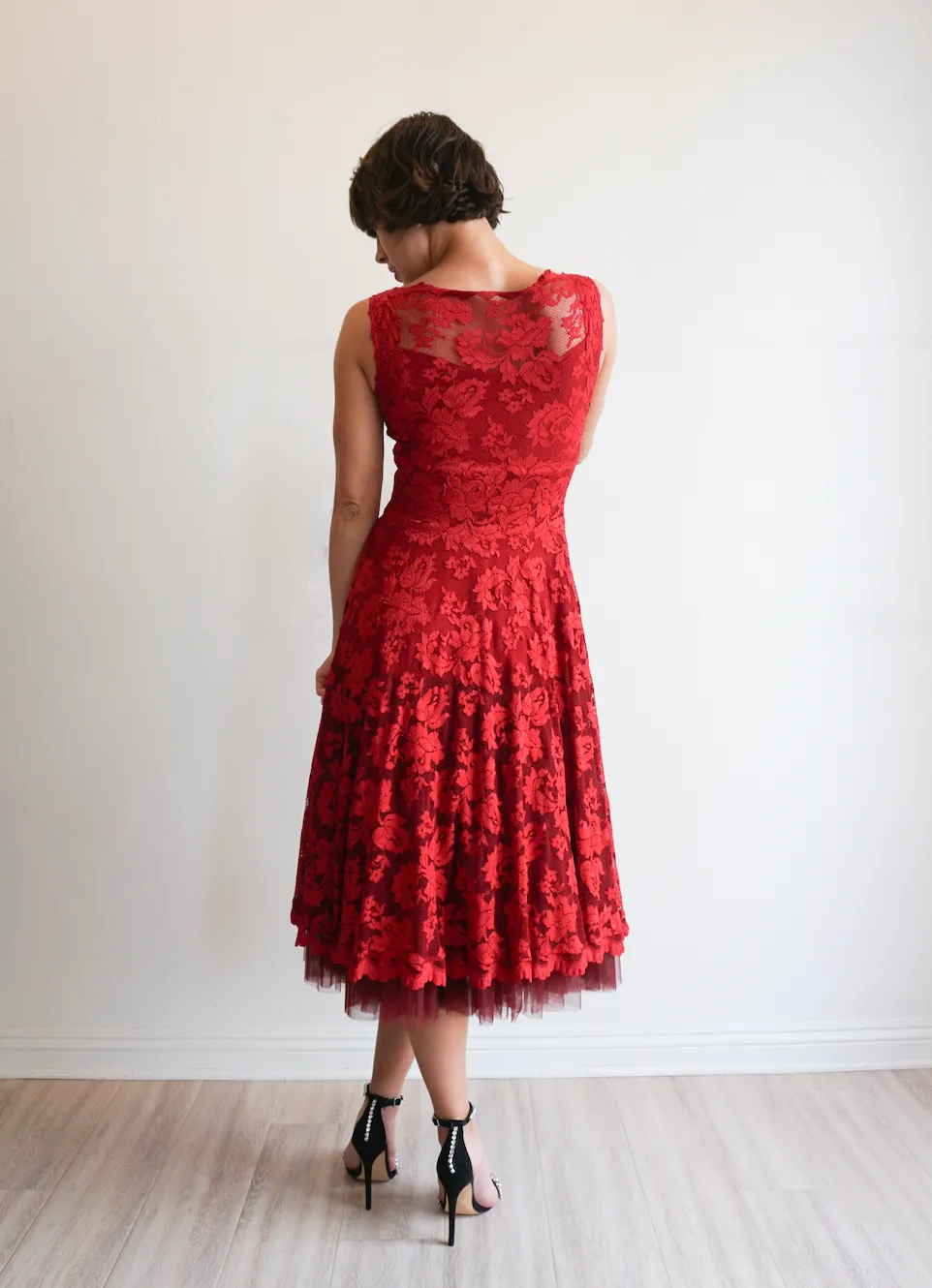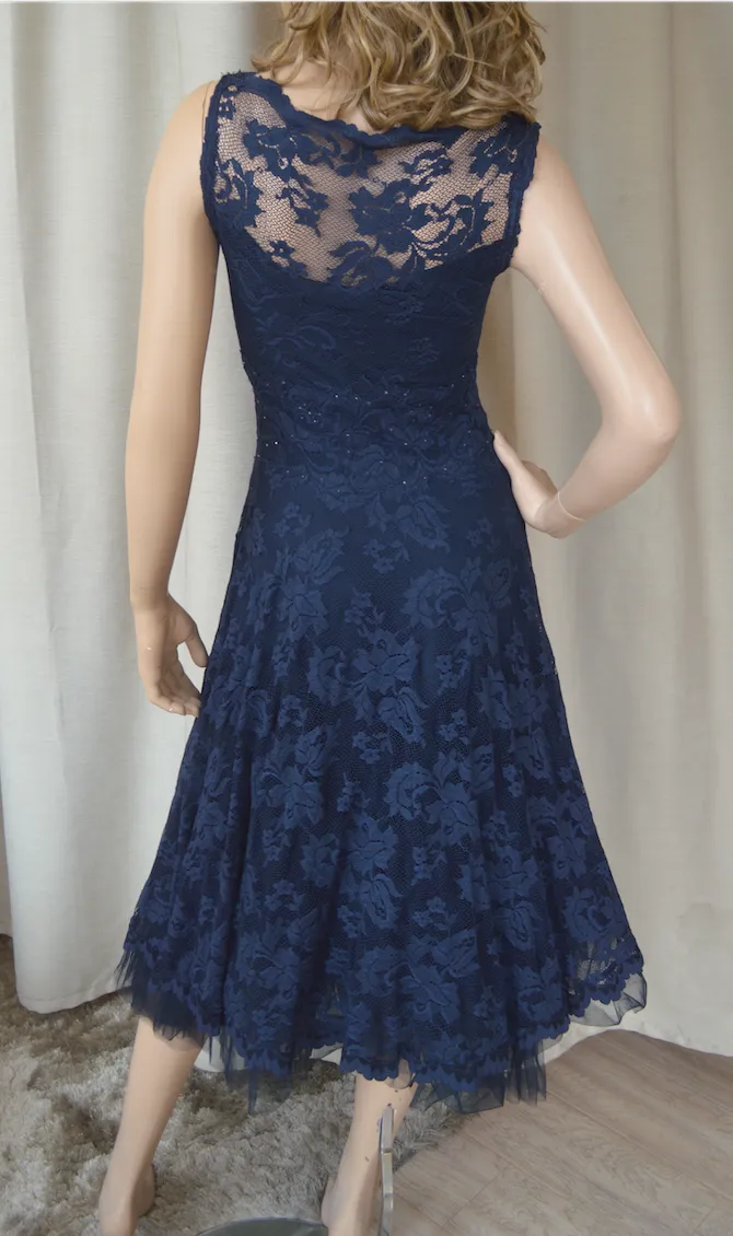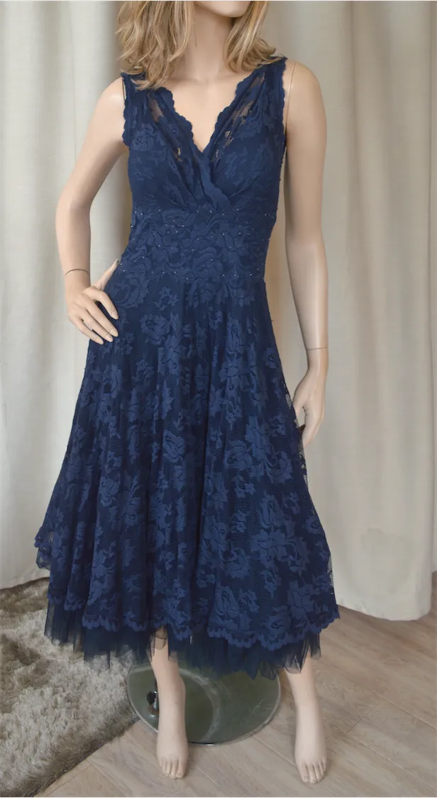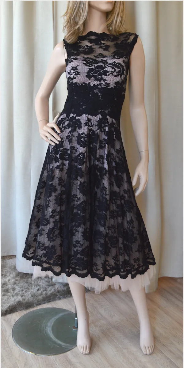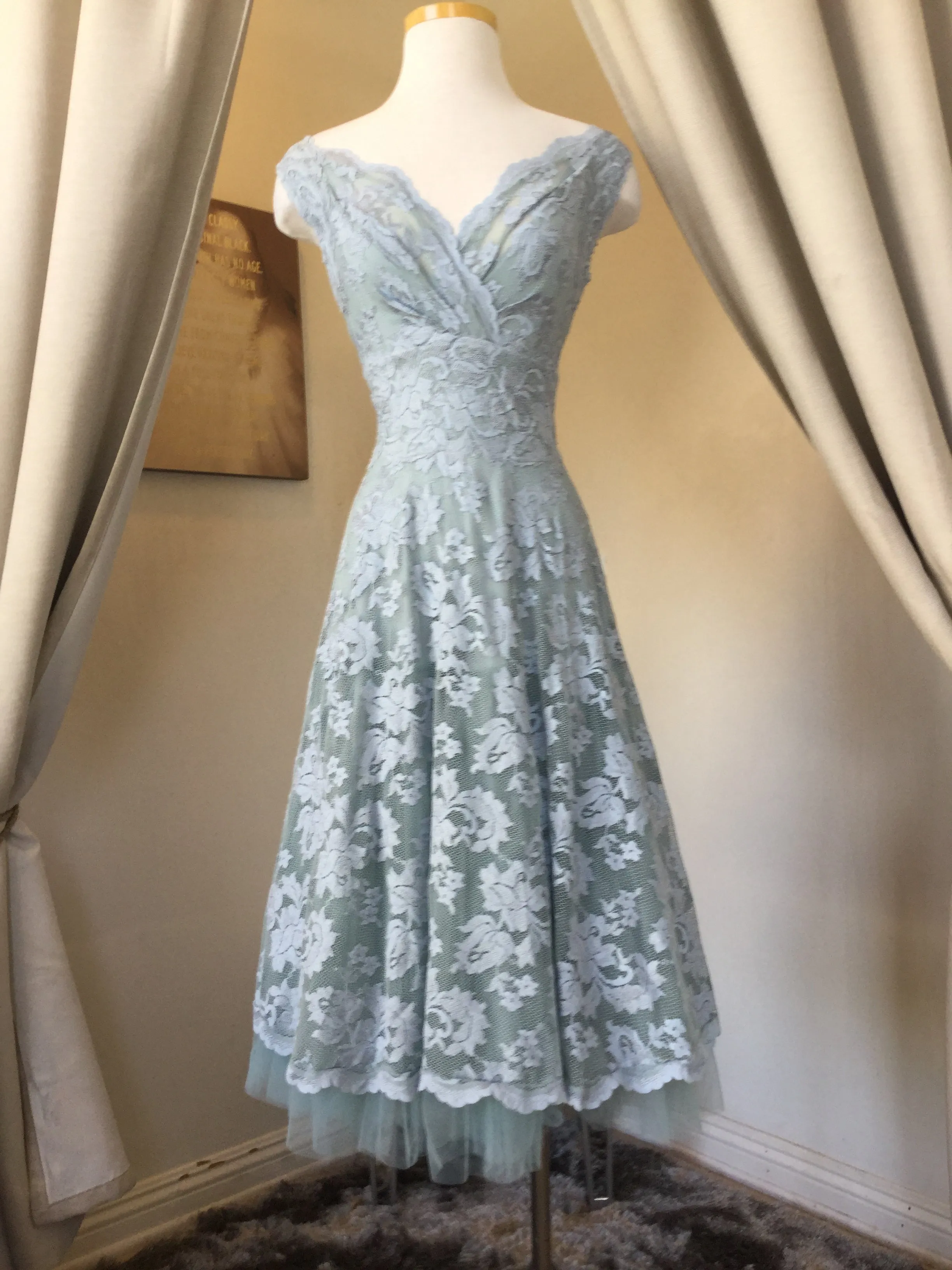 Lace Grace Kelly Dress. This is What I Call A Dream Dress! The Fit Is Outstanding, Regardless Of Size Or Body Type. Fitted On Bodice Area, Then Gradually Has Different Layers Of Tulle Under, That Go From Higher To Lower, Which Avoids Adding Volume To The Skirt, But Instead It has Just Enough Weight and Volume to Have it Perform Beautifully As You Walk, Stroll, Dance Or Just Stand. This is a Timeless, Magical, Gorgeous Dress! It's a Blend Of Sophisticated, Playful, Ultra Feminine, Yet Not Girly. Perfect For... Well... Whatever you want really, from a Nice Dinner, to a Cocktail Party, Even Black Tie Event, The Opera, Garden Weddings, Fundraising Events, Etc. You Will Turn Heads Wearing This Dress, But People Will Love You. It is also reversible!Turn the dress around, and you are left with an elegant neckline in the front and a deep v in the back.