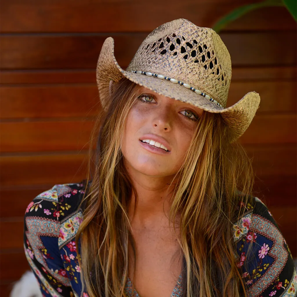 This Pearl Western cowgirl Raffia Hat is a must-have for any country-style wardrobe. It features a classic western style, a vented crown for breathability and is crafted with high-quality raffia material. Perfect for any outdoor occasion. Has a shapeable brim.