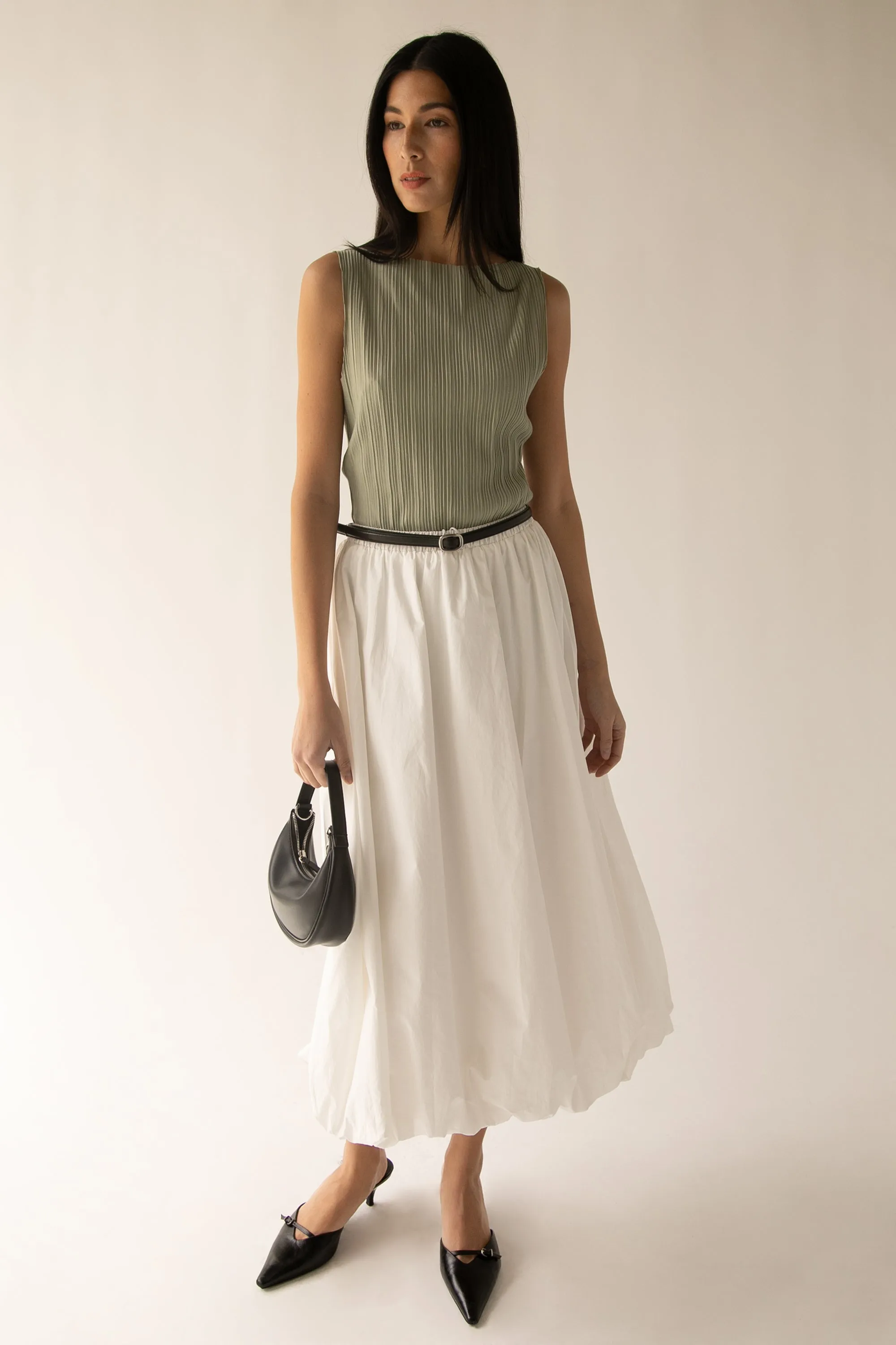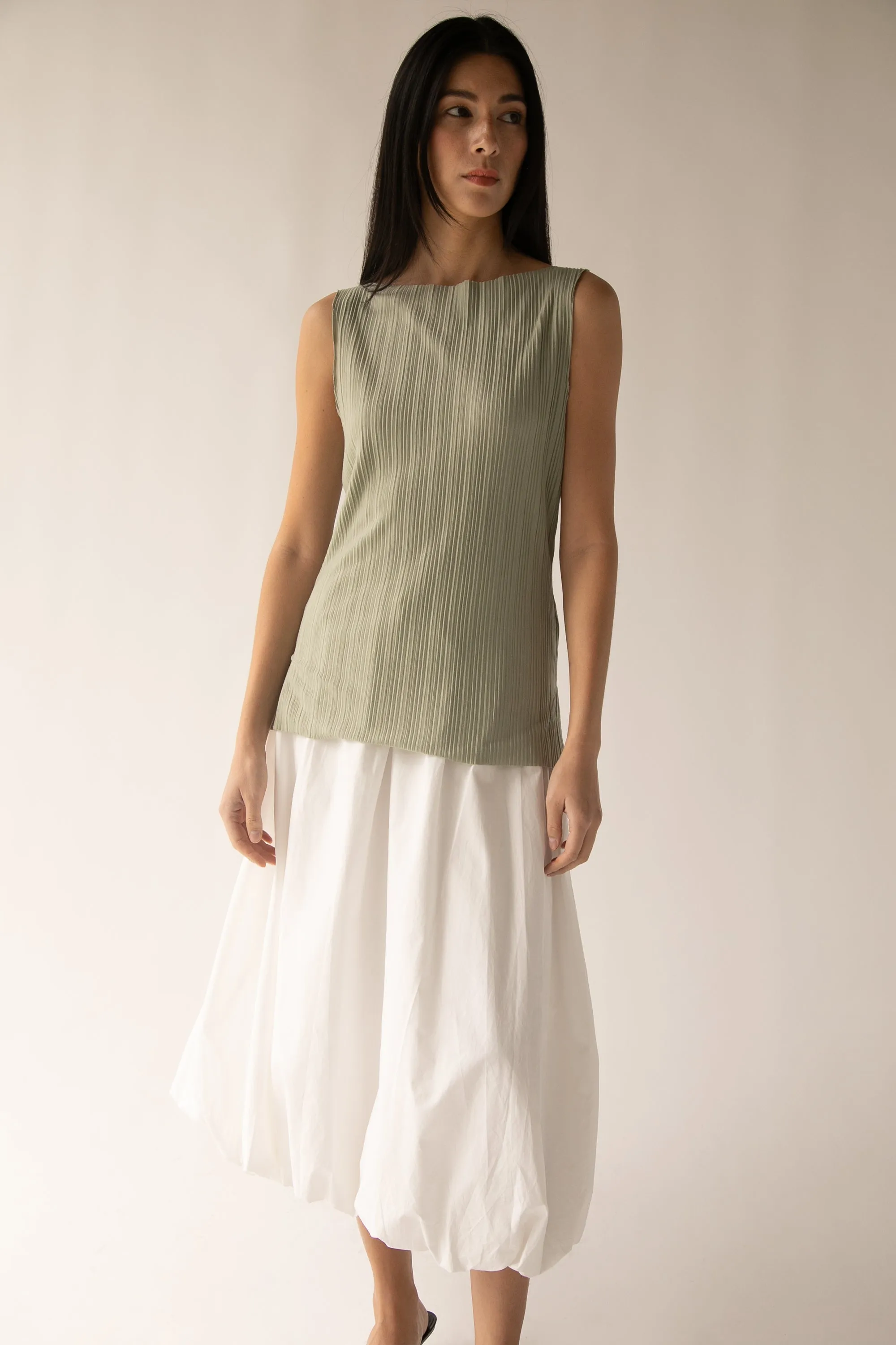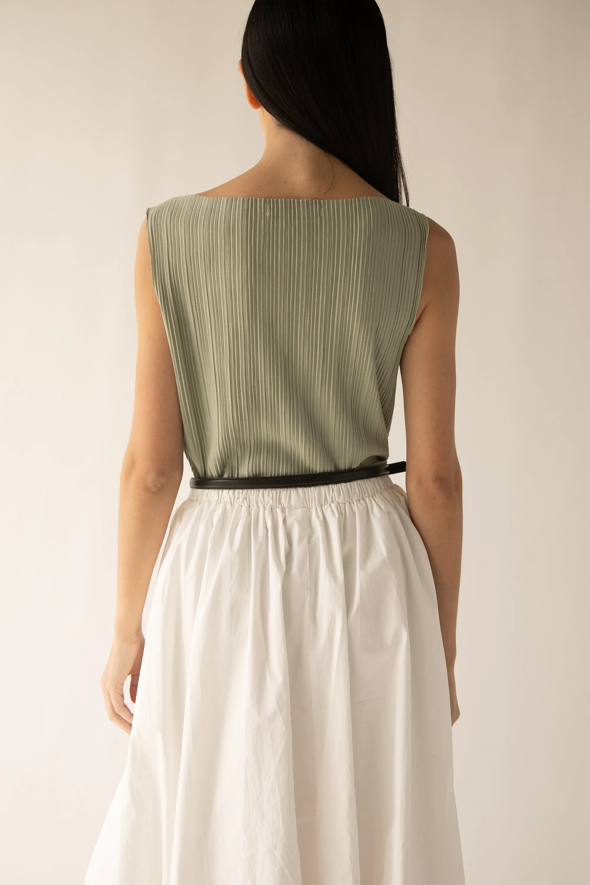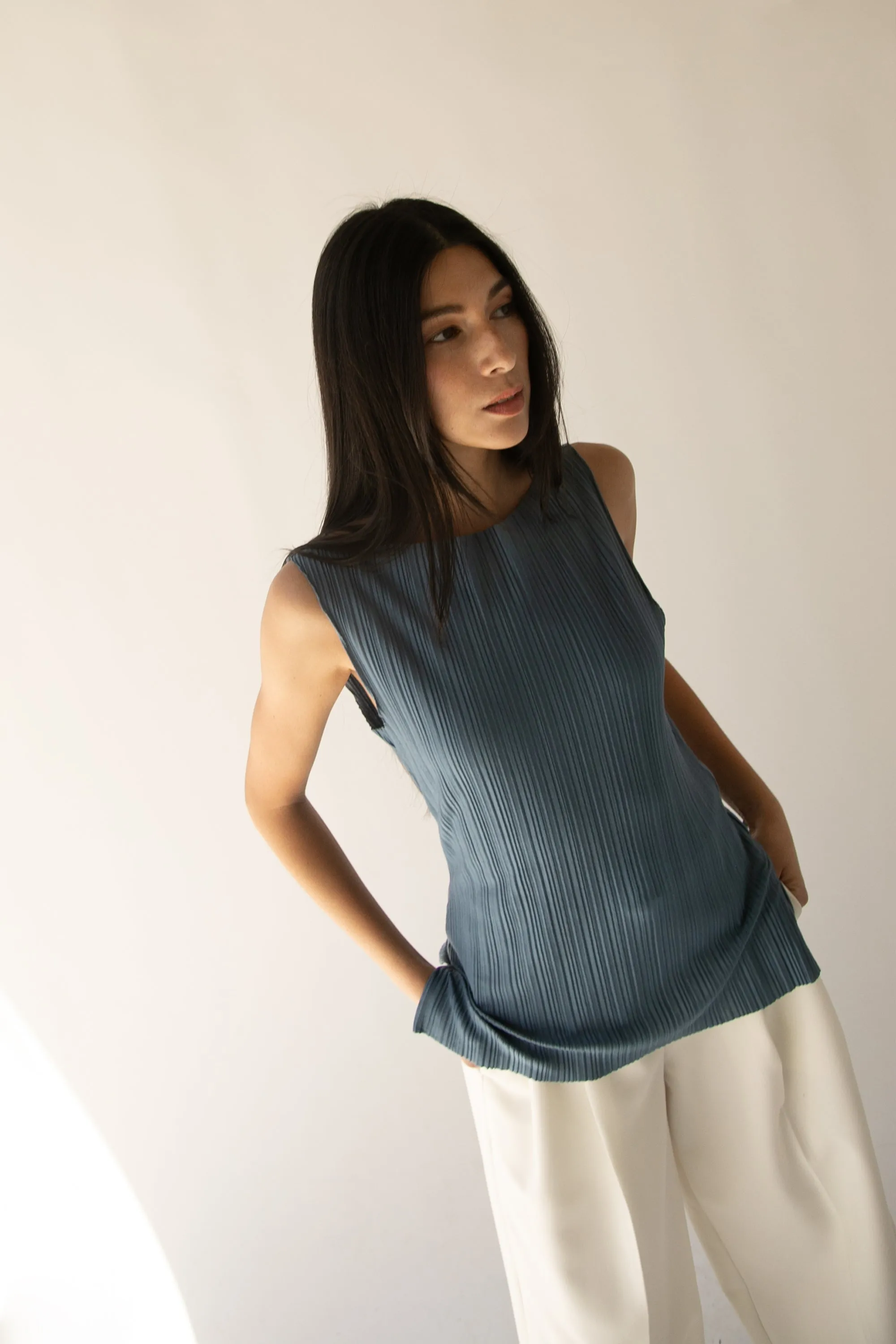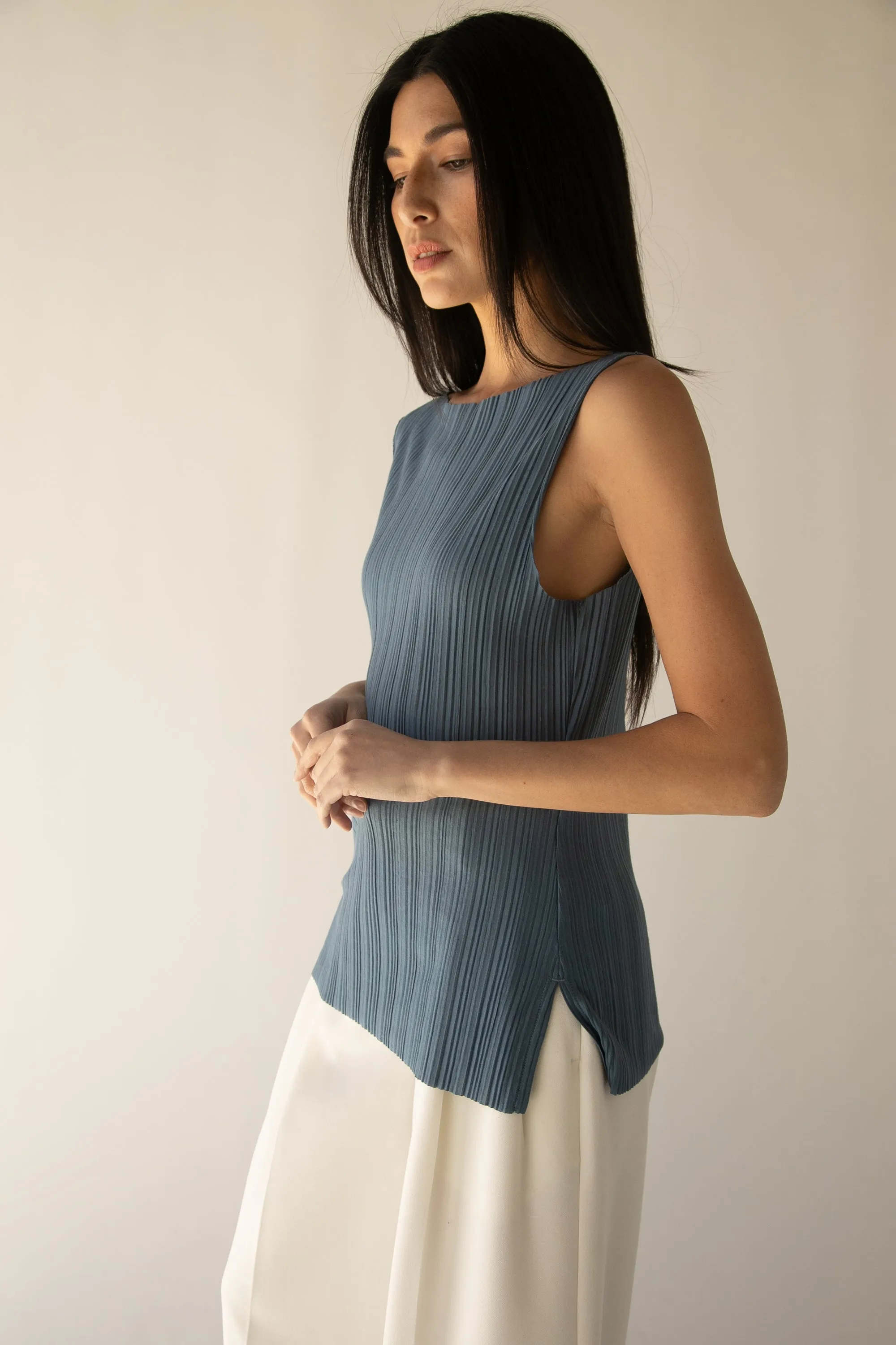 This pleated tank top is made in a relaxed fit with a high neckline. A summer style to wear this season with matching pleated pants or you can pair it with a satin slip skirt.