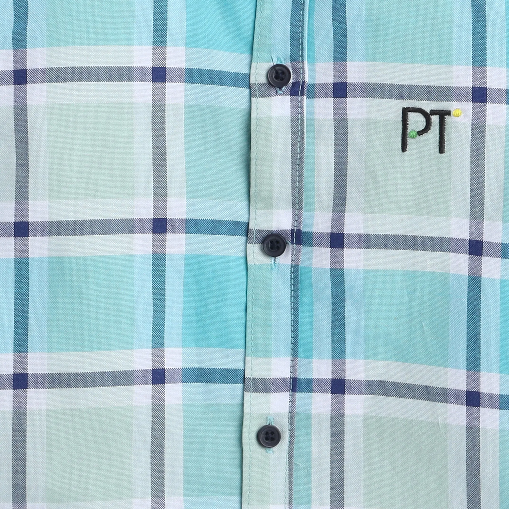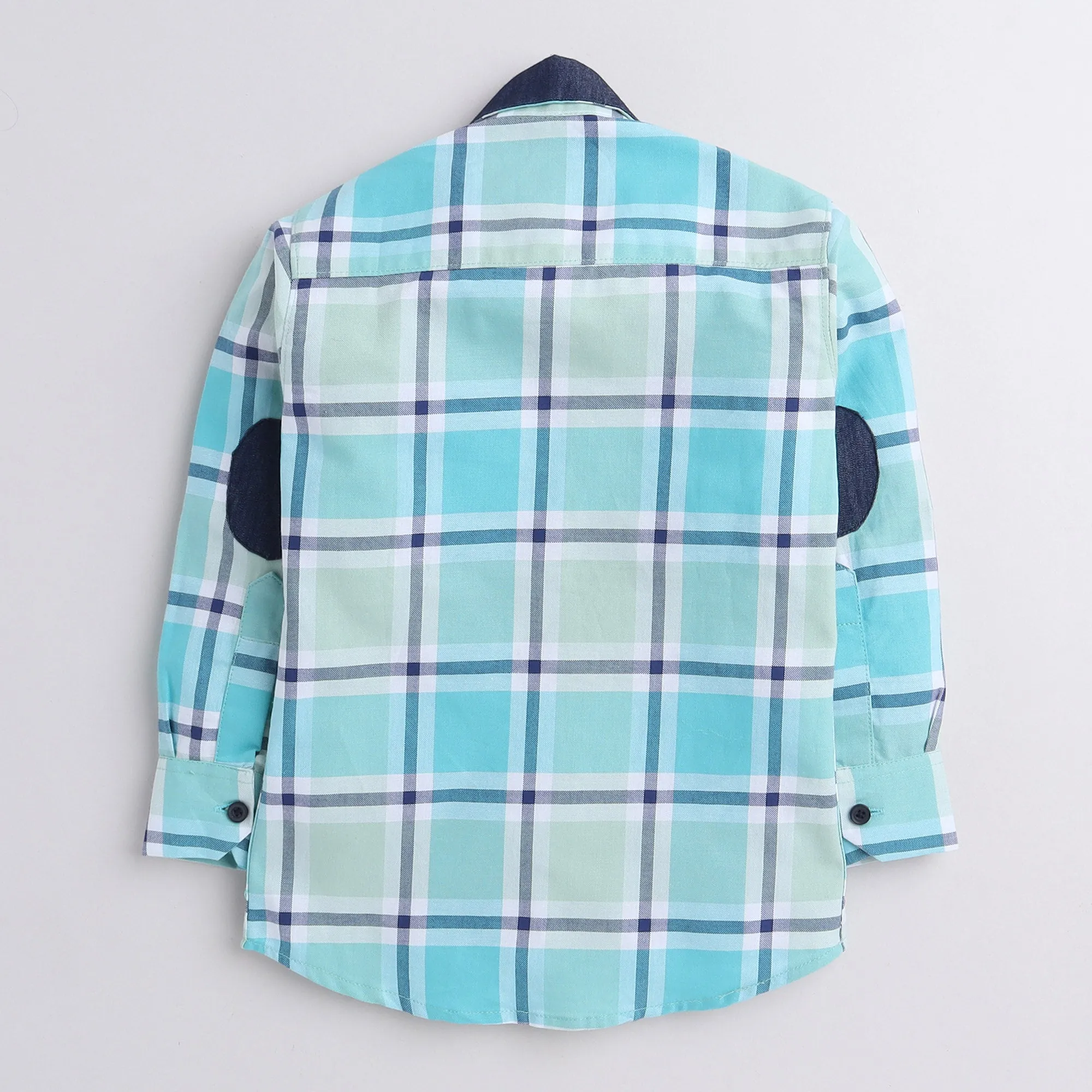 Polka Tots full sleeves checks shirt with denim collar denim elbow patch - Blue