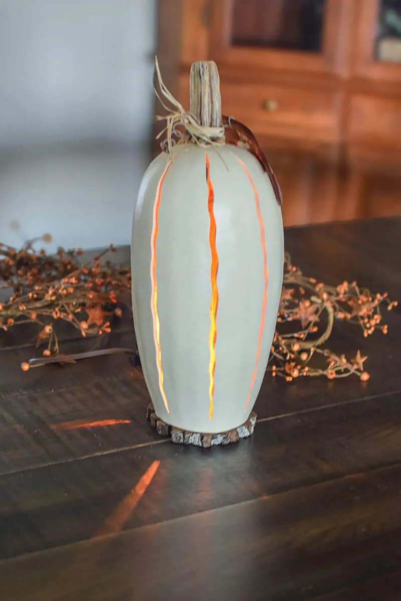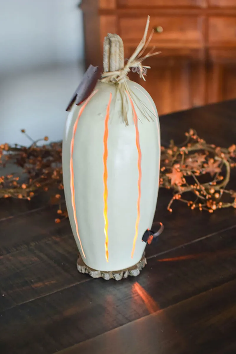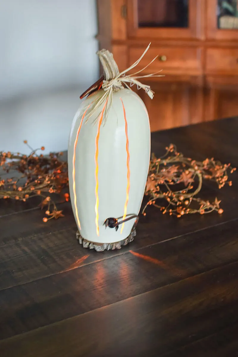 This Pumpkin Luminary gourd is hand-painted white in color and sits on a wood biscuit base. This classic design is a great fall decoration that you can leave out all season long and will last for years to come. It comes with an electric light. The luminary also has a unique pumpkin stem with raffia and an orange gourd leaf. The pumpkin stem is a natural product and will vary in size and style on each piece. Approximately 15” tall.