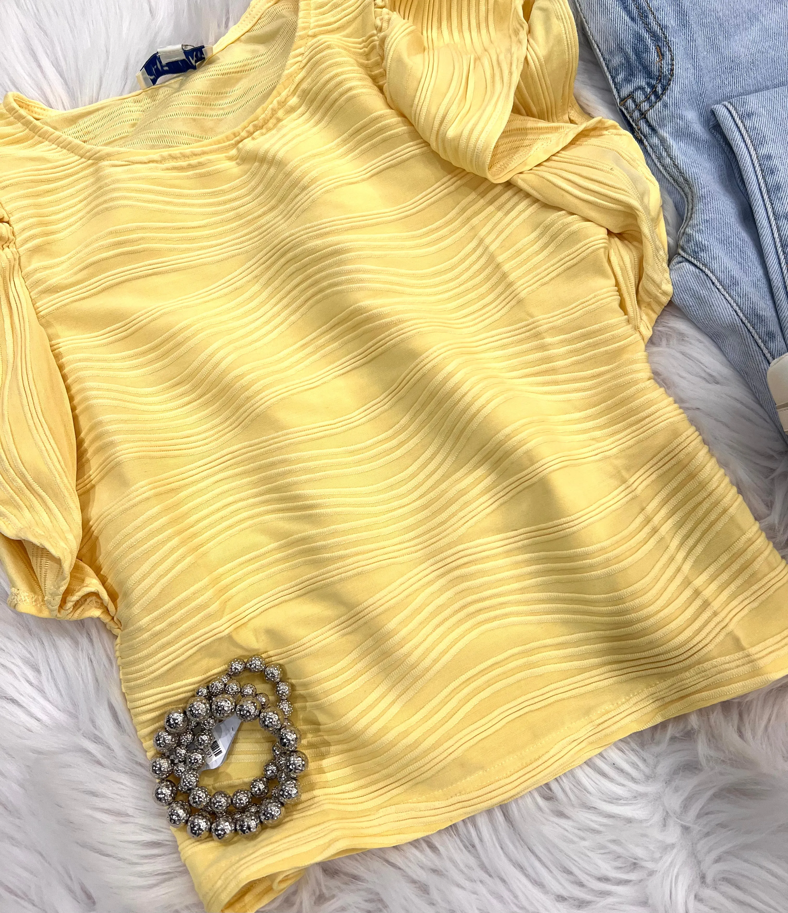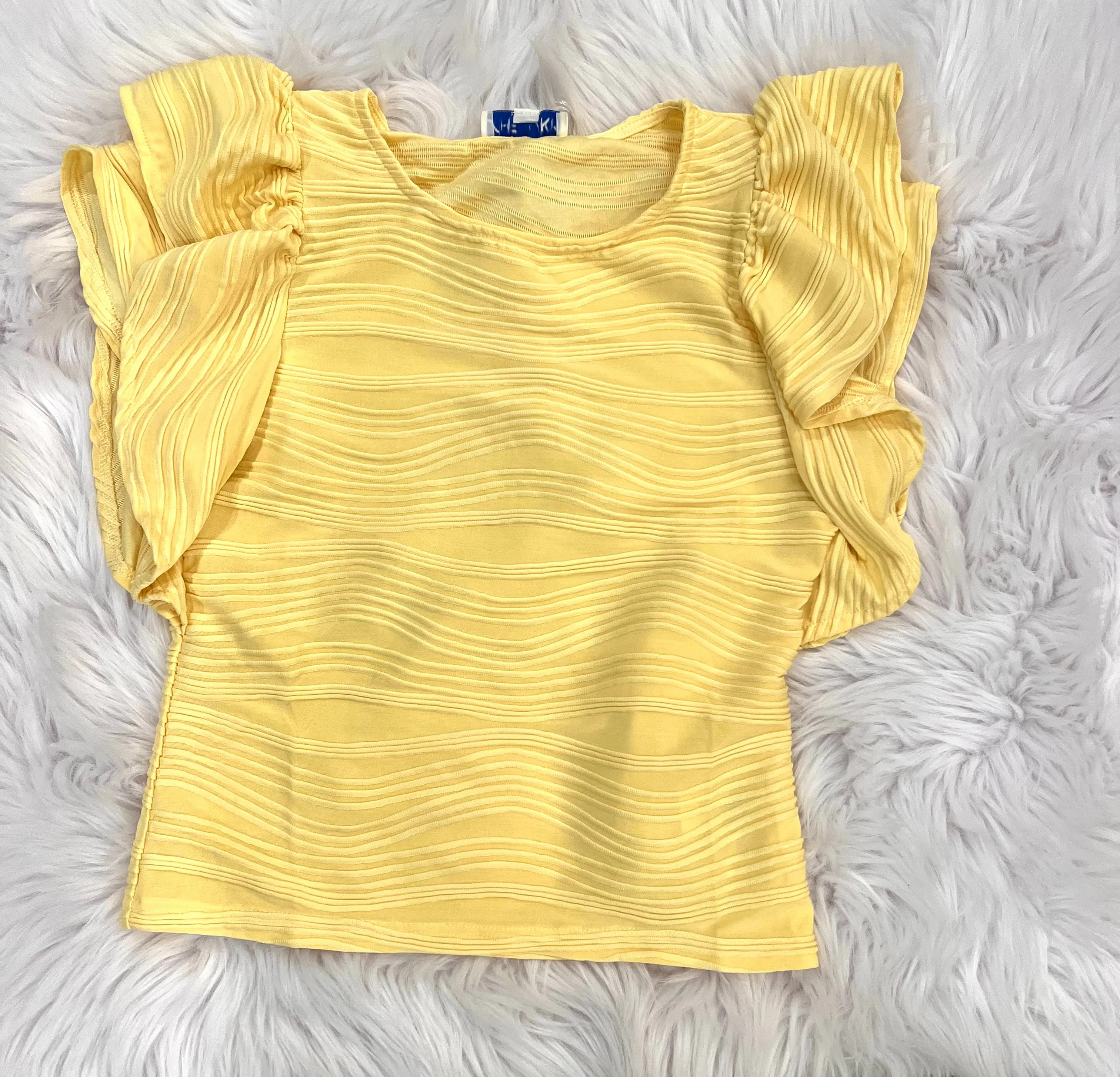 Get ready for some fun with our slightly fitted textured knit top! Not only does it hug your curves in all the right places, but the ruffled sleeve adds a touch of playful flair. This top is perfect for adding a little extra charm to your wardrobe.
