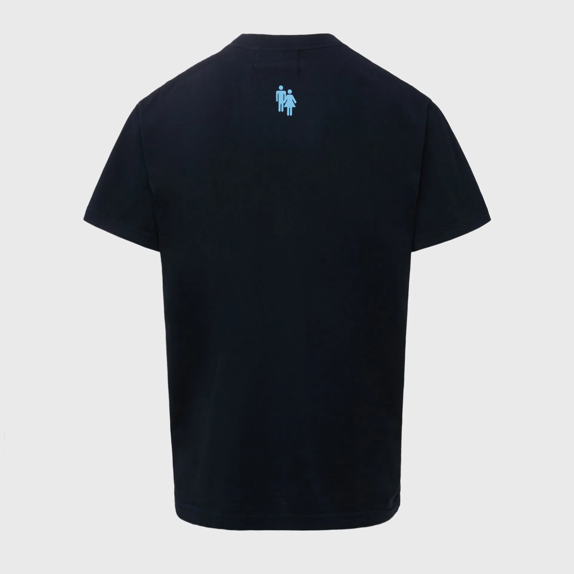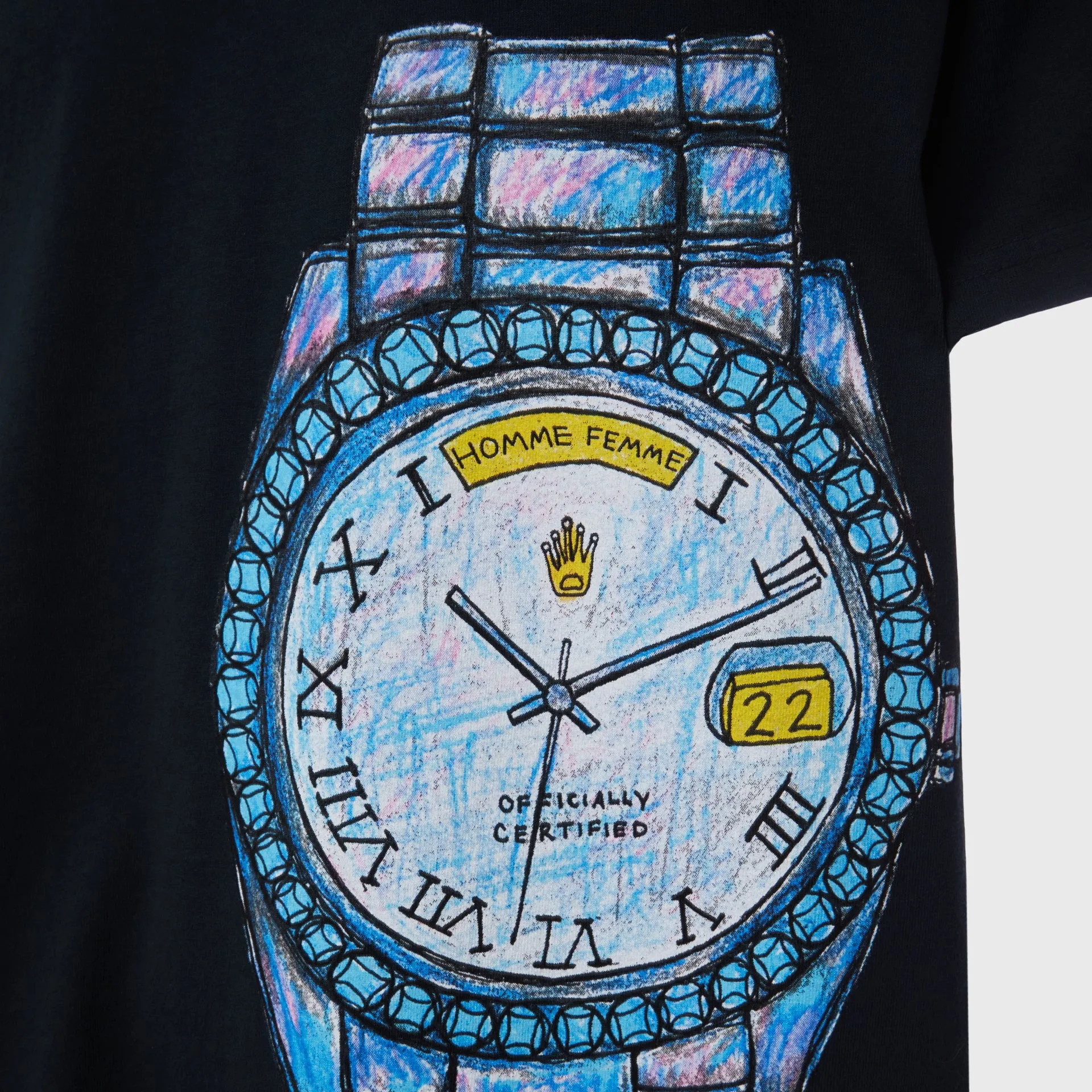 Light weight cotton short sleeve tee in black with matching color rib knit crew collar. Branded "Presidential" doodle print at wearer's left front. Blue branded logo at back neckline.