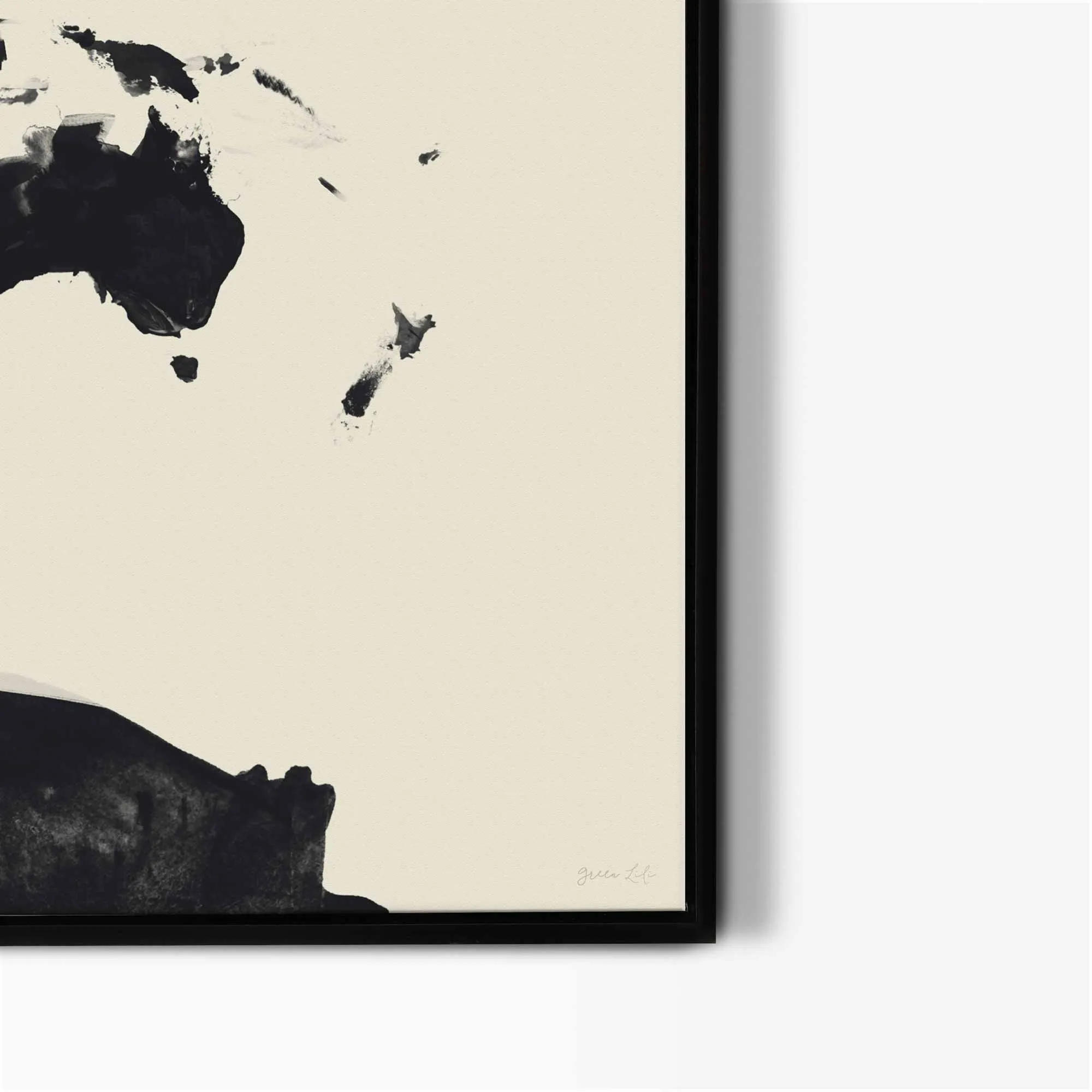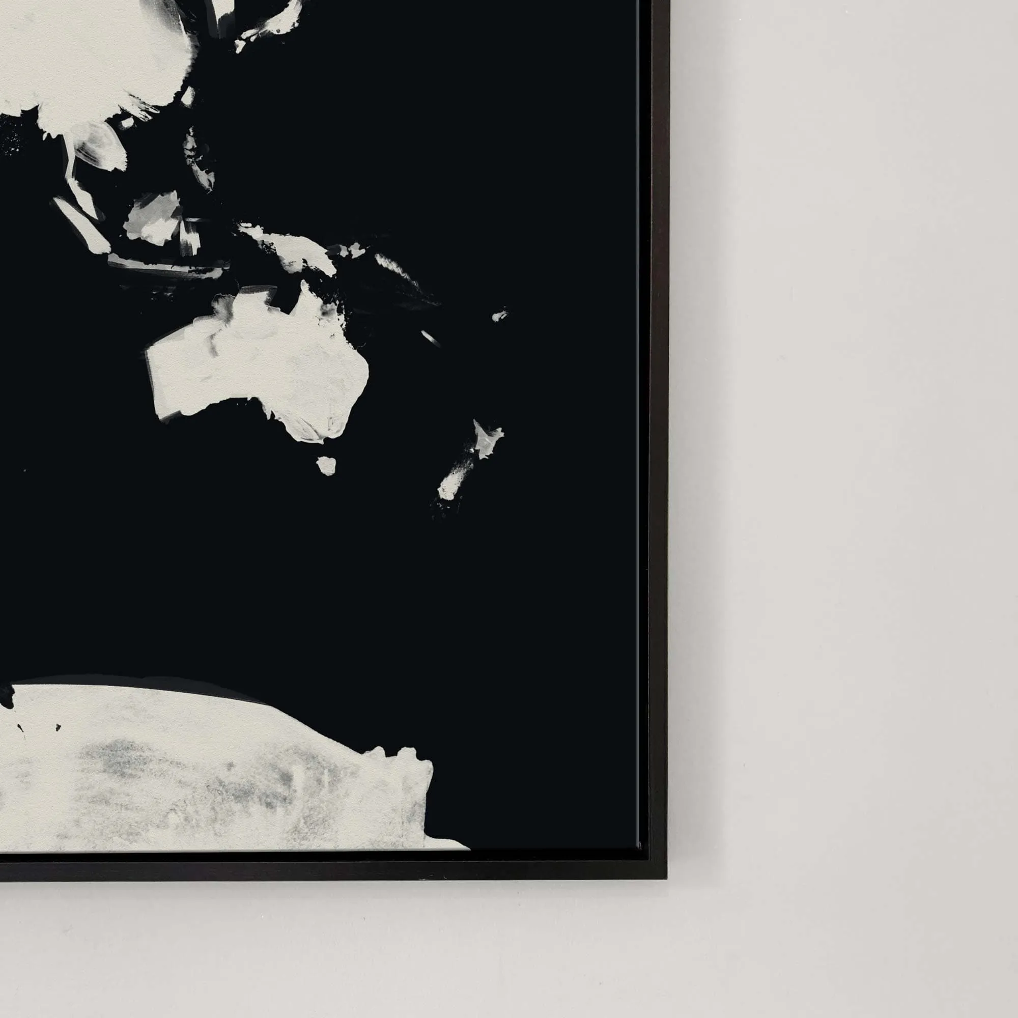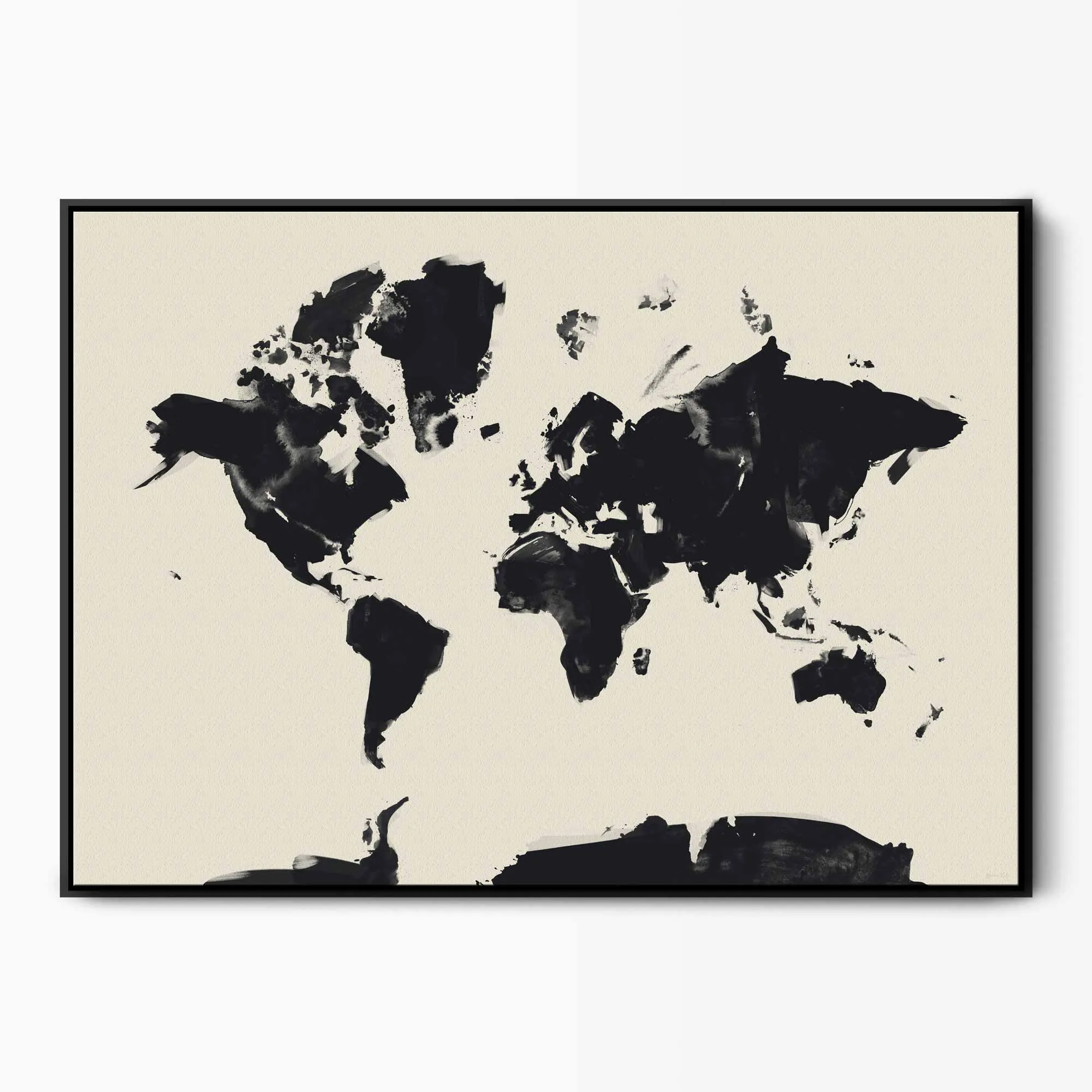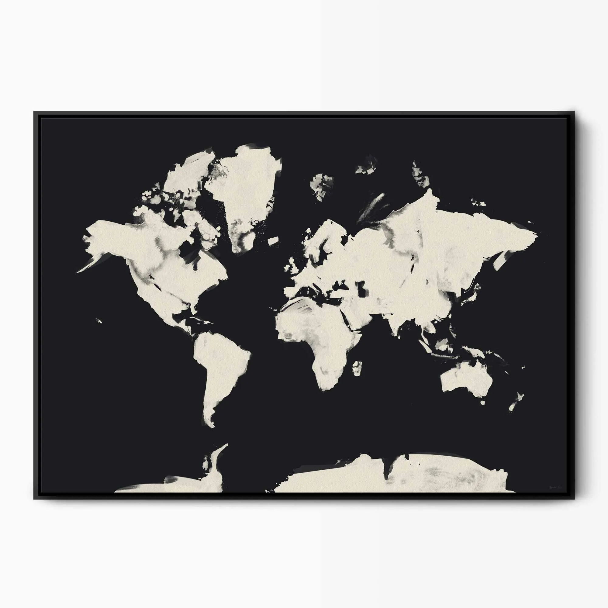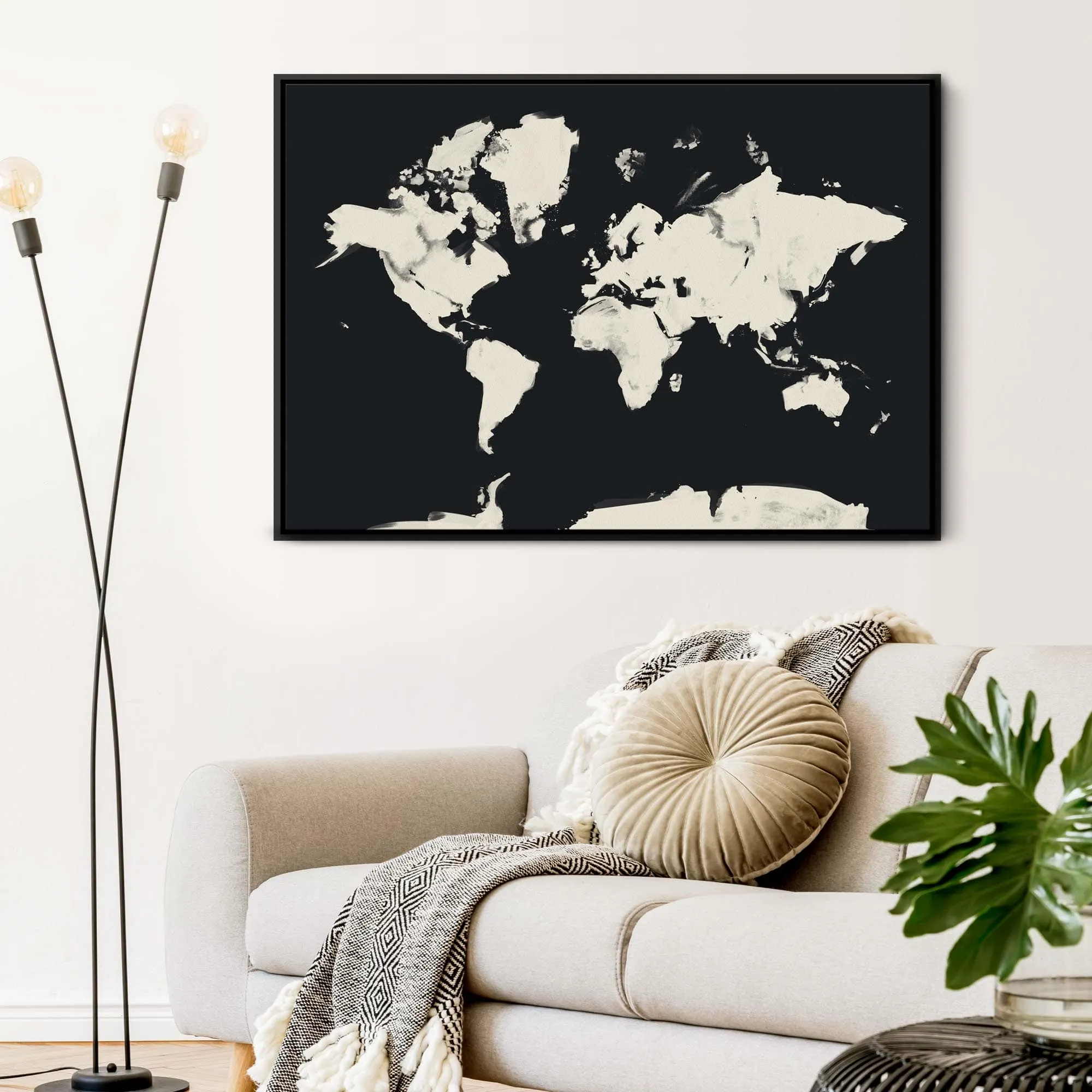 Dream of your next vacation with our oversized abstract world map framed canvas painted in two colour options: black on a neutral cream background and cream on black. This simple travel art is great for a minimalist interior and hanging over a bed or sofa. Also available as a .