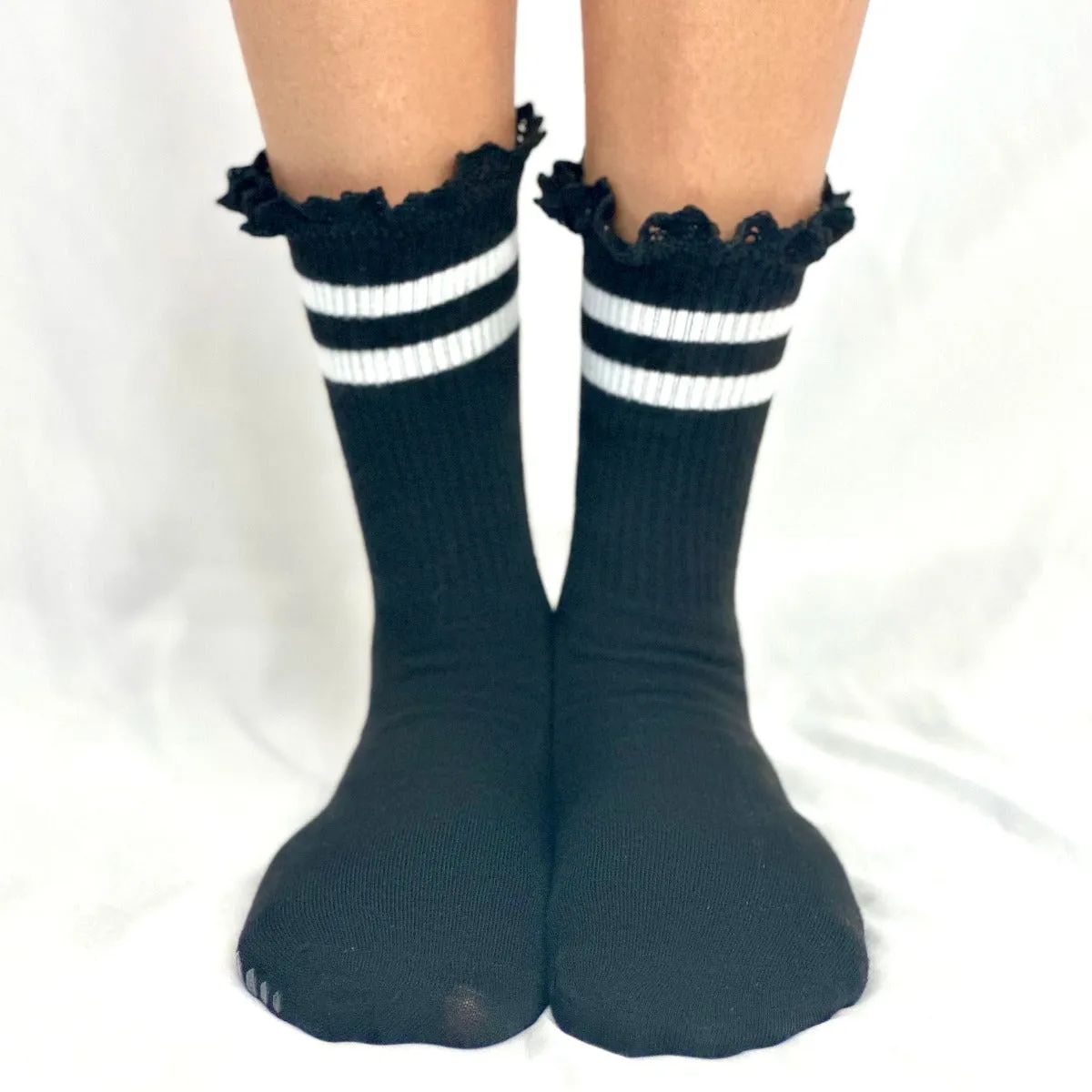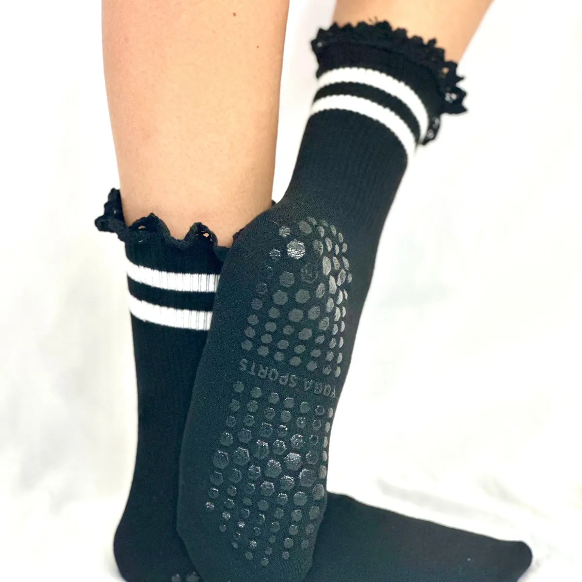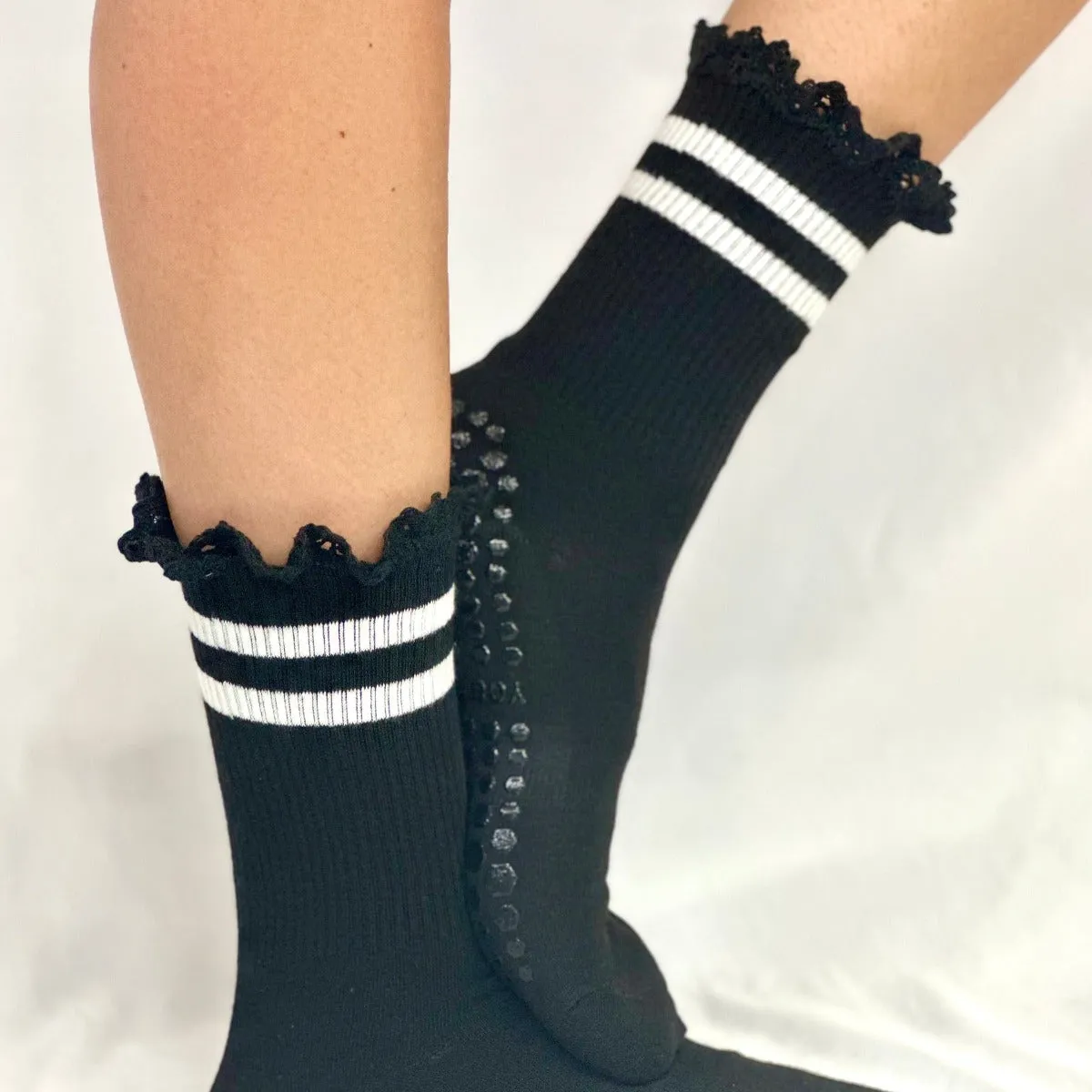 Upgrade your style with the Black YOGA Stripe Grip Crew Socks, where chic design meets top-notch performance. These trendy crew socks showcase a striking, all-black hue that easily complements any look, making them the ideal pick for both exercising and everyday wear. Created with an emphasis on comfort and function, our striped grip socks boast innovative grip technology on the soles for unmatched traction and balance.
